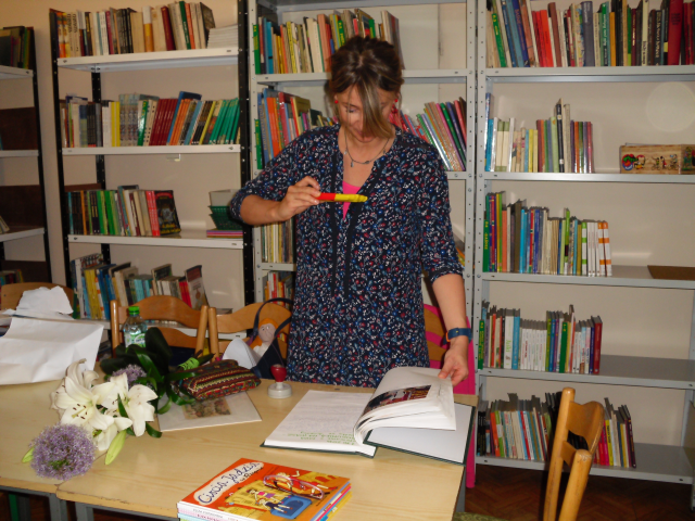 Autorka przedstawiała swoje kolejne książki aktywizując uczniów do czynnego uczestnictwa w spotkaniu. Z udziałem dzieci dokładnie omówiona została treść książki „Ciocia Jadzia. Tęcza.” Obecnie autorka mieszka w Brazylii i stąd kolejna książka „Ciocia Jadzia w Rio”. Kolorowe i niesamowicie dynamiczne ilustracje są także autorstwa Pani Elizy.