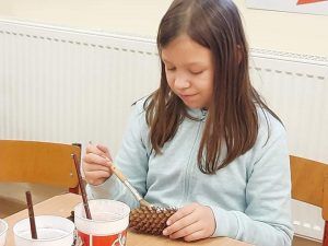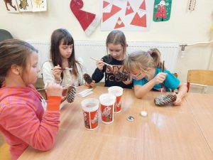 Dekorujemy naszą salę- kasztanowe ludziki mają już swoje mikołajkowe czapeczki, pomalowaliśmy i ozdobiliśmy szyszki, które pozbieraliśmy przed szkołą.