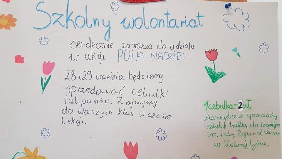 28 i 29 września szkolni wolontariusze zaprosili wszystkich uczniów do udziału w akcji Pola Nadziei,  organizowanej przez Hospicjum im. Lady Ryder of Warsaw w Zielonej Górze.   Tym razem sprzedawali cebulki tulipanów. Zarobione pieniądze (333 zł) przesłali na konto hospicjum.