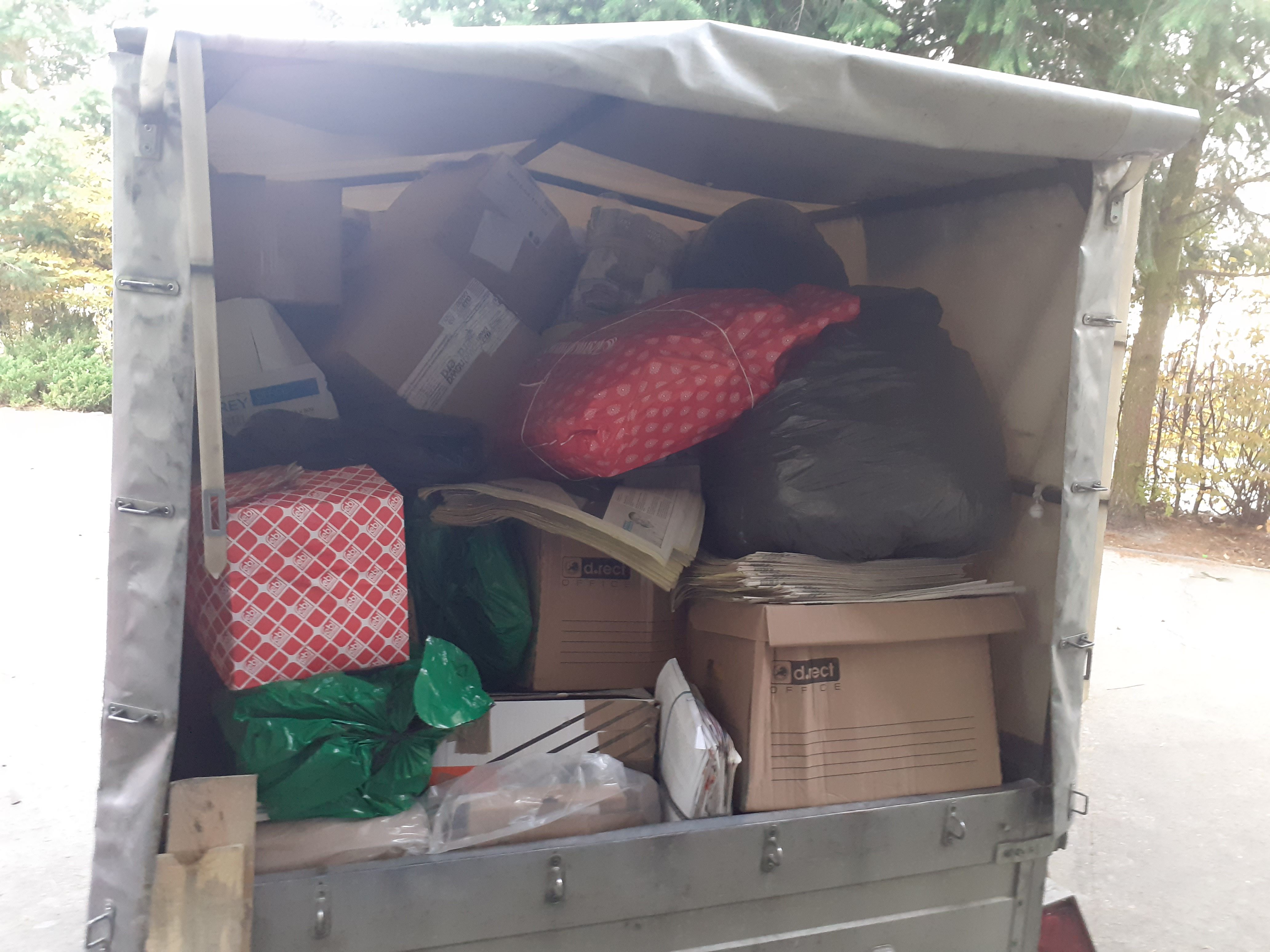 Grupa wolontariuszy nosząca makulaturęPrzyczepa załadowana makulaturą
