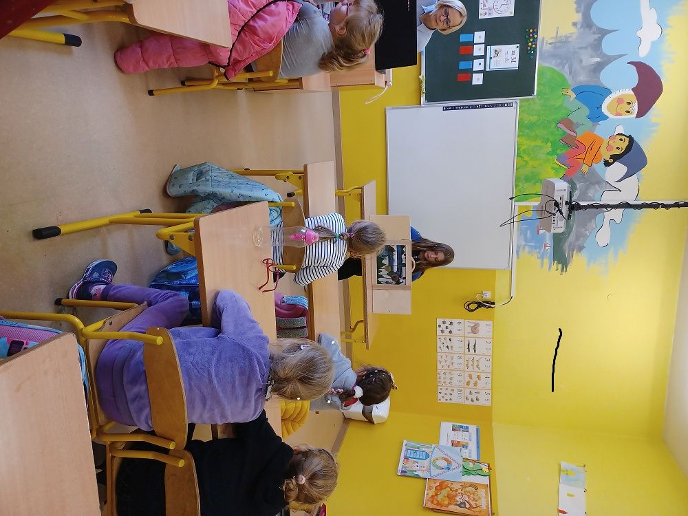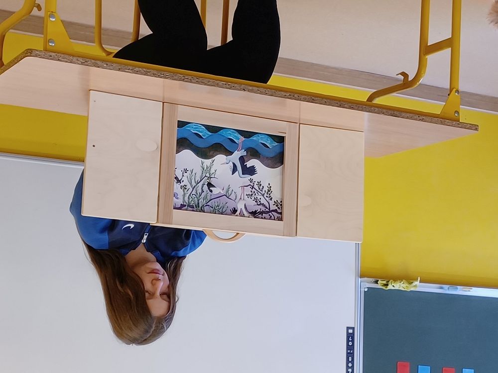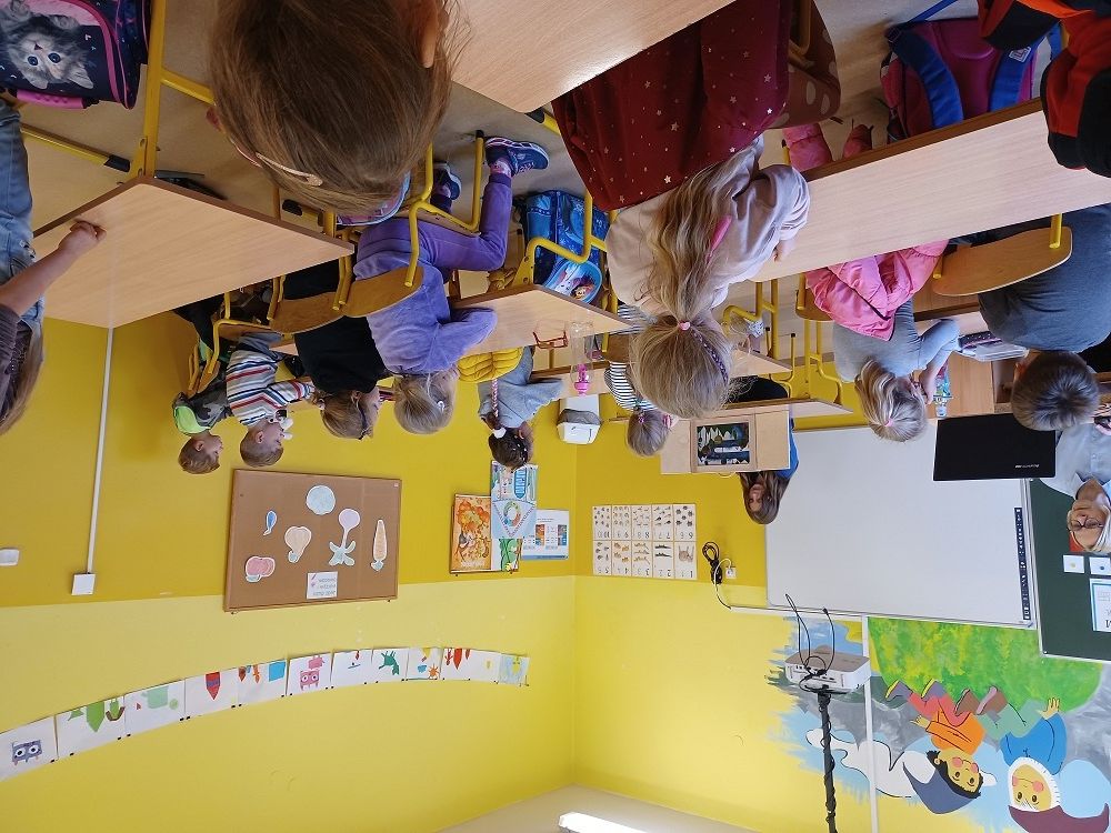 Trzecie czytanie pod chmurką odbyło się w klasie pierwszej. Było to nietypowe spotkanie za sprawą magicznego drewnianego teatrzyku kamishibai. Jest to technika opowiadania wywodząca się z Japonii. Wykorzystane są w niej plansze z obrazkami i tekstem oraz drewniana skrzynka (butai), w której przedstawiane są kolejne fragmenty historii, bajki, opowiadania. Tę sztukę posiadła bardzo dobrze Wiktoria Krzemieniec, która opowiedziała pierwszakom piękną „Bajkę o Wiśle” z tekstem Magdaleny Zarębskiej i obrazkami Katarzyny Szopy. Dzieci były bardzo zainteresowane taką forma opowieści. Zdobyły wiele informacji na temat największej polskiej rzeki.