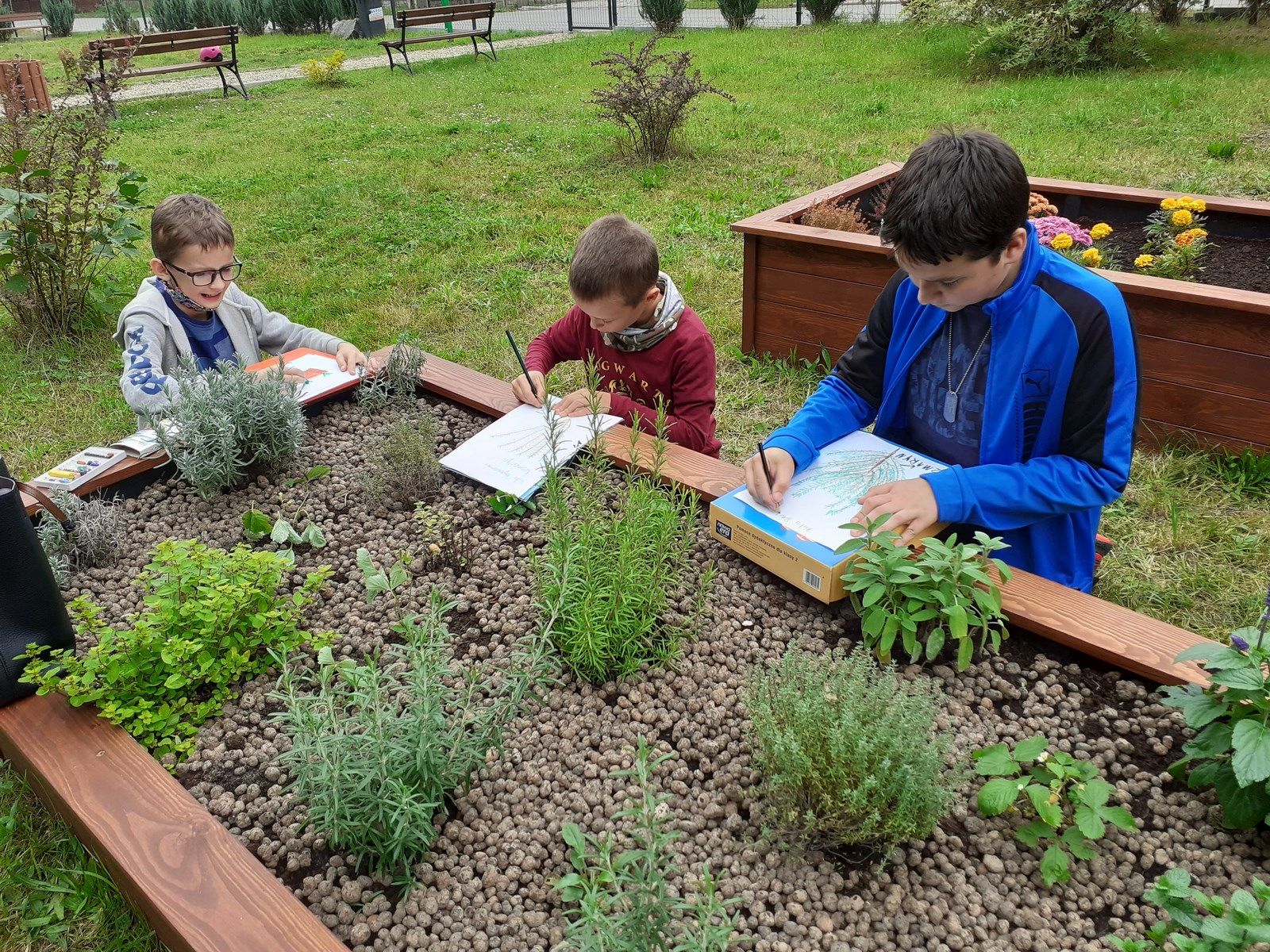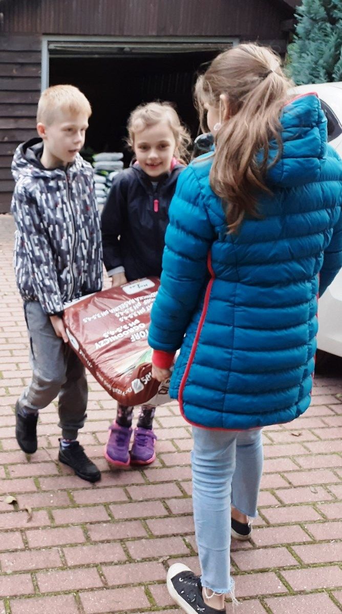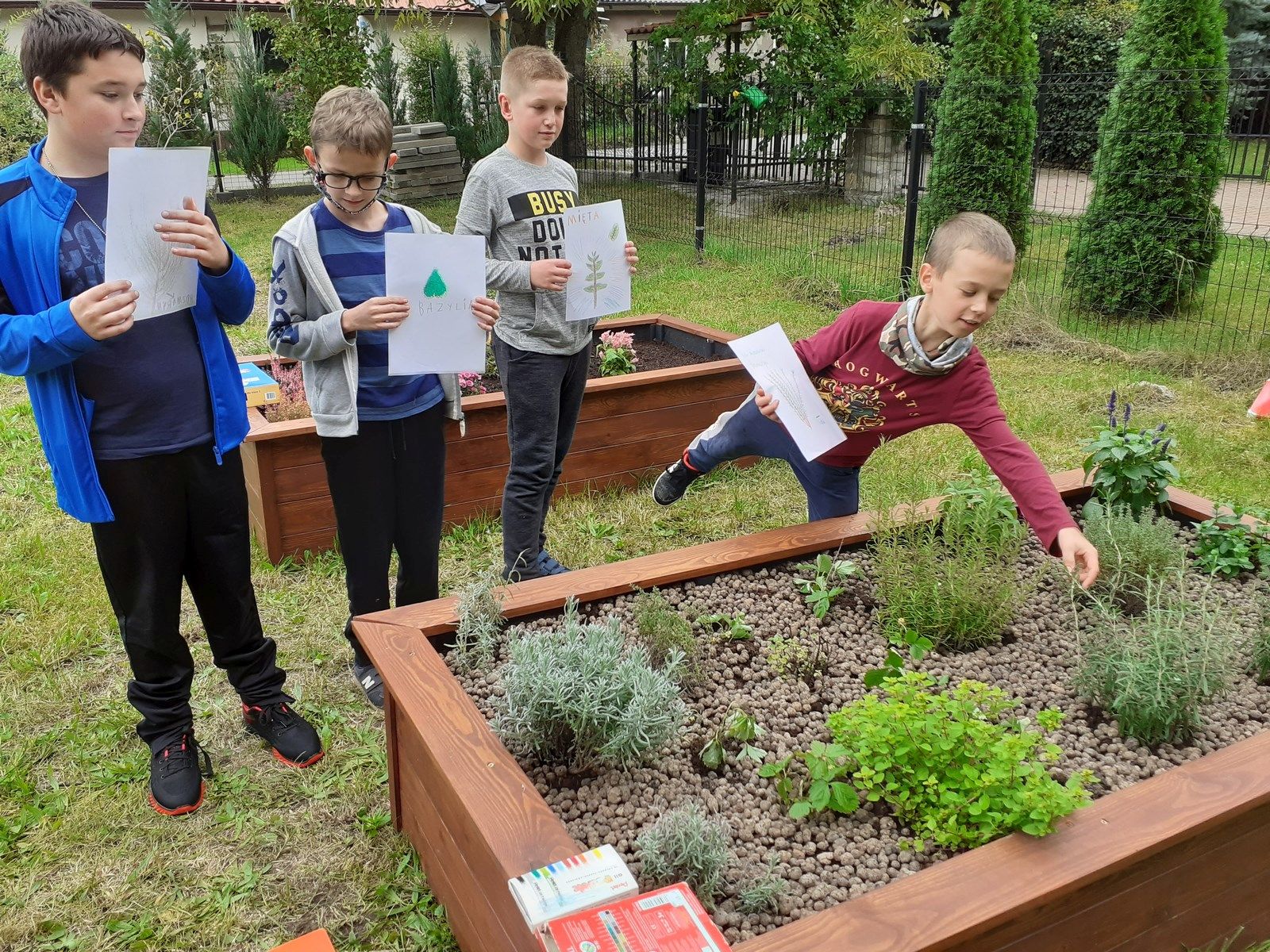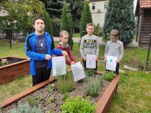 Piękna tęcza towarzyszyła nam podczas kolejnych prac przy zakładaniu eko ogródka. Na placu zabaw „Nad strumieniem” spotkaliśmy się z Paniami z Kiwanisu, żeby postawić skrzynię ogrodniczą , która na wiosnę zamieni się w mini szklarnię. Bardzo przydała się nam znajomość języka niemieckiego, ponieważ instrukcja skręcania była właśnie w tym języku. O przetłumaczenie trudniejszych zwrotów prosiliśmy Panią Basię – wykładowcę języka niemieckiego na Uniwersytecie Zielonogórskim. Pięknie współpracowaliśmy przy przenoszeniu worków z ziemią i torfem. Bartek i Patryk potrafili nawet tańczyć z workami 🙂 . Październik jest dobrym miesiącem na sadzenie roślin cebulowych, dlatego też posadziliśmy w drewnianych grządkach żonkile, przebiśniegi, ozdobne czosnki i krokusy. Pięknie będzie wyglądał nasz ogródek wiosną. Teraz też jest ciekawie. Często przychodzimy oglądać i podlewać nasze roślinki. Niektórzy mogli nawet spróbować naszych pierwszych poziomek. Kuba, Piotrek, Wojtek i Szymon postanowili wzbogacić swoją wiedzę o ziołach.