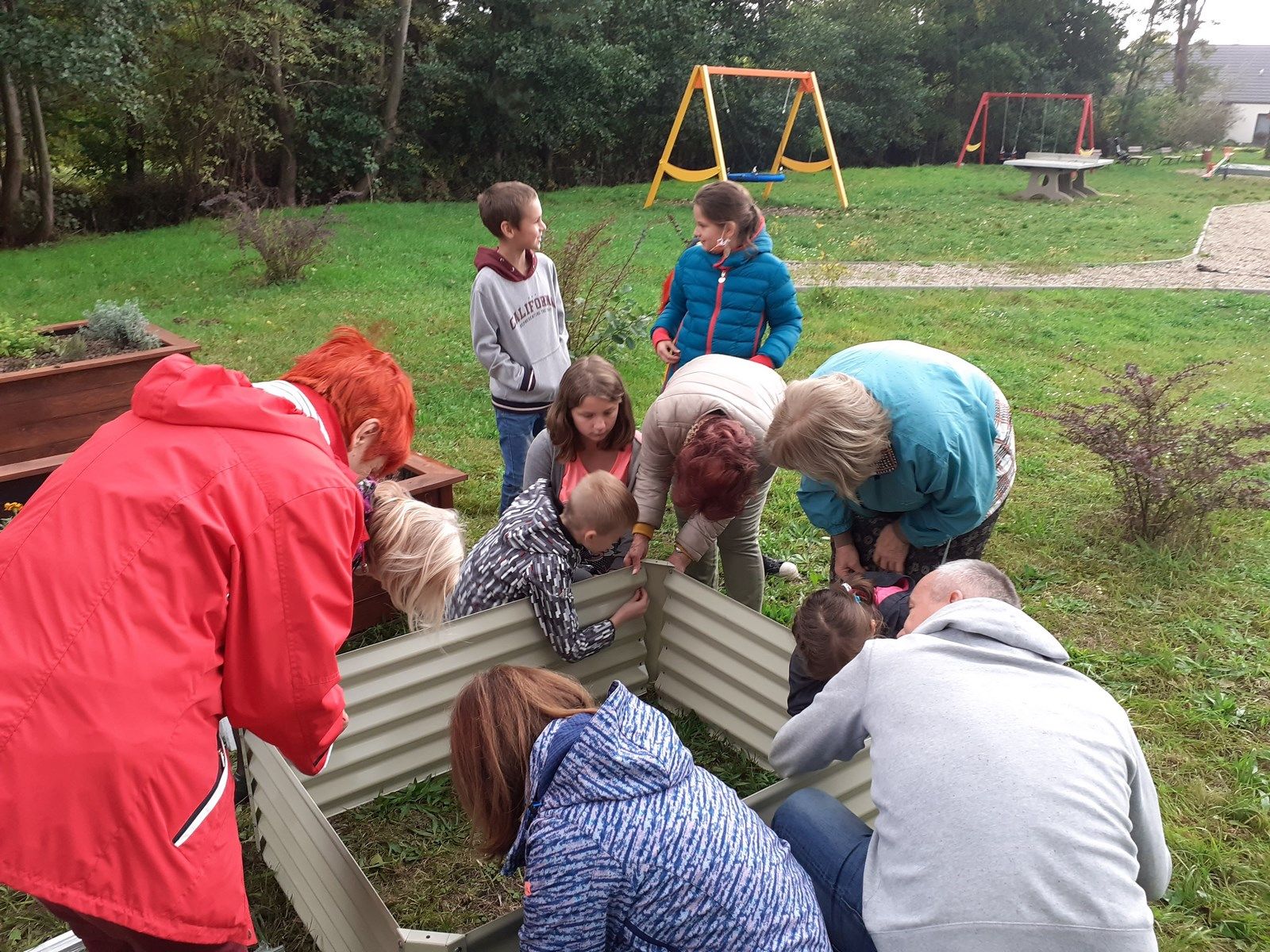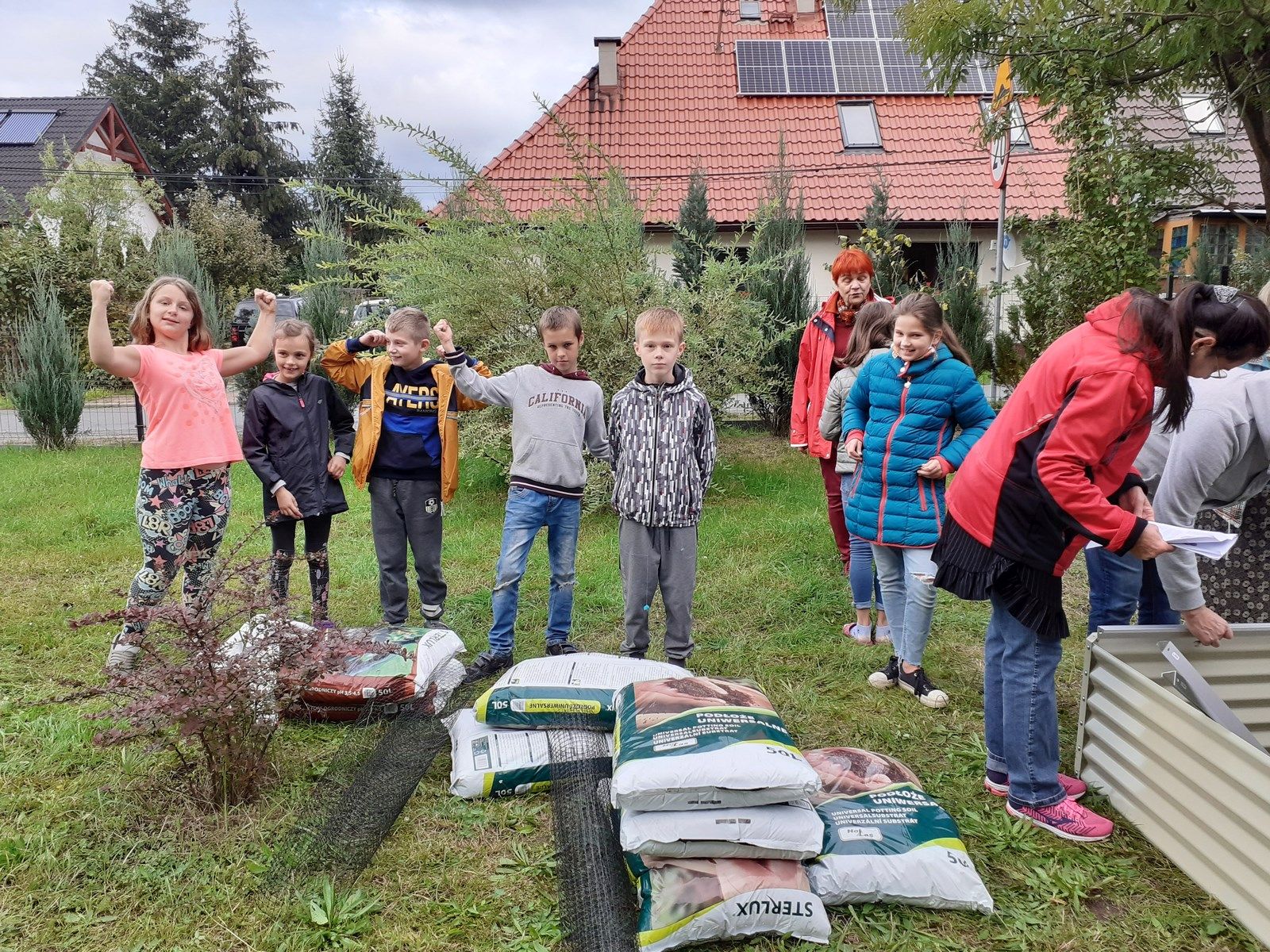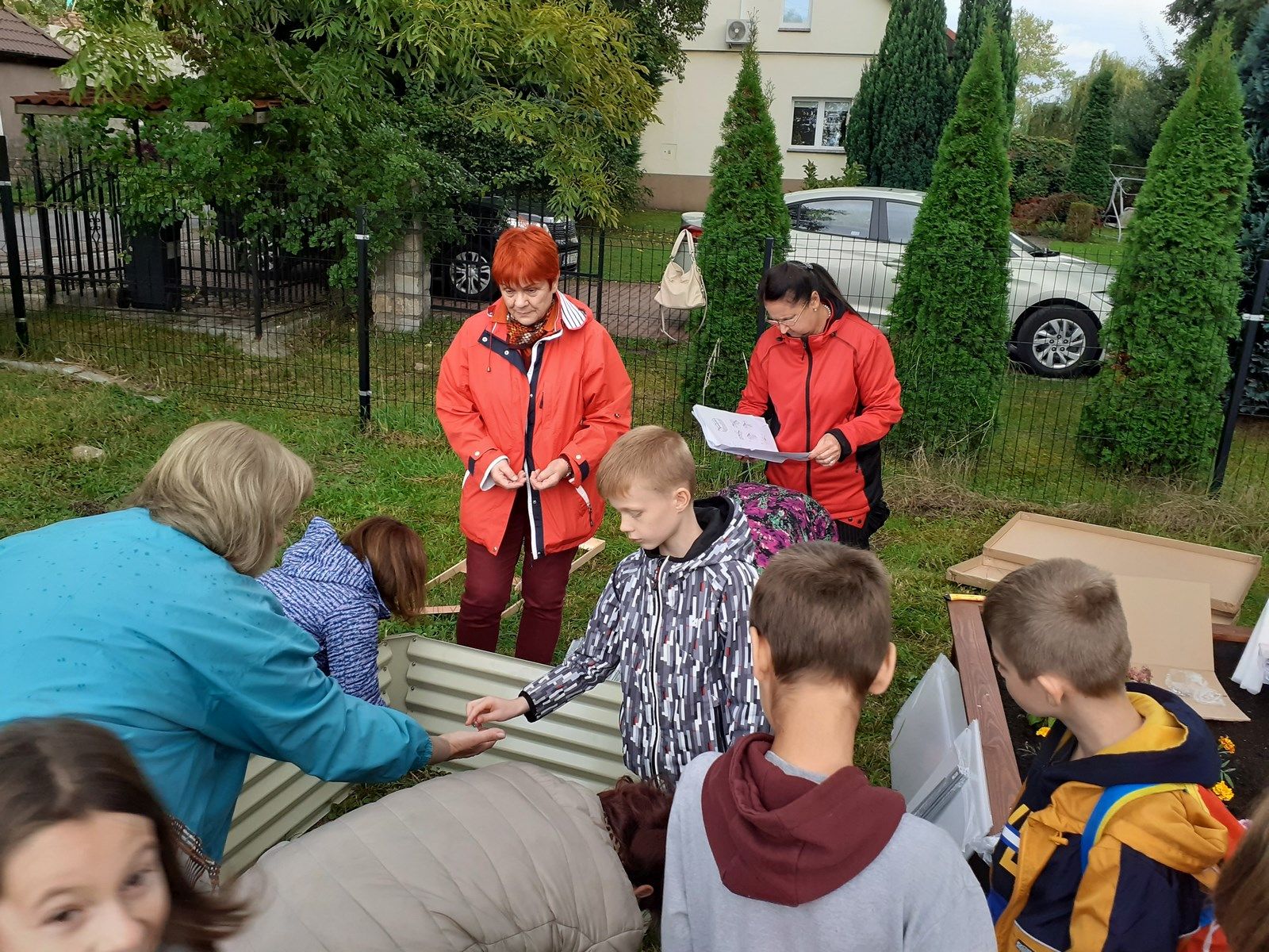 Piękna tęcza towarzyszyła nam podczas kolejnych prac przy zakładaniu eko ogródka. Na placu zabaw „Nad strumieniem” spotkaliśmy się z Paniami z Kiwanisu, żeby postawić skrzynię ogrodniczą , która na wiosnę zamieni się w mini szklarnię. Bardzo przydała się nam znajomość języka niemieckiego, ponieważ instrukcja skręcania była właśnie w tym języku. O przetłumaczenie trudniejszych zwrotów prosiliśmy Panią Basię – wykładowcę języka niemieckiego na Uniwersytecie Zielonogórskim. Pięknie współpracowaliśmy przy przenoszeniu worków z ziemią i torfem. Bartek i Patryk potrafili nawet tańczyć z workami 🙂 . Październik jest dobrym miesiącem na sadzenie roślin cebulowych, dlatego też posadziliśmy w drewnianych grządkach żonkile, przebiśniegi, ozdobne czosnki i krokusy. Pięknie będzie wyglądał nasz ogródek wiosną. Teraz też jest ciekawie. Często przychodzimy oglądać i podlewać nasze roślinki. Niektórzy mogli nawet spróbować naszych pierwszych poziomek. Kuba, Piotrek, Wojtek i Szymon postanowili wzbogacić swoją wiedzę o ziołach.