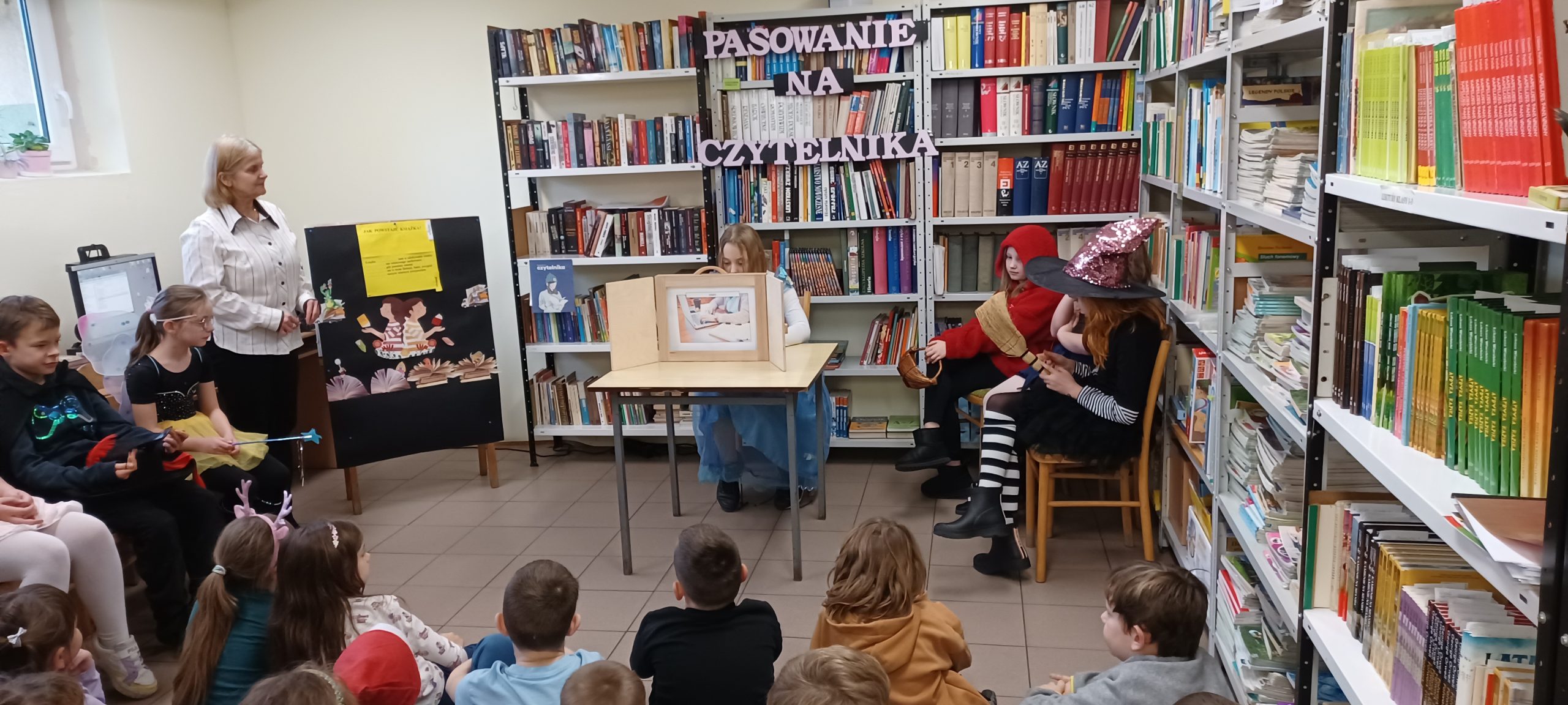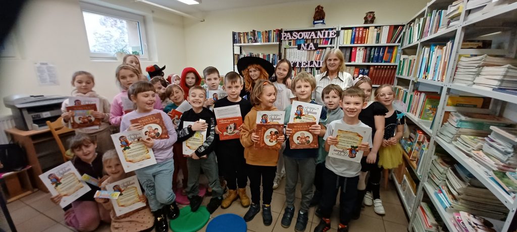 Pasowanie na czytelnika to oficjalne przyjęcie uczniów klasy pierwszej do grona biblioteki. Uroczystość ta odbyła się 11 grudnia, a uświetniła ją obecność postaci z bajek, w które wcielili się trzecioklasiści. Tematem przewodnim spotkania było hasło „Jak powstaje książka?”. Odpowiedzi na to pytanie pomagali szukać dzieciom bajkowi bohaterowie. Wykorzystali w tym celu teatrzyk kamishibai, piosenkę, zagadki i tekst z lukami. Przyszli czytelnicy wykazali się znajomością bajek, bajkowych postaci oraz uważnością, i z wszystkimi zadaniami poradzili sobie znakomicie. Podczas ślubowania złożyli uroczystą przysięgę, w której obiecali dbać o książki, szanować je i odwiedzać bibliotekę. Na zakończenie nowi czytelnicy otrzymali wyprawkę czytelnika dla pierwszoklasisty w ramach kampanii „Mała książka wielki człowiek”, pamiątkowe dyplomy, zakładki. Wyprawka czytelnicza dla klasy pierwszej zawiera książkę Justyny Bednarek „Wnuczka Antykwariusza” z ilustracjami Emilii Dziubak oraz broszurę dla rodziców pt. „Kochasz? Czytaj razem dzieckiem”, która podkreśla korzyści płynące ze wspólnego czytania z dzieckiem. Było to miłe, bajkowe spotkanie. Życzymy nowym czytelnikom wspaniałych przygód z książką.