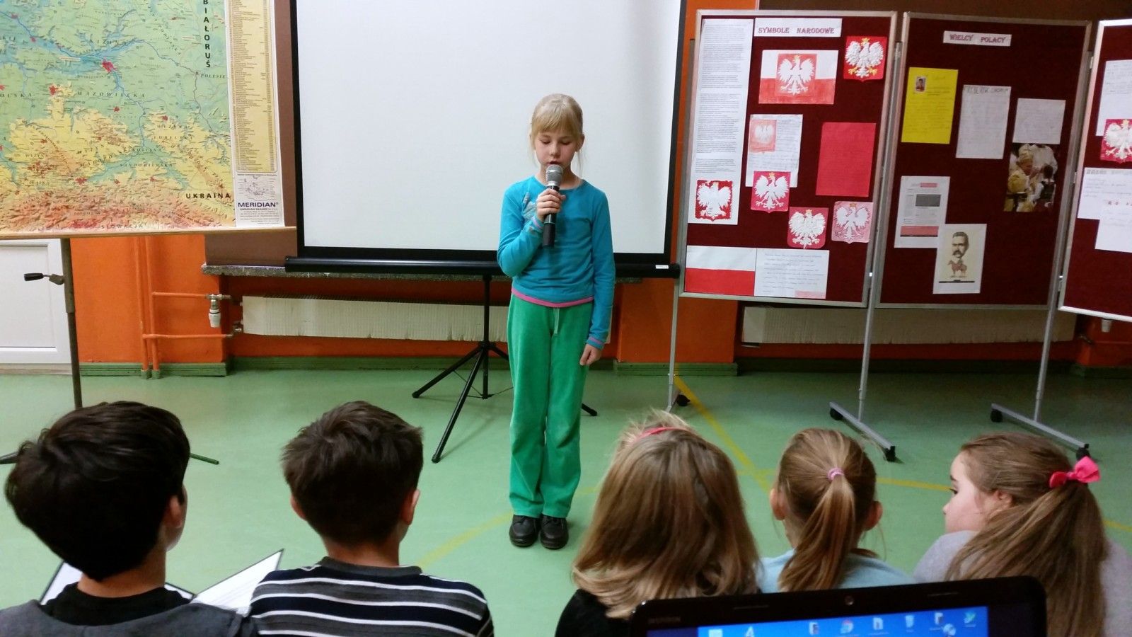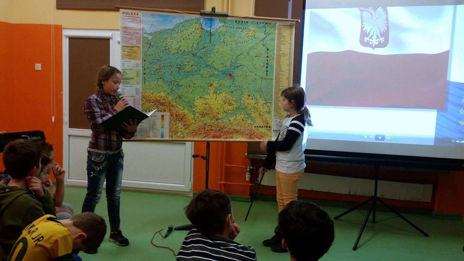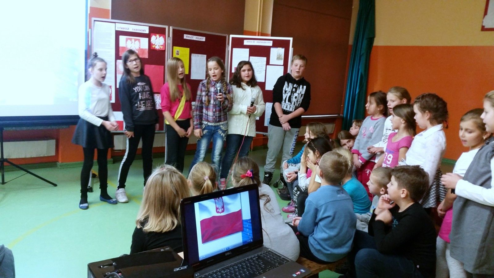 Obchody Święta Niepodległości w naszej szkole odbyły się w formie ciekawej prezentacji. Obejrzeliśmy film o historii hymnu, wspólnie odśpiewaliśmy „Mazurka Dąbrowskiego”. Następnie uczennice kl.V omówiły położenie Polski, wskazały największe miasta, rzeki oraz sąsiadów naszego państwa. W ostatniej części zobaczyliśmy prezentację największych miast. Kiedy na ekranie zaczęły pojawiać się nasze zdjęcia, uczniowie z radością odnajdywali siebie w różnych miastach.