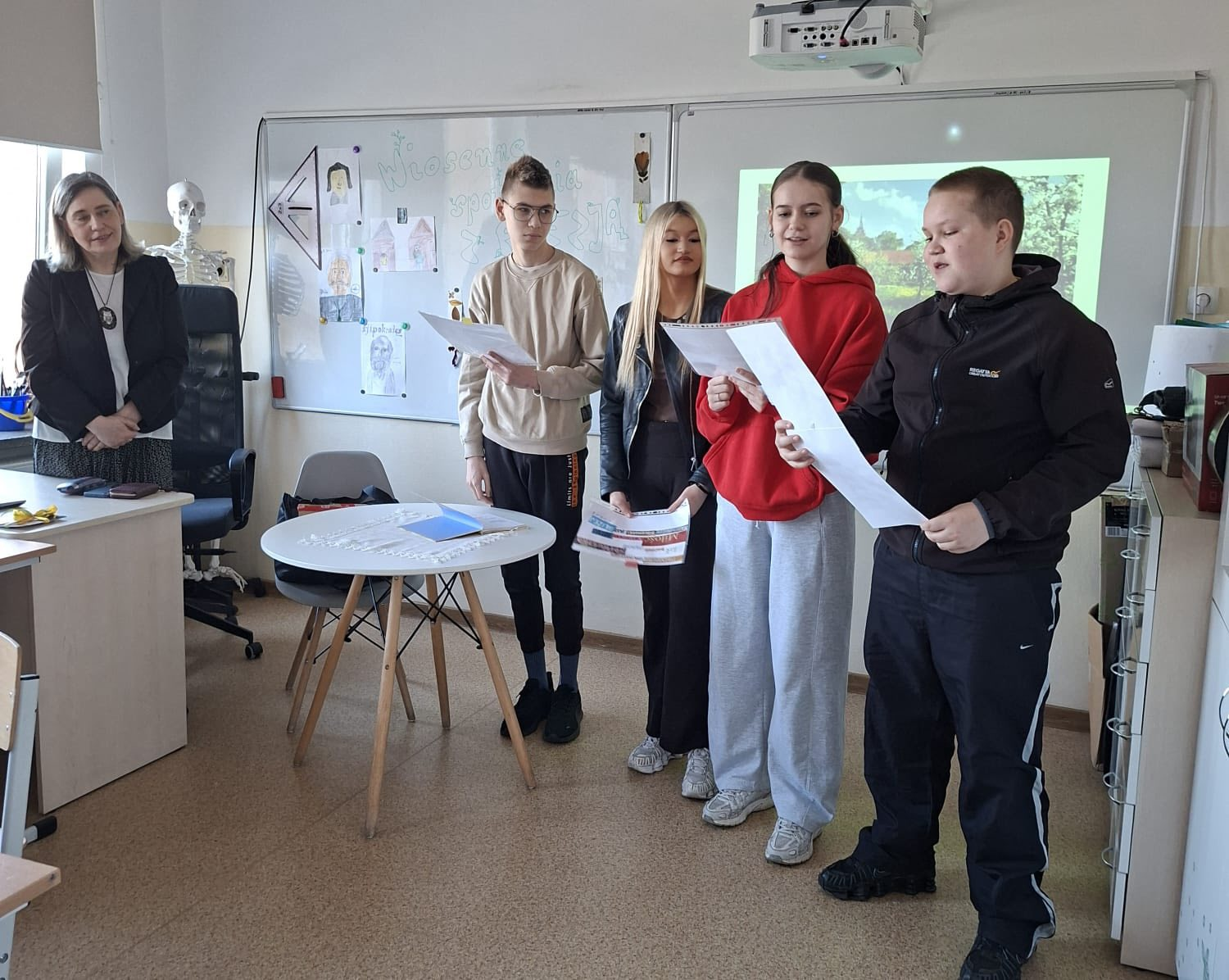 Uczniowie czynnie włączyli się do wspólnego poezjowania. Lena, Natasza i Anastazja przeczytały wiersze: „Leonardo da Vinci”, „Mikołaj Kopernik”, „Sokrates”. Była oczywiście dyskusja o osiągnięciach tych wielkich postaci. Spontaniczne zainteresowanie Anastazji i Julka Marią Skłodowską- Curie oraz Albertem Einsteinem zaowocowało odczytaniem wierszy o tych sławnych naukowcach oraz podtrzymała dalszą dyskusje o tęgich głowach. Na zakończenie uczniowie zostali zaproszeni do wspólnego poezjowania poprzez układanie złotych myśli lub rymowanek z wyrazów wyciętych z gazet. Efekty były zaskakujące, co może świadczyć o tym, że jednak poezja drzemie w młodzieży. Oczywiście można było także zakupić tomik poezji z dedykacją autorki.