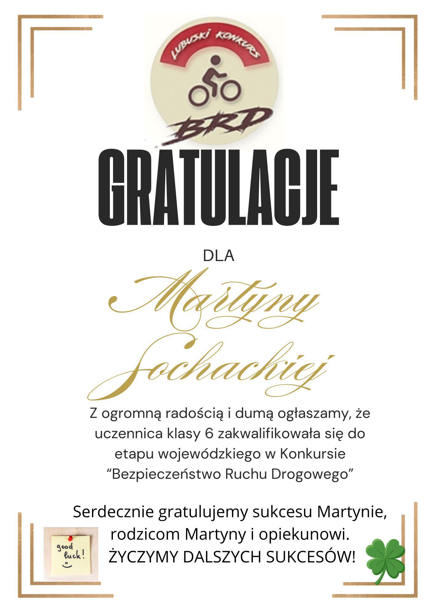Plakat z gratulacjami dla Martyny Sochackiej za zakwalifikowanie się do etapu wojewódzkiego w konkursie ,,Bezpieczeństwo Ruchu Drogowego"