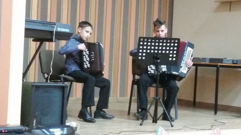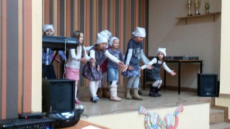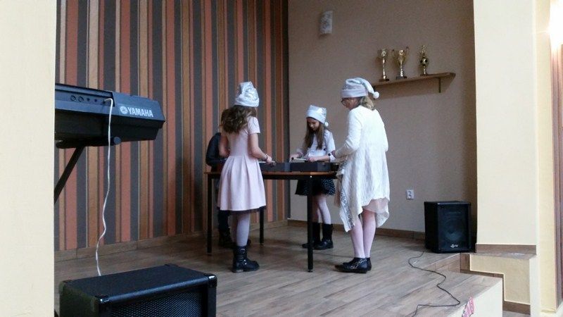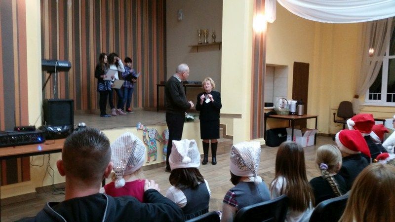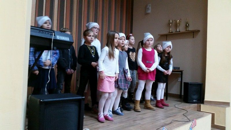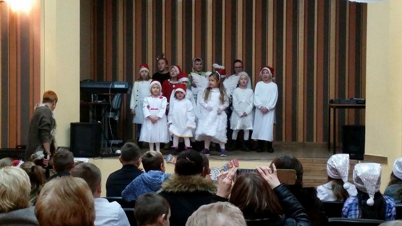 Na scenie sali wiejskiej w Słonem program bożonarodzeniowy zaprezentowali młodzi wokaliści, tancerze i instrumentaliści. Usłyszeliśmy kolędy i pastorałki zagrane na metalofonach i keyboardzie. Szczególnie bogaty program przedstawili akordeoniści : Piotr Pawłowski i Julian Lato. Bardzo podobały nam się występy koleżanek i kolegów z Koźli. Gościem specjalnym spotkania był Chór ” Świdniczanie”, który zachęcił do wspólnego kolędowania wszystkich zebranych. Spotkanie stało się okazją do podziękowania za kolejny rok bardzo dobrej współpracy naszej szkoły i Klubu Kiwanis Zielona Góra ADSUM.
