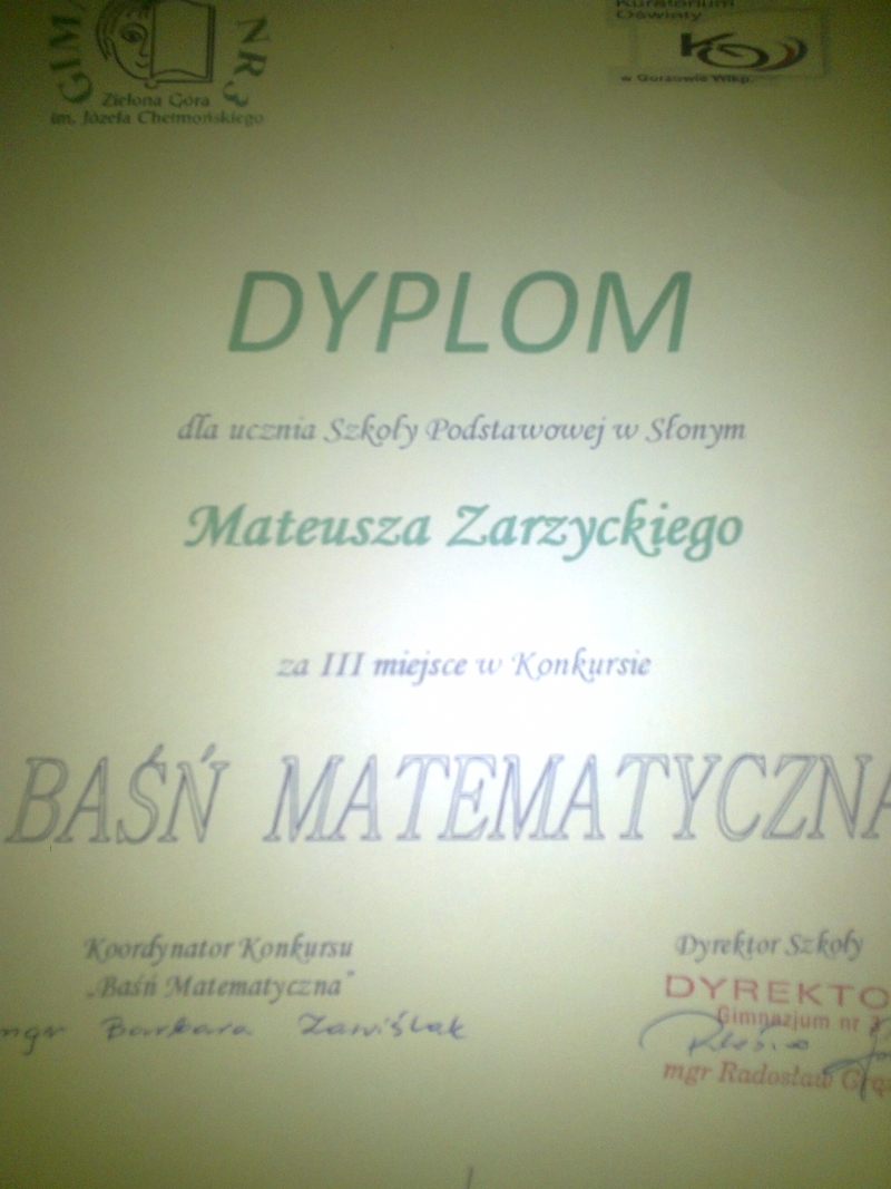 Mateusz Zarzycki zajął III miejsce w Międzyszkolnym Konkursie „Baśń Matematyczna” organizowanym przez Gimnazjum nr 3 w Zielonej Górze. Z ponad 150 prac konkursowych kalendarz matematyczny naszego ucznia zwrócił uwagę jurorów.