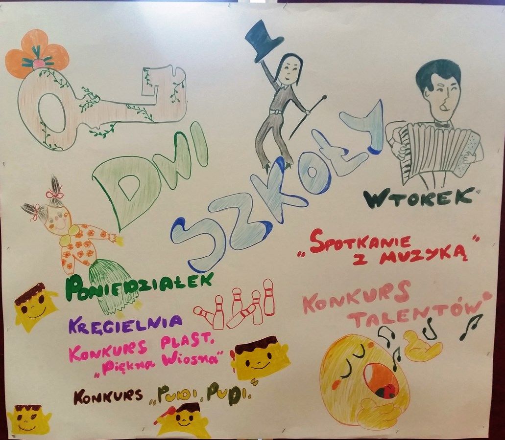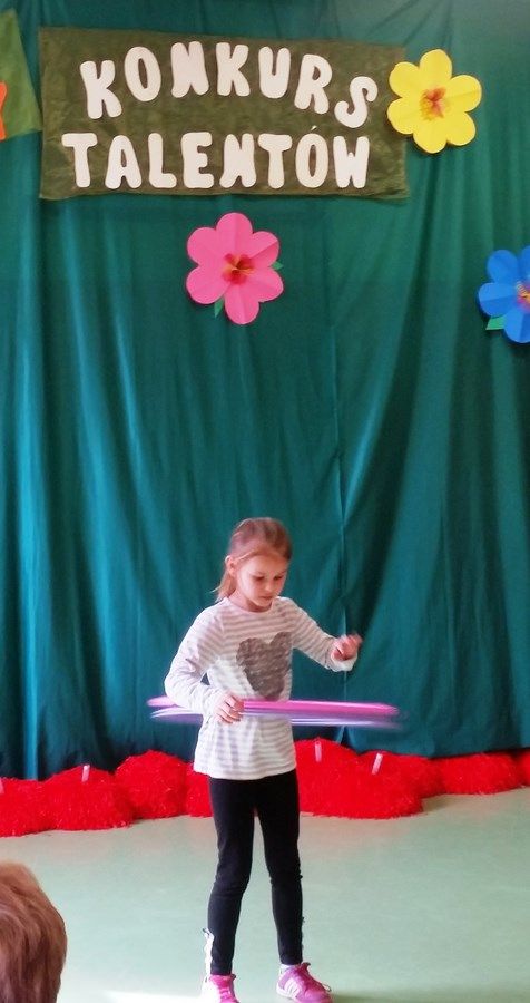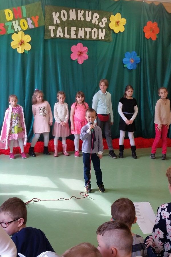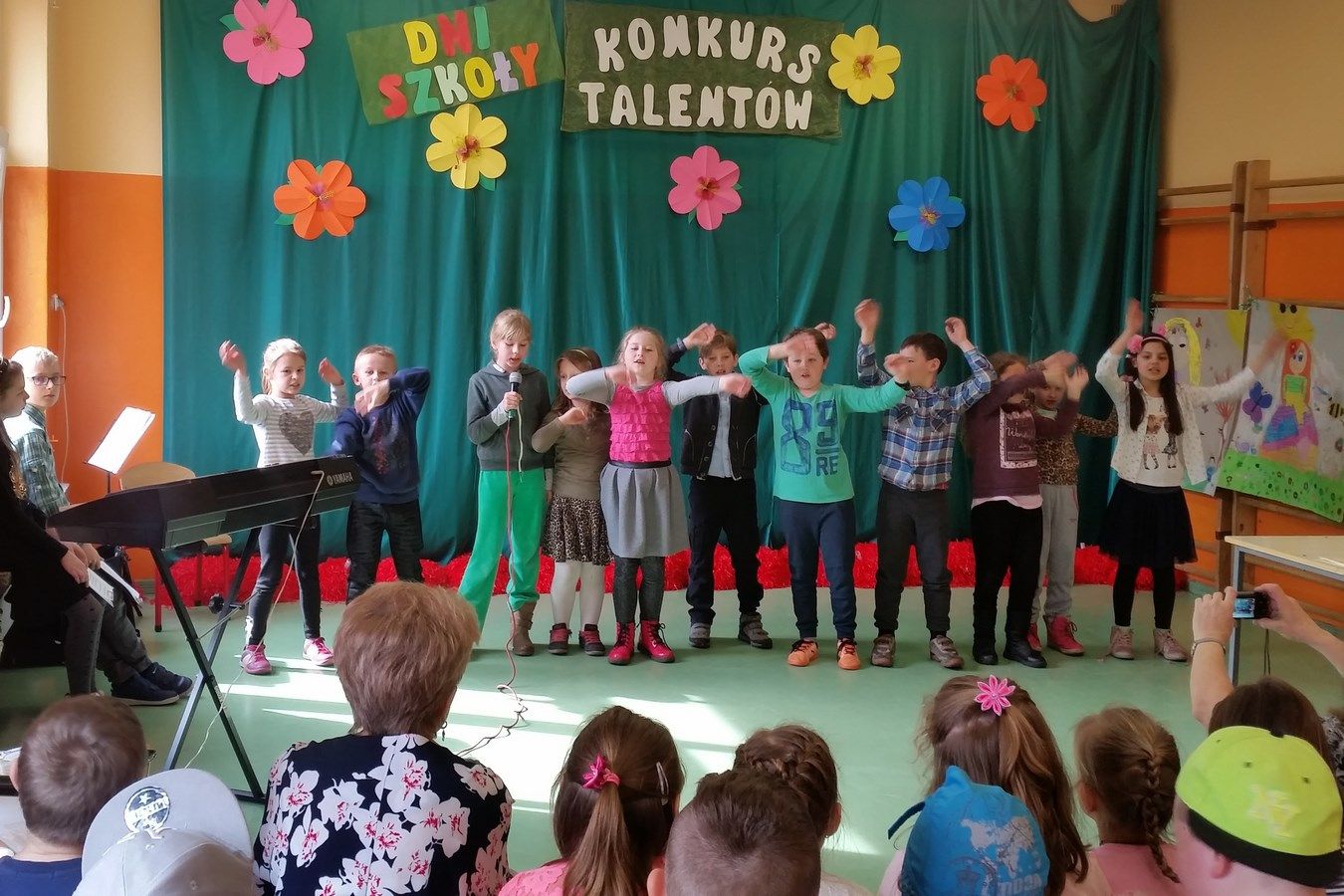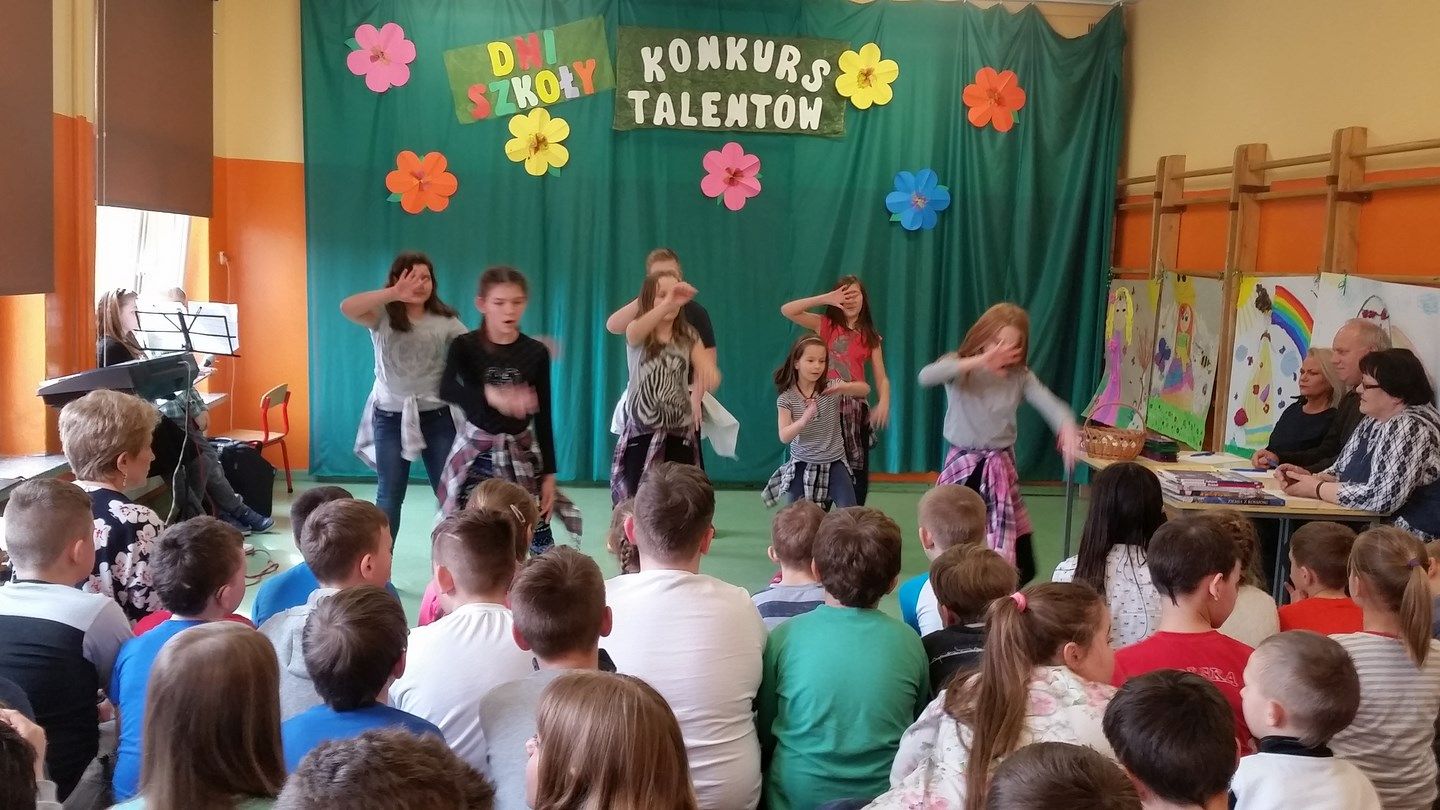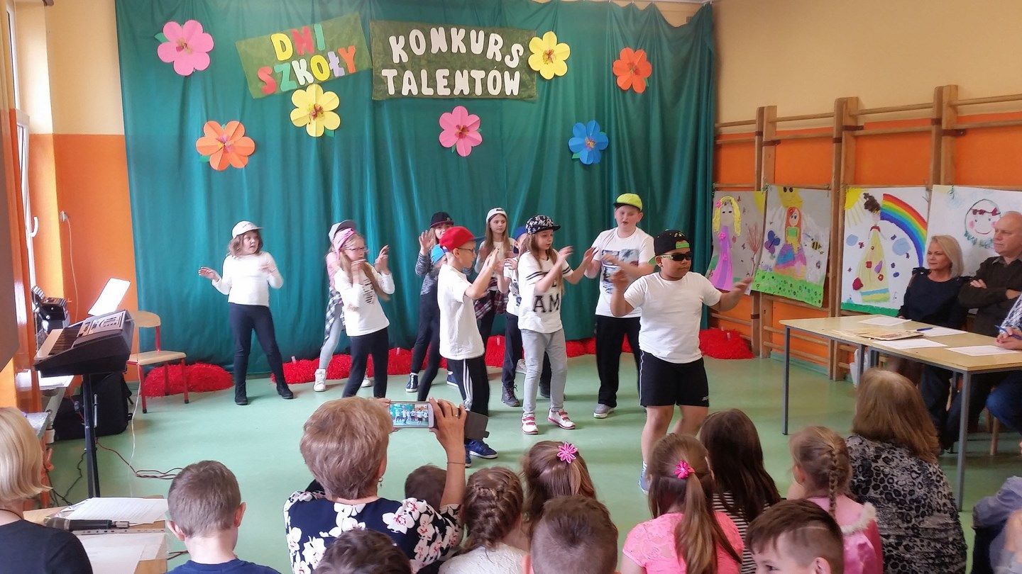 Dalszą część dnia wypełniliśmy naszymi umiejętnościami. W Konkursie Talentów chwaliliśmy się: śpiewem, tańcem, pokazami akrobatycznymi i karate, grą na gitarze, keyboardzie i akordeonie, układaniem na czas kostki Rubika, żonglerką piłką i kręceniem dwoma kołami hula-hop. Bawiliśmy się świetnie. Najciekawsze występy publiczność nagradzała brawami na stojąco. Jury miało ogromne problemy z przydzieleniem miejsc. Wszyscy byliśmy naj! Wśród uczniów klas młodszych I miejsce zajęła grupa taneczna z klasy III poprowadzona przez Oskara, który dodatkowo w Szkolnym Konkursie Talentów otrzymał tytuł „Najlepszego tancerza”. Wśród uczniów starszych I miejsce zajęli : akordeonista- Piotr Pawłowski i pianista Maciej Czekaj. Dużo emocji wywołała klasowa rywalizacja na najciekawszą choreografię do utworu „Pudi, Pudi”. Taneczne zmagania starszych kolegów oceniło bardzo liczne jury. Wszyscy uczniowie klas młodszych głosowali na ich zdaniem najciekawszy pokaz taneczny. Największą ilość głosów i tytuł ” Giga Pudi” zdobyła klasa VI. Poznaliśmy też wyniki konkursu plastycznego. Najpiękniejszą Panią Wiosnę namalowały dziewczyny z klasy V. Drugie miejsce zdobyła praca dziewczynek z klasy IV a trzecie Tęczowa Wiosna chłopców z klasy IV. Na zakończenie obchodów Dni Szkoły wręczono nagrody najlepszym graczom w szachy i warcaby.