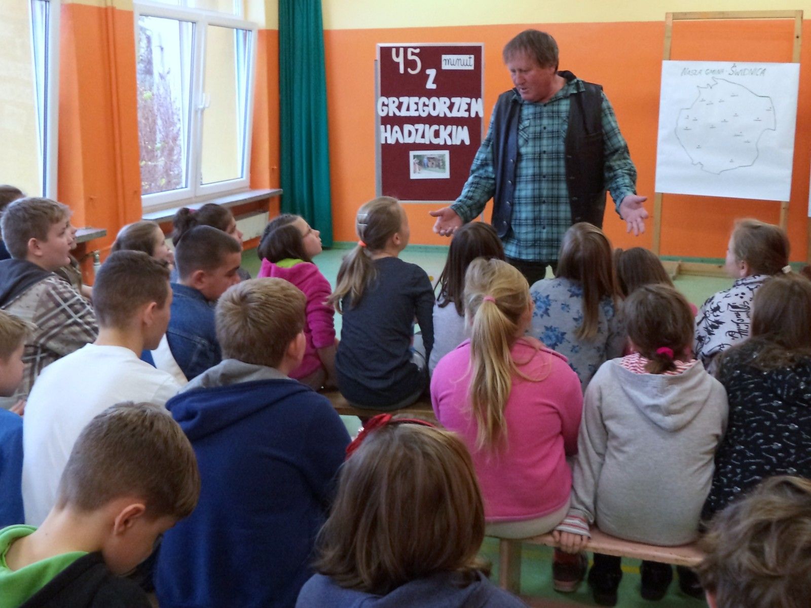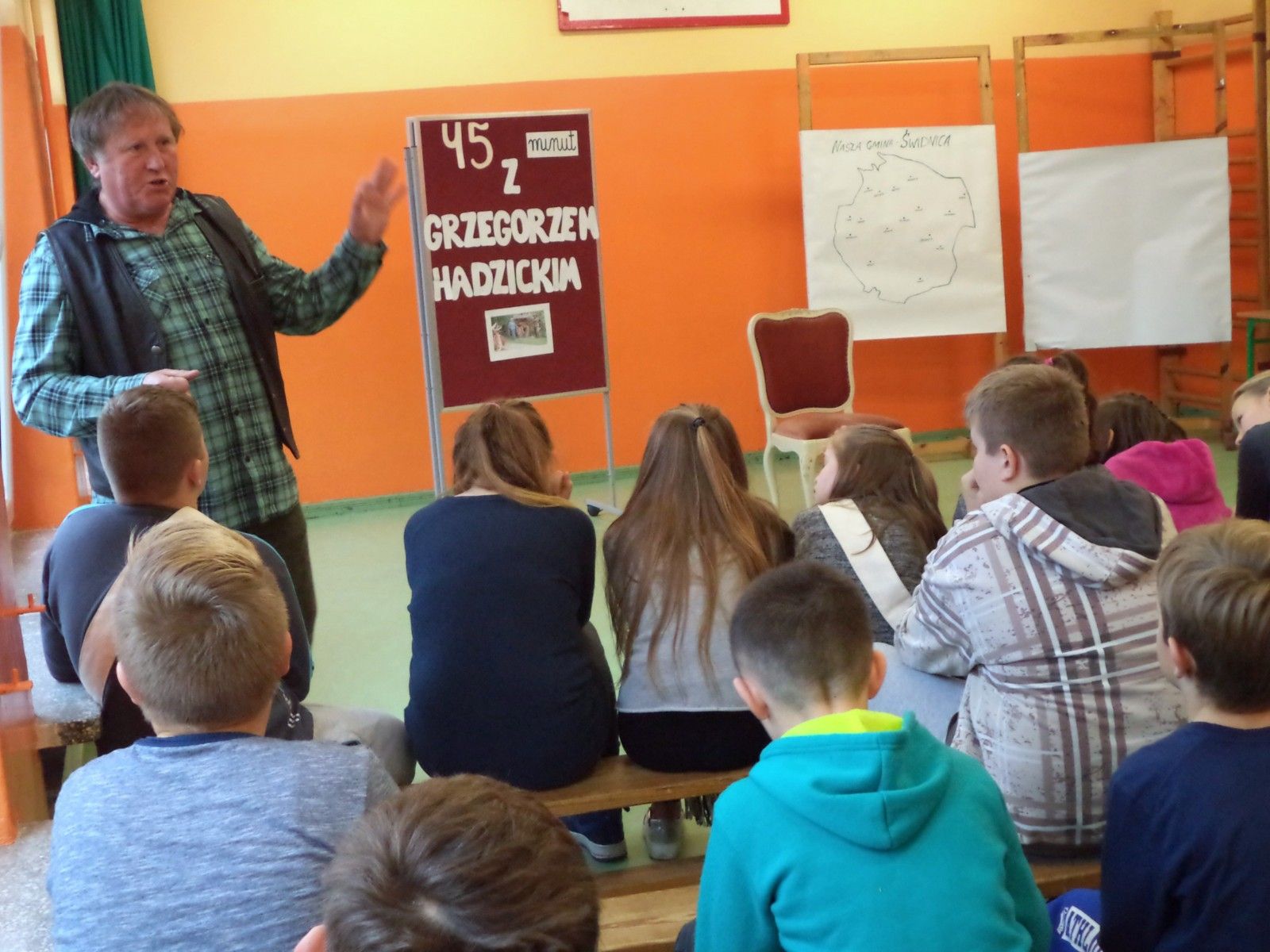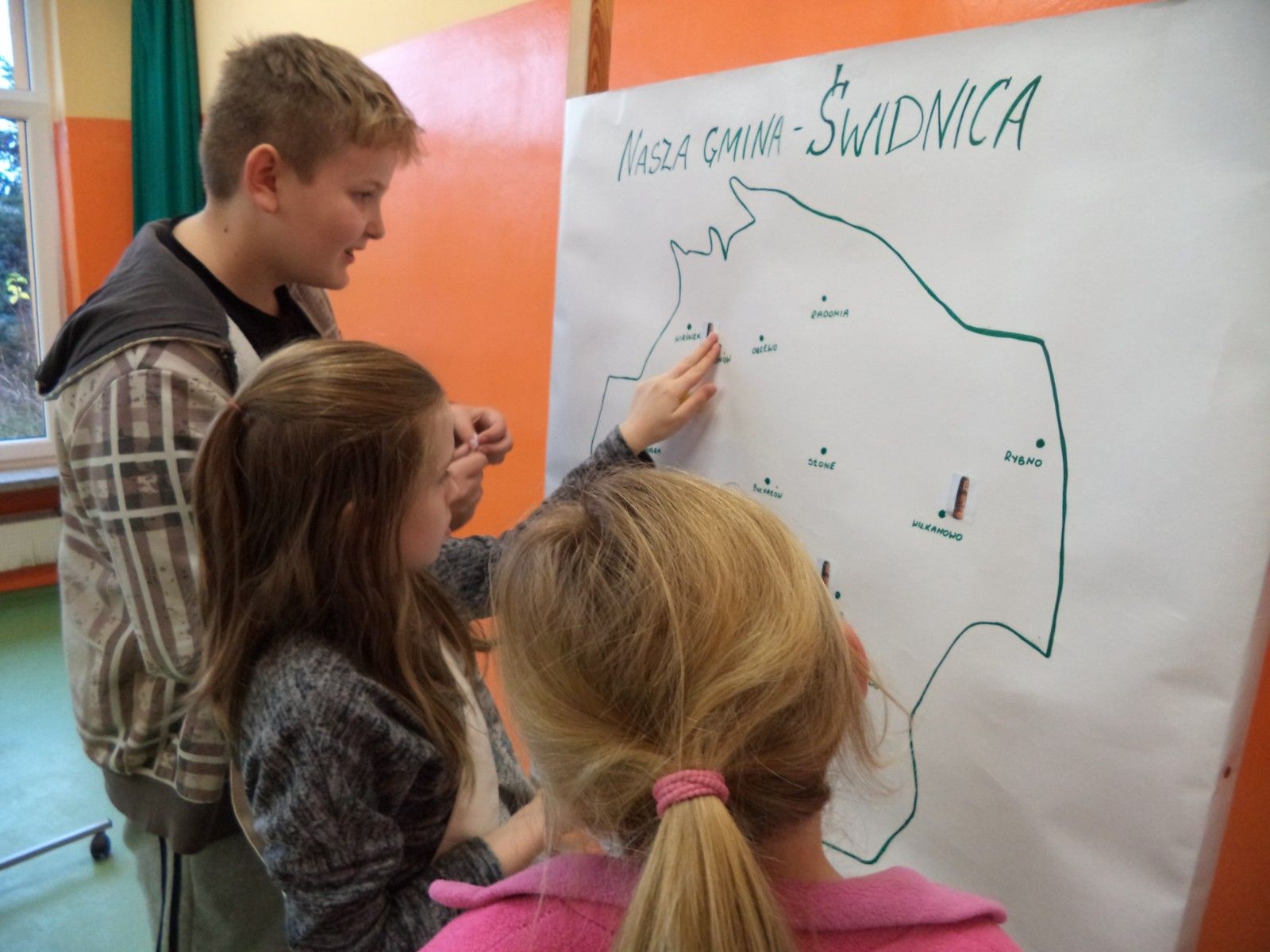W trakcie spotkania nasz gość wspólnie z uczniami tworzył mapę swoich rzeźb na terenie naszej gminy.