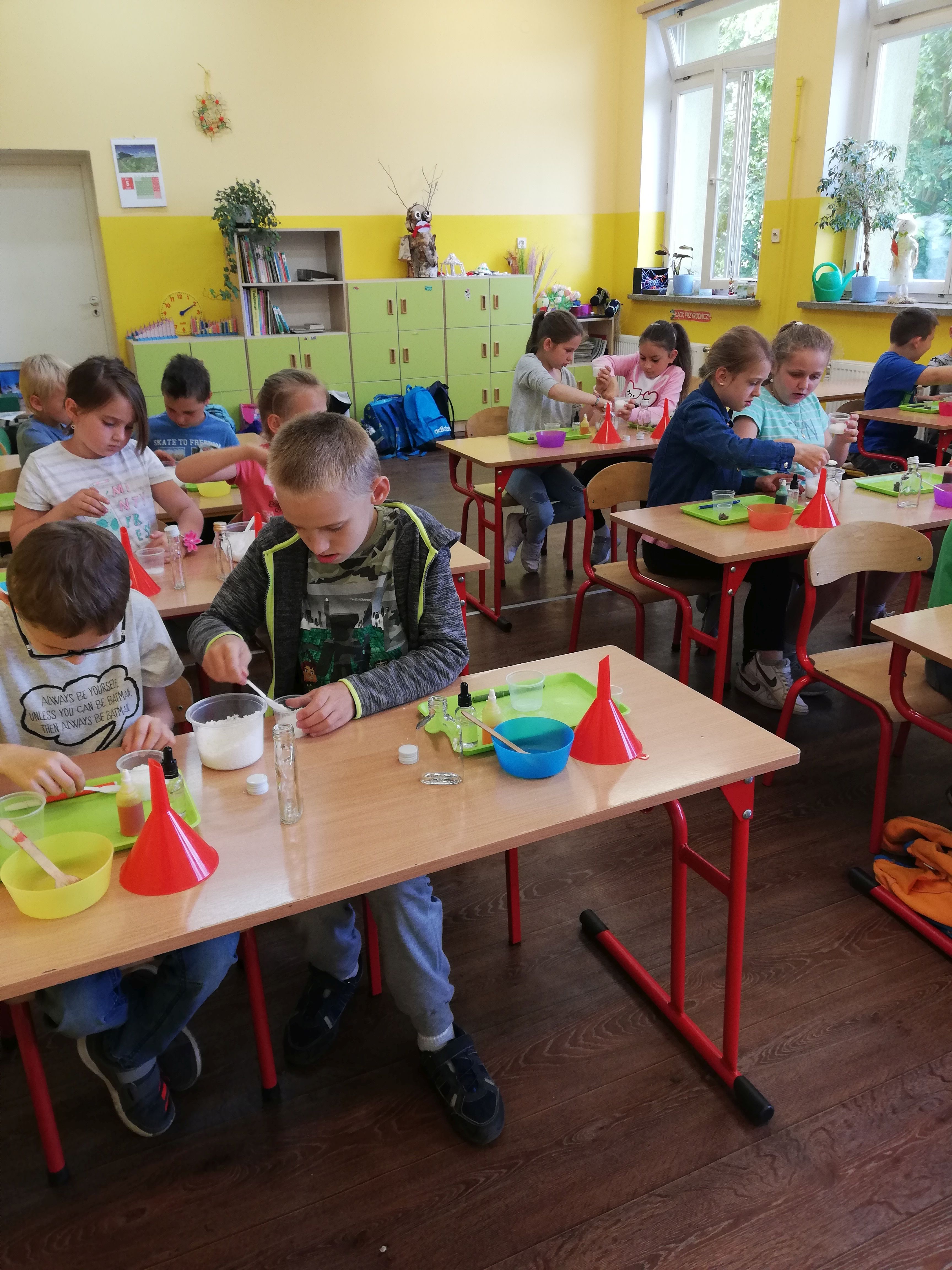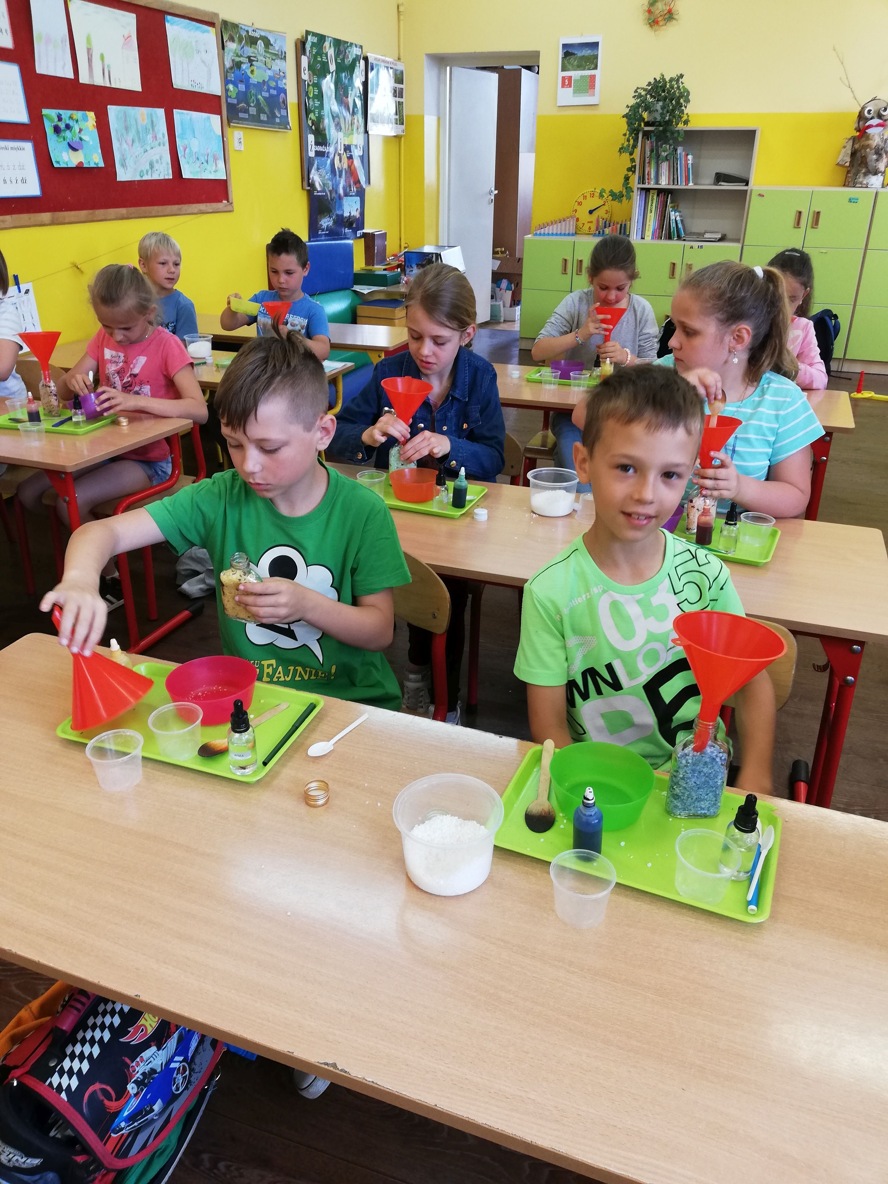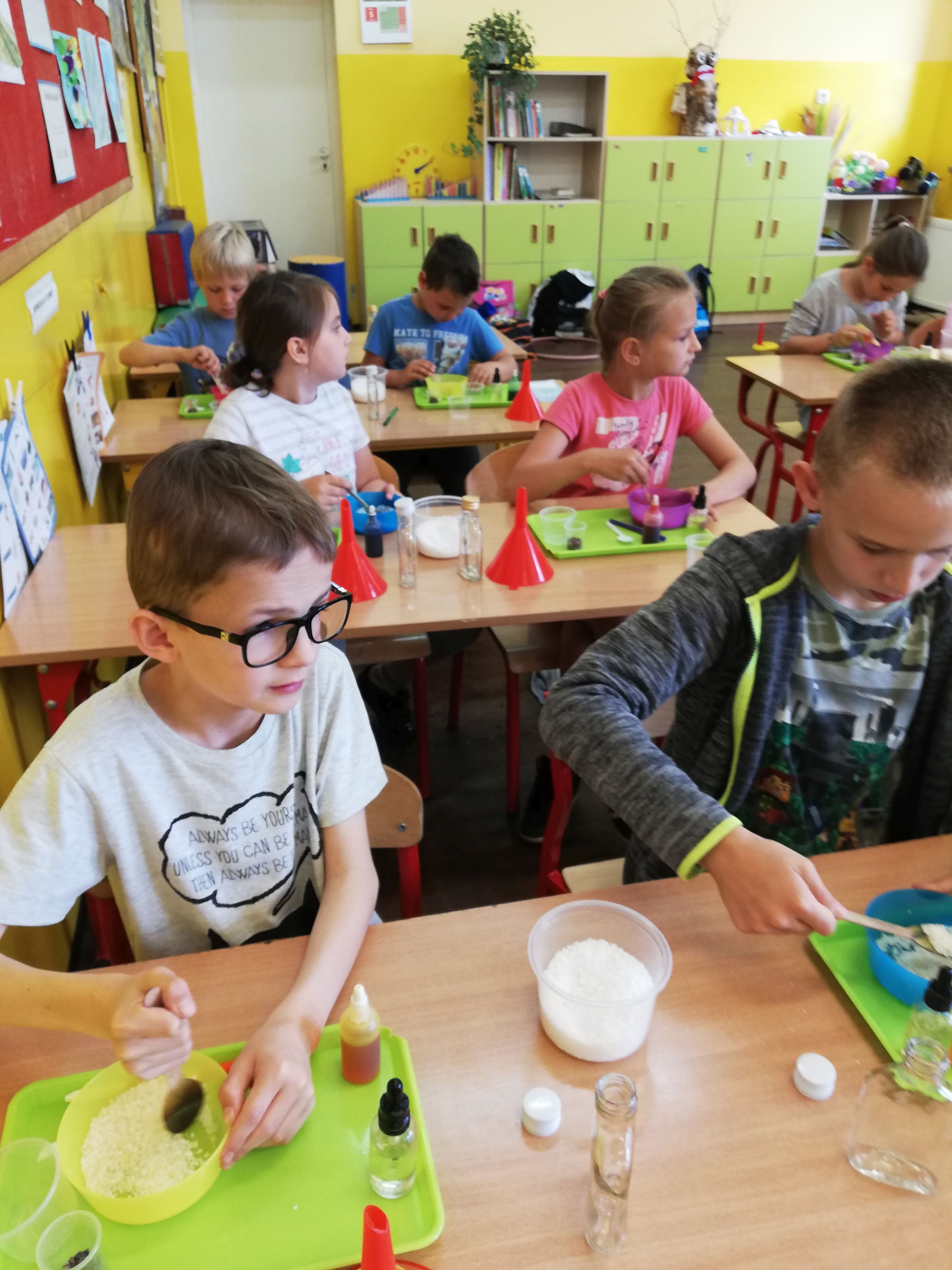 Kolejne spotkanie z Krainą Eksperymentów wzbudziło ogromną ciekawość dzieci, których zadaniem było przygotowanie soli zapachowych do kąpieli i podarowanie najbliższej osobie. Uczniowie we flakonikach wykonywali kolorowe mozaiki różnorodnych soli, sprawdzali intensywność oraz dobór zapachów oraz podpisywali dla kogo są przeznaczone.