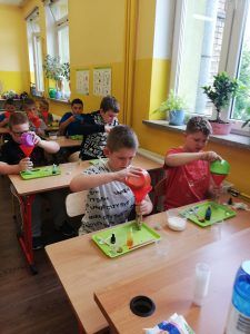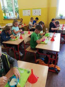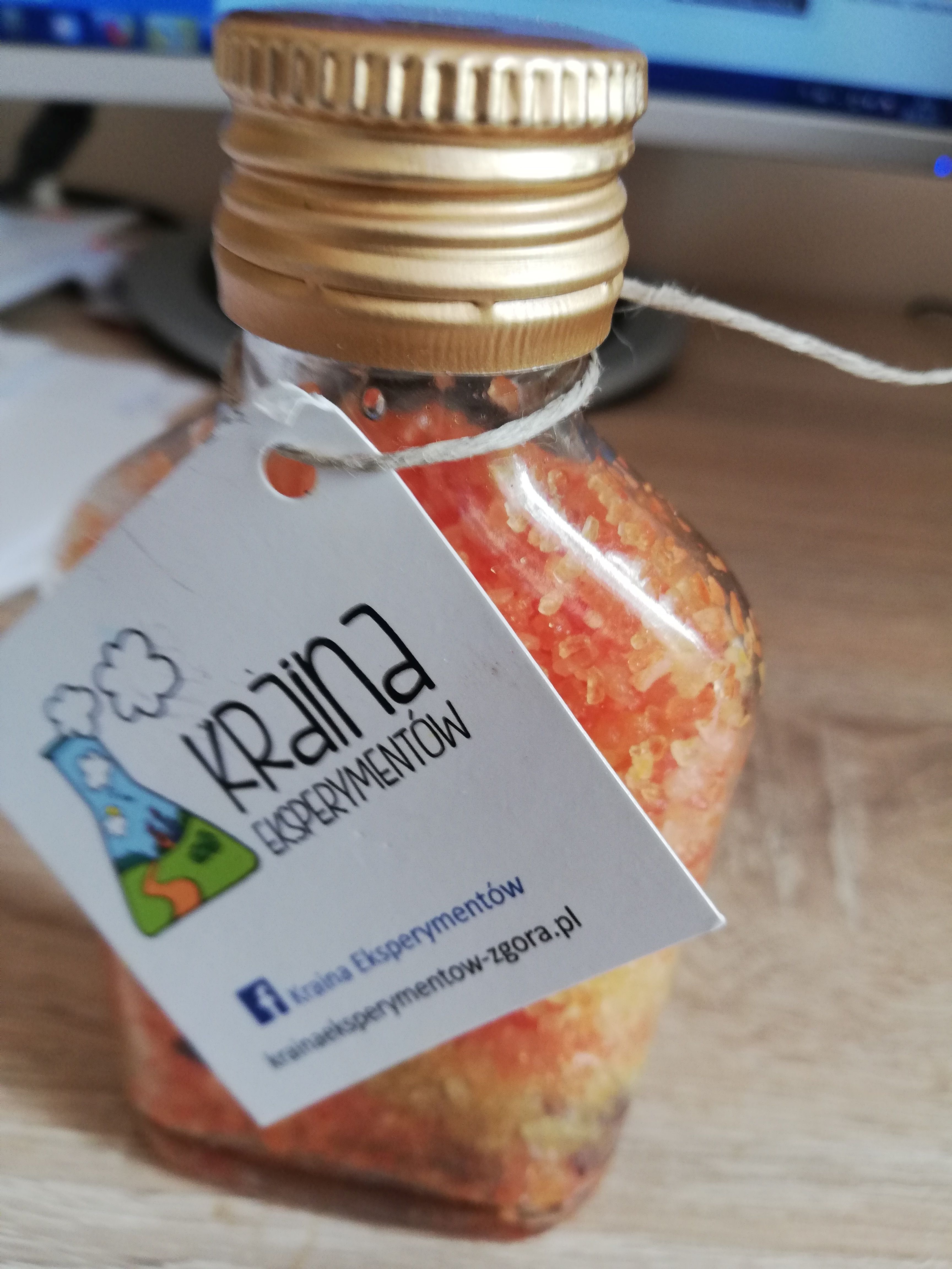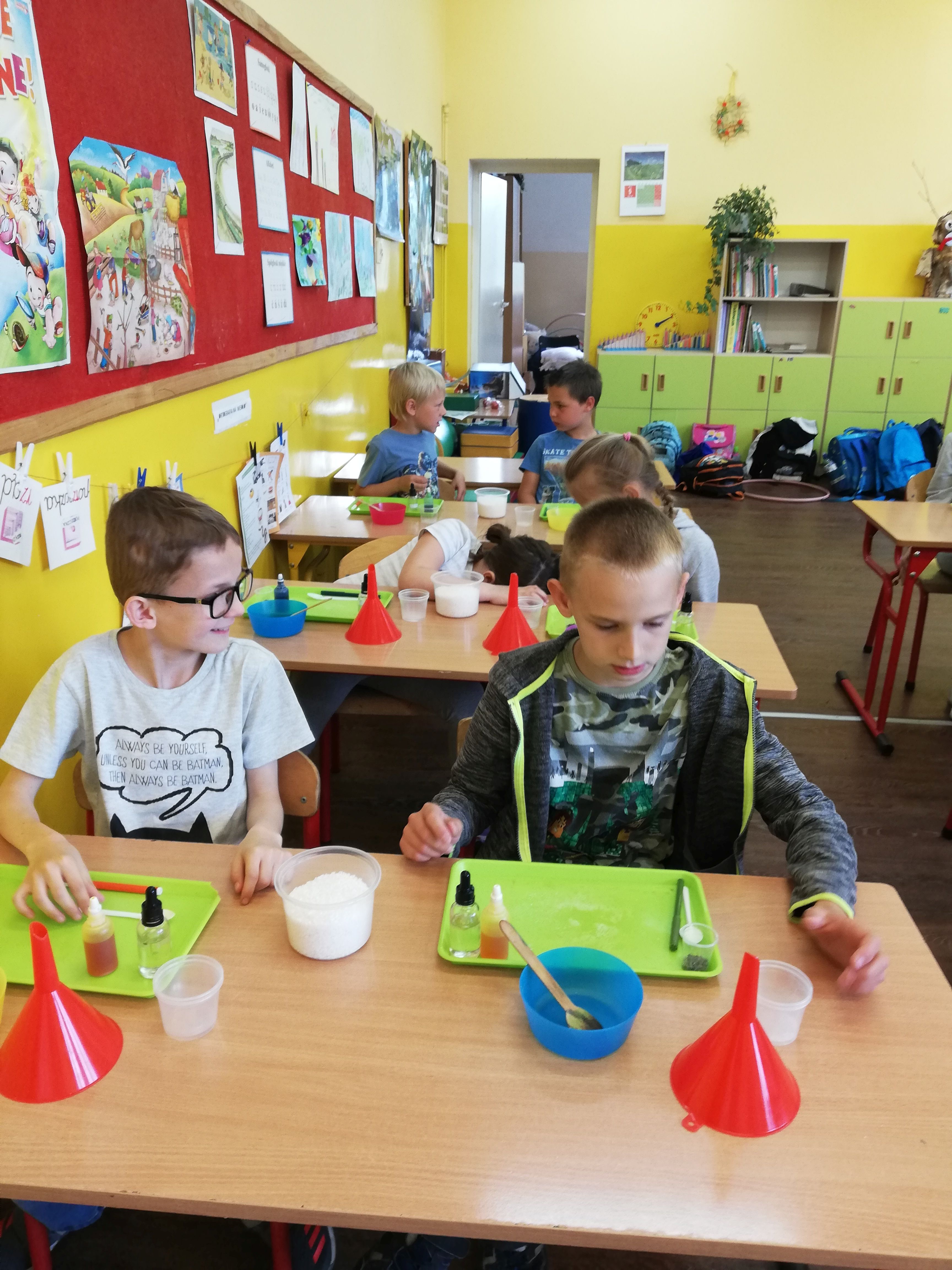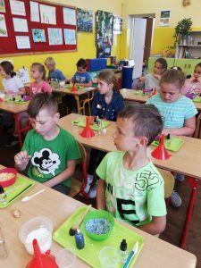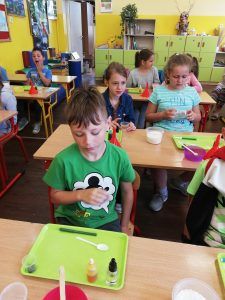 Kolejne spotkanie z Krainą Eksperymentów wzbudziło ogromną ciekawość dzieci, których zadaniem było przygotowanie soli zapachowych do kąpieli i podarowanie najbliższej osobie. Uczniowie we flakonikach wykonywali kolorowe mozaiki różnorodnych soli, sprawdzali intensywność oraz dobór zapachów oraz podpisywali dla kogo są przeznaczone.