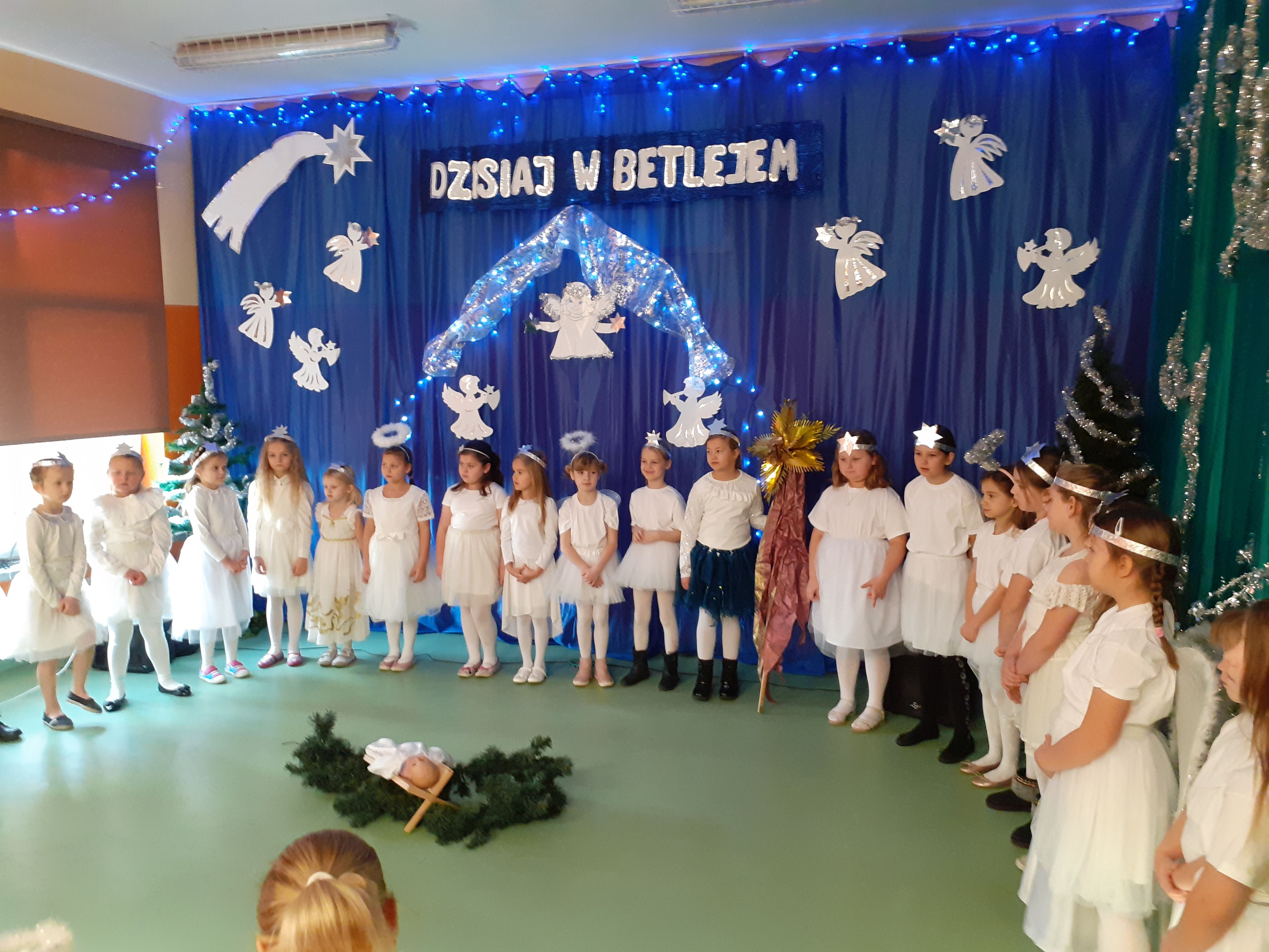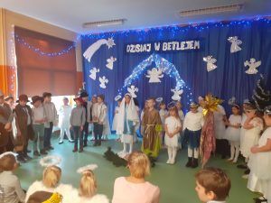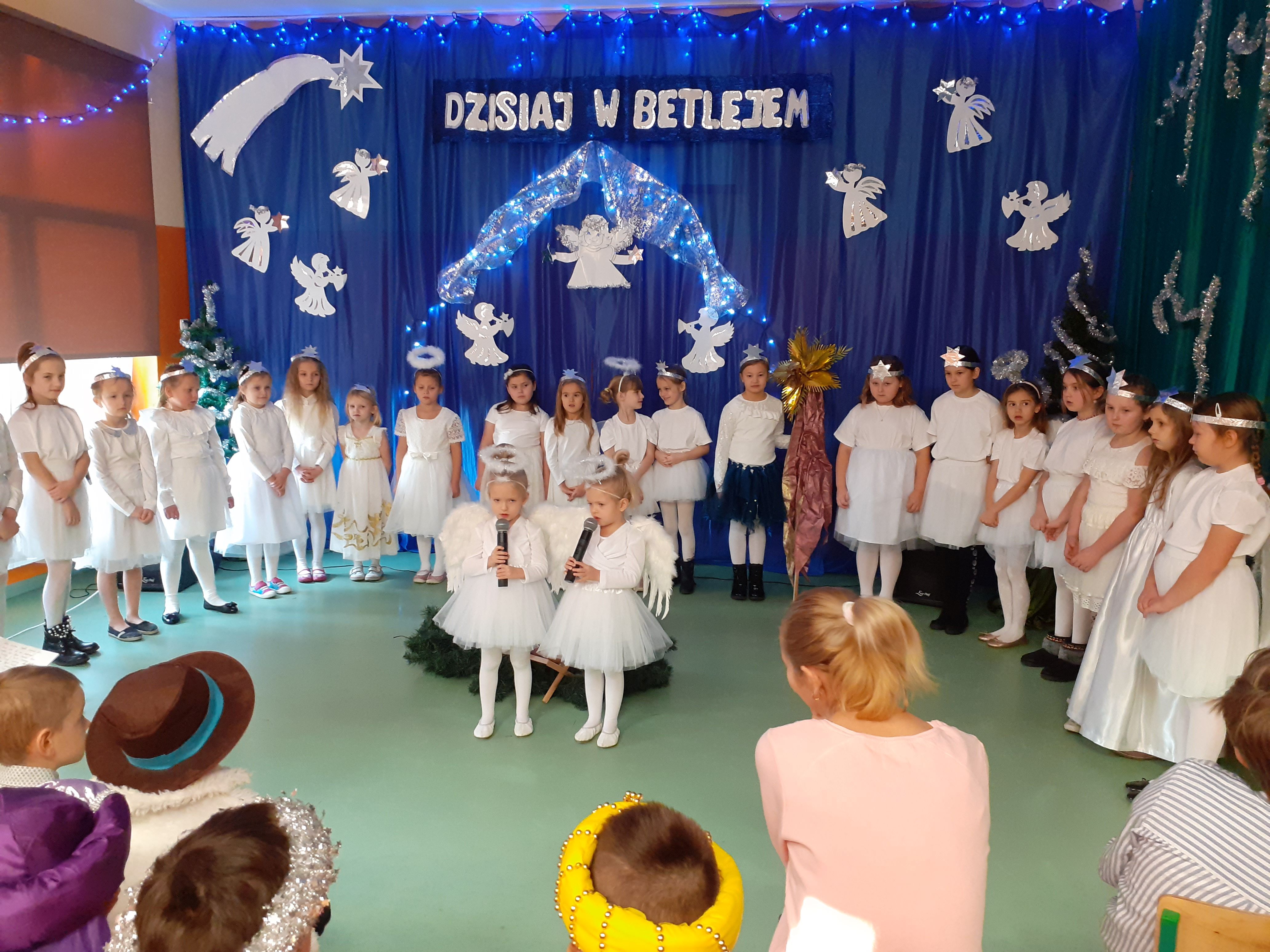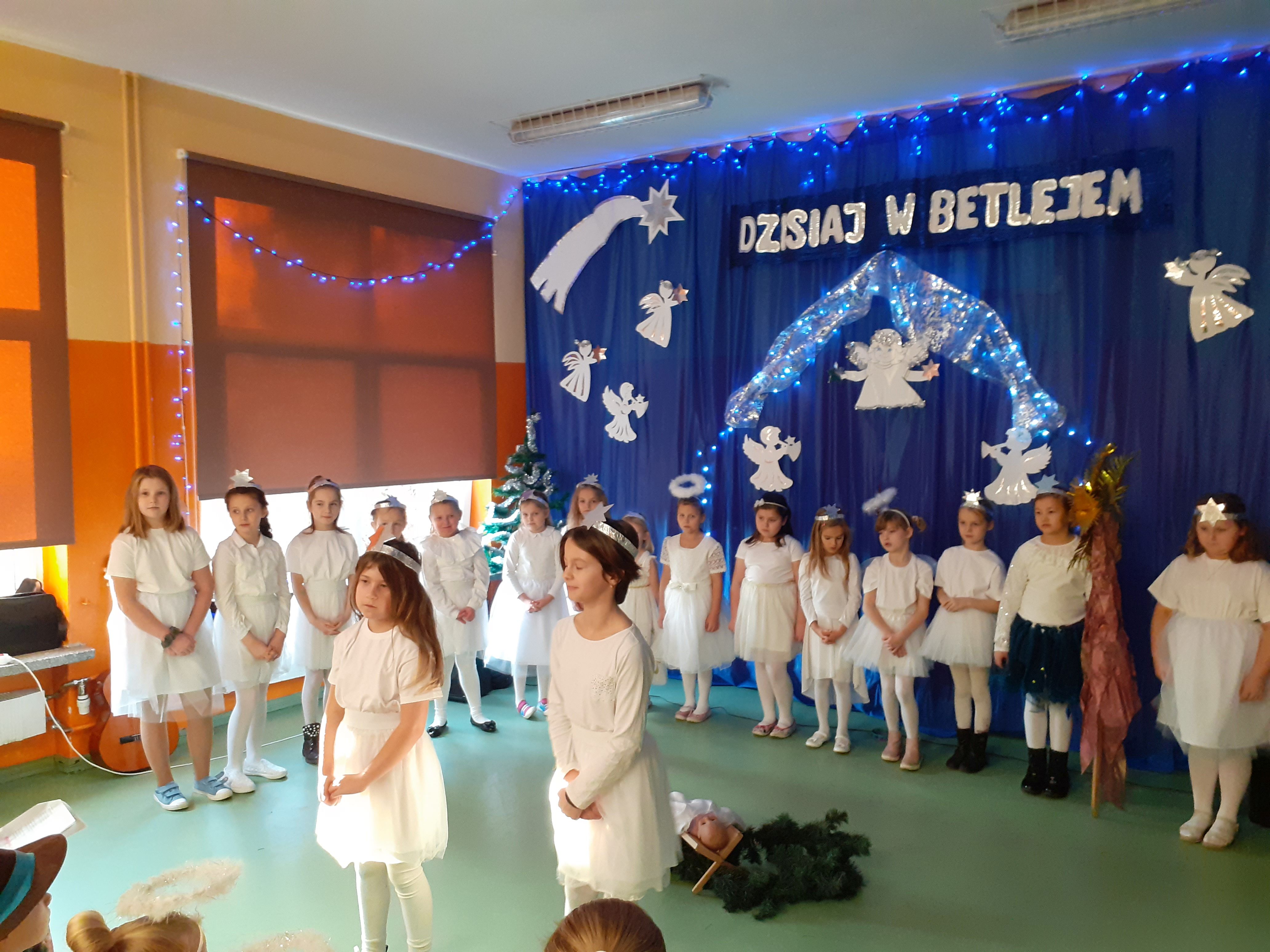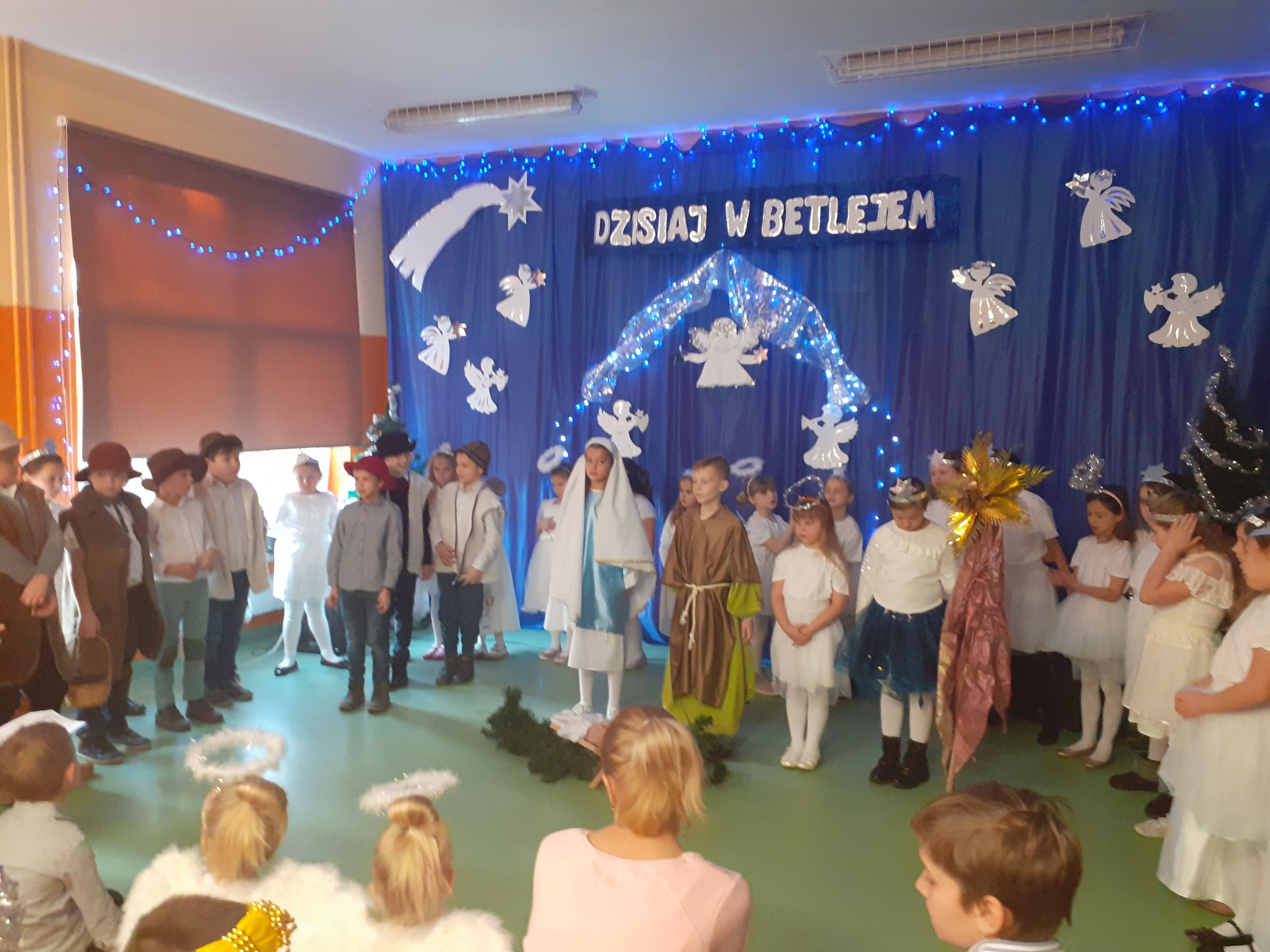 W świąteczną atmosferę wprowadzili nas uczniowie klas I – III, którzy przygotowali przedstawienie jasełkowe. Zaprezentowali je 20 grudnia, przypominając w ten sposób wydarzenia sprzed ponad dwóch tysięcy lat, kiedy to w Betlejem narodziło się Boże Dzieciątko. Dzieci wcieliły się w role Maryi i Józefa, pasterzy, aniołów. Do wspólnego kolędowania włączyli się uczniowie wraz z księdzem proboszczem, nauczyciele i rodzice.