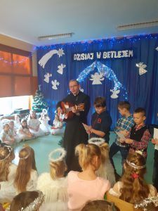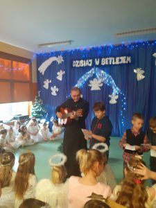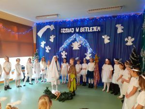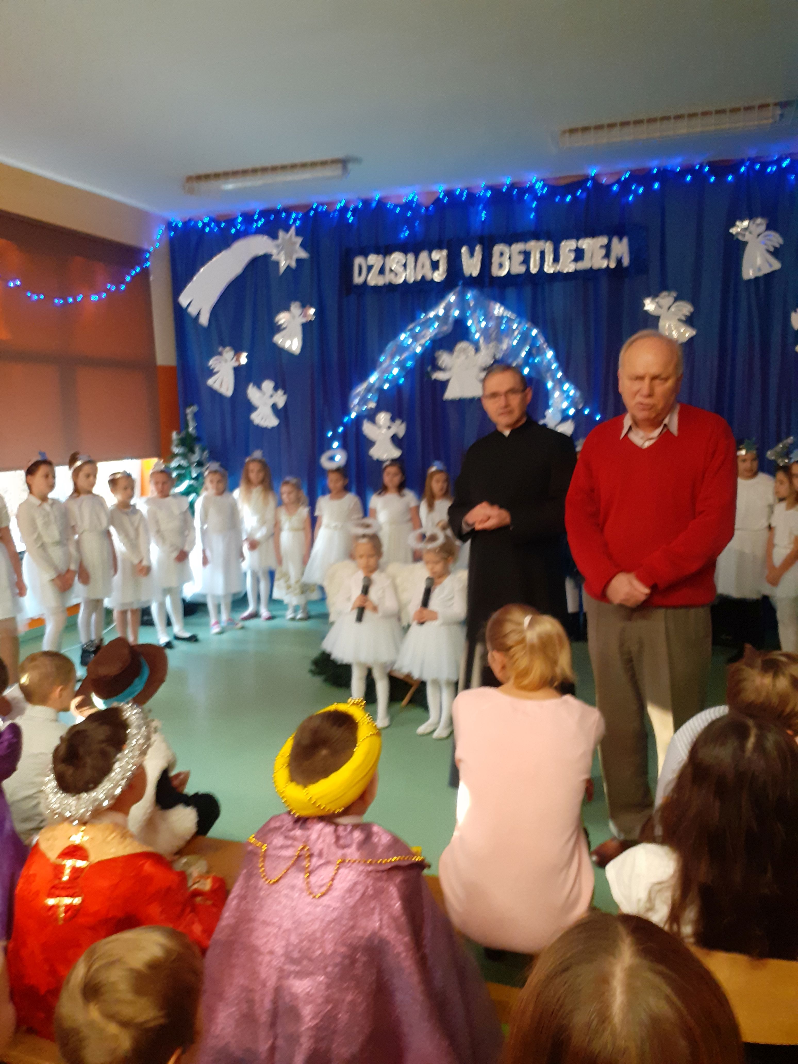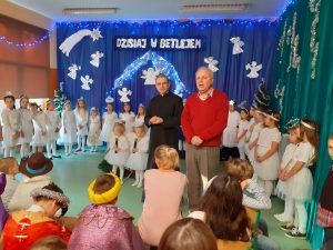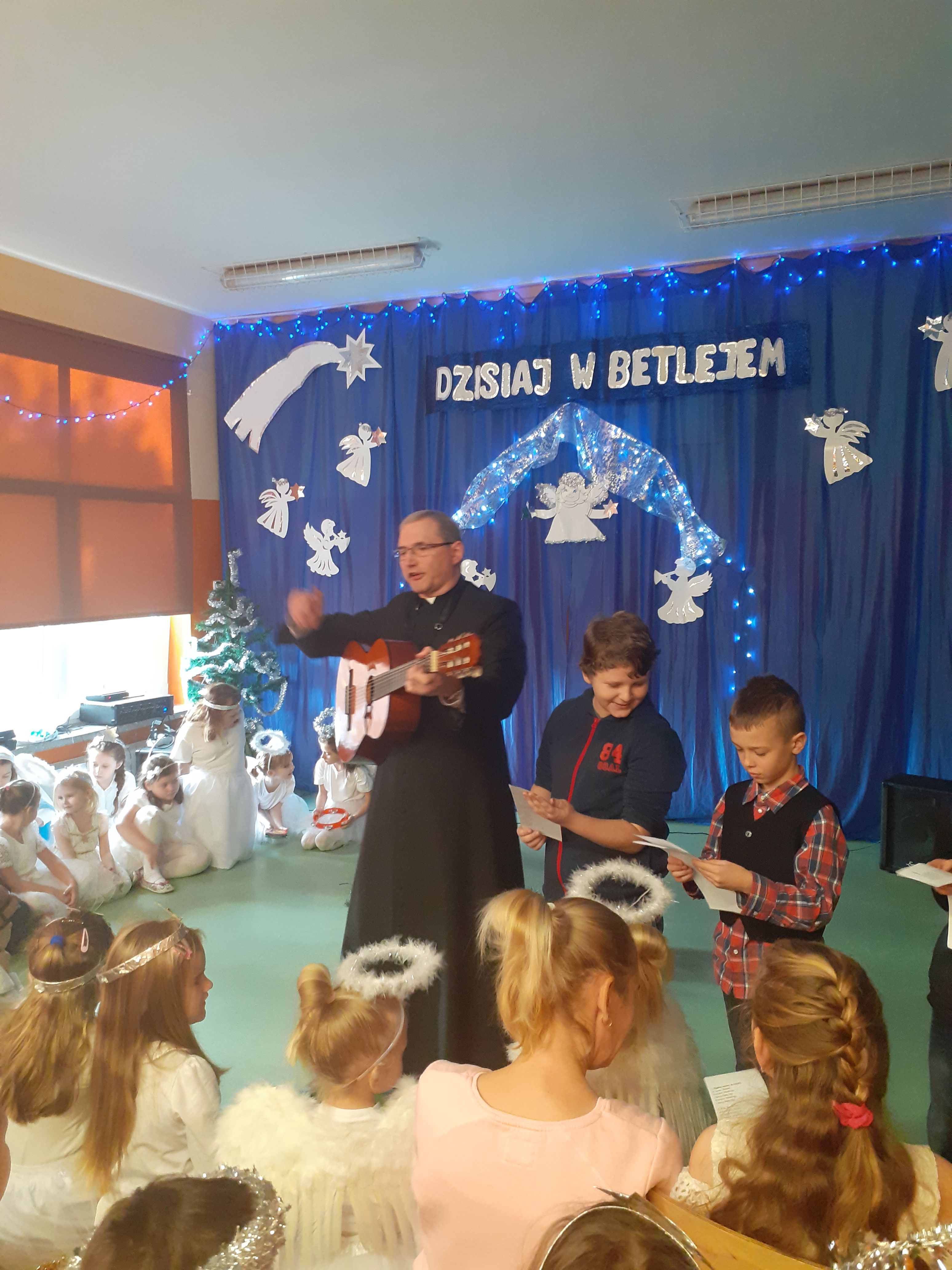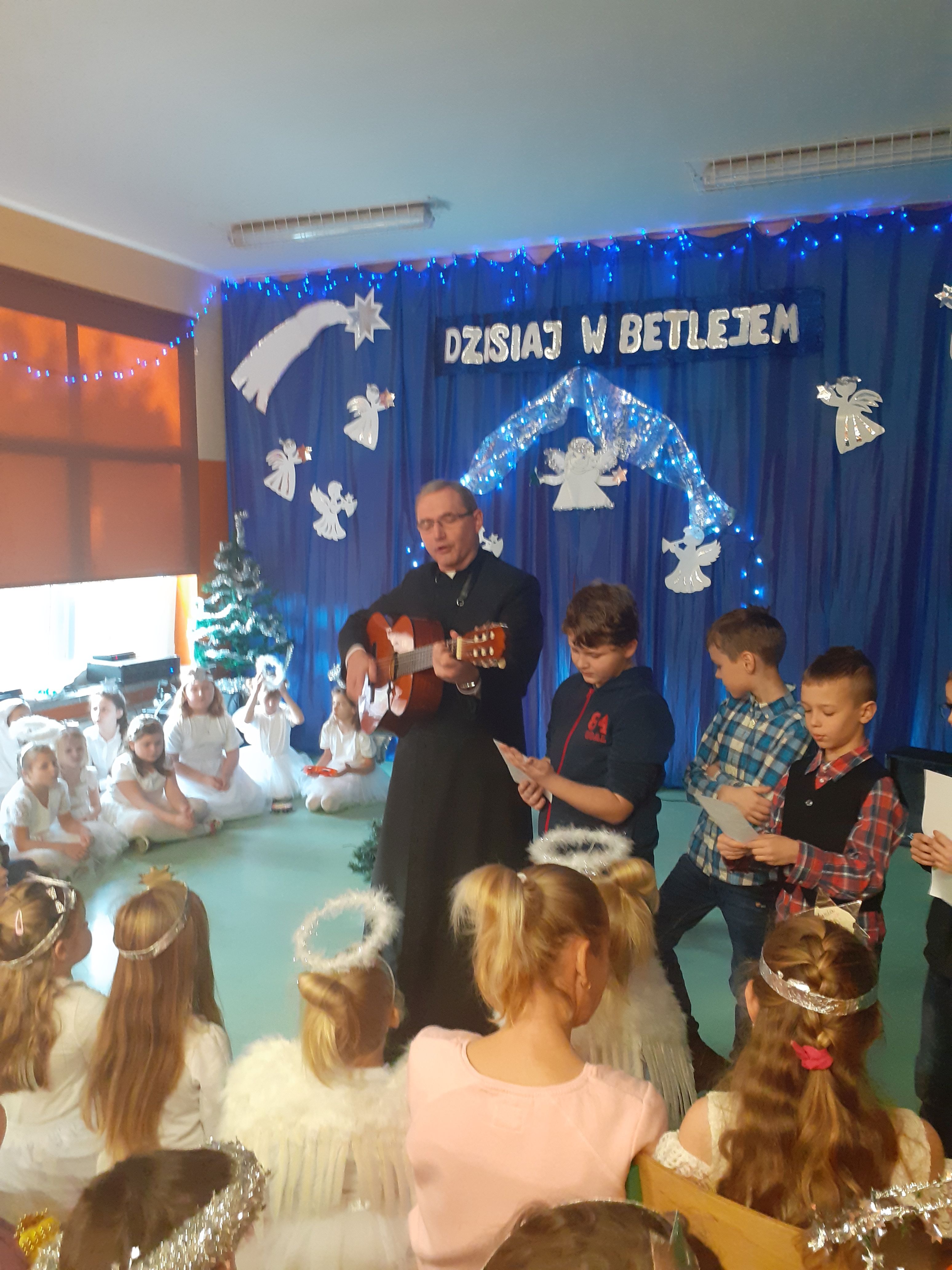 W świąteczną atmosferę wprowadzili nas uczniowie klas I – III, którzy przygotowali przedstawienie jasełkowe. Zaprezentowali je 20 grudnia, przypominając w ten sposób wydarzenia sprzed ponad dwóch tysięcy lat, kiedy to w Betlejem narodziło się Boże Dzieciątko. Dzieci wcieliły się w role Maryi i Józefa, pasterzy, aniołów. Do wspólnego kolędowania włączyli się uczniowie wraz z księdzem proboszczem, nauczyciele i rodzice.