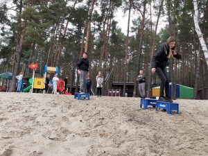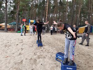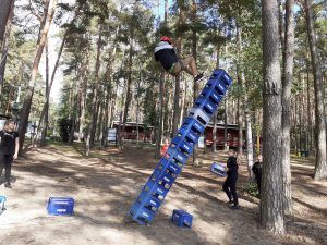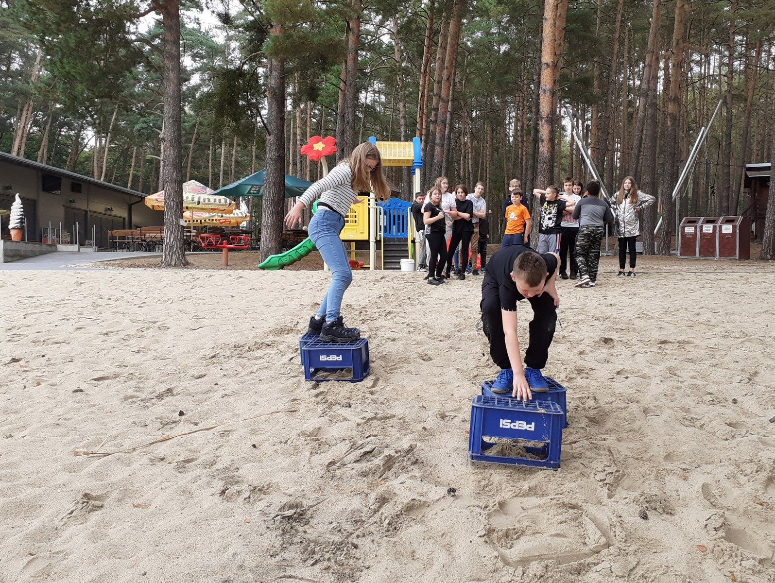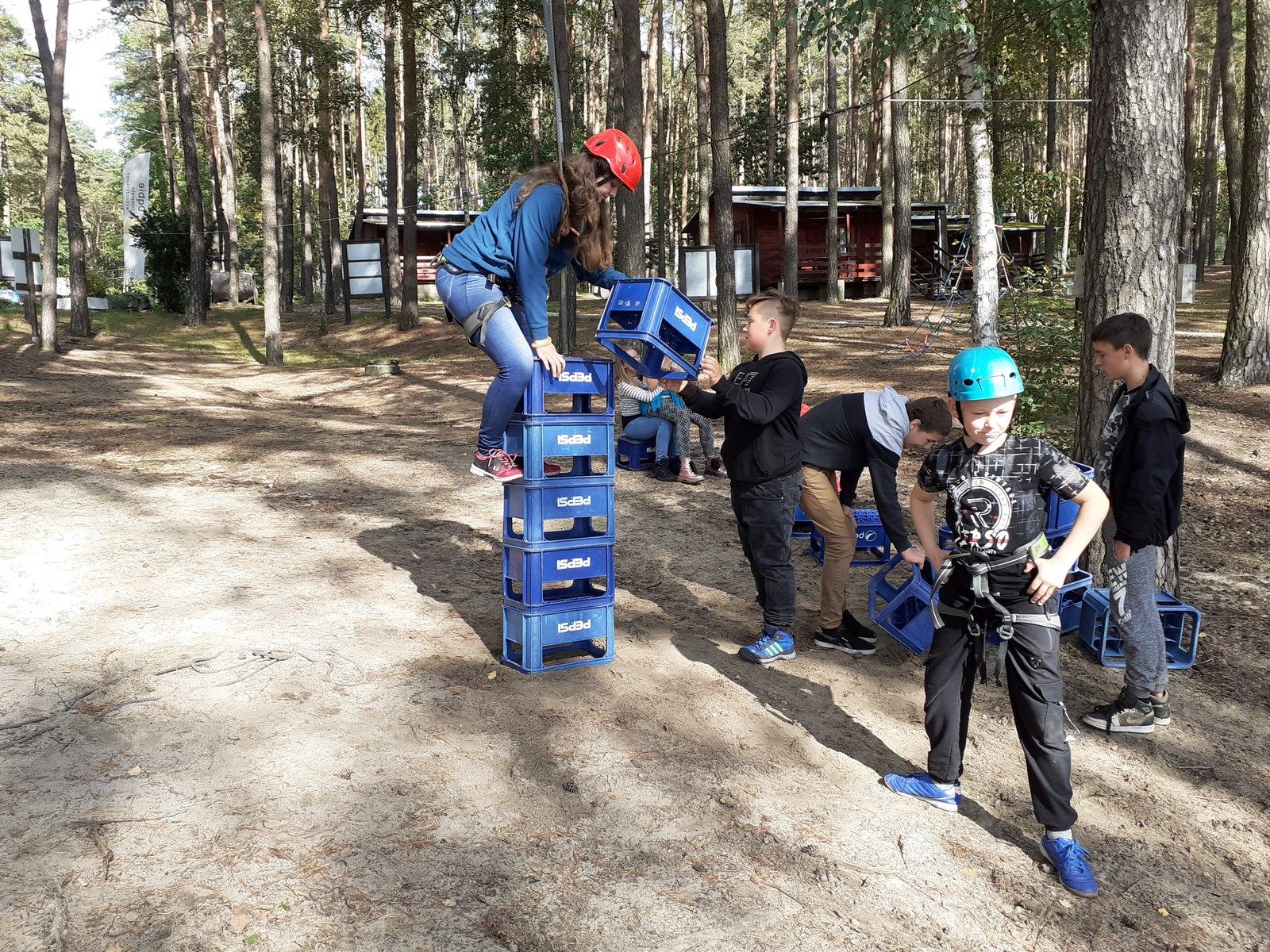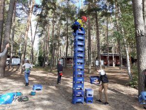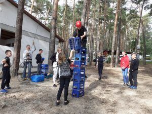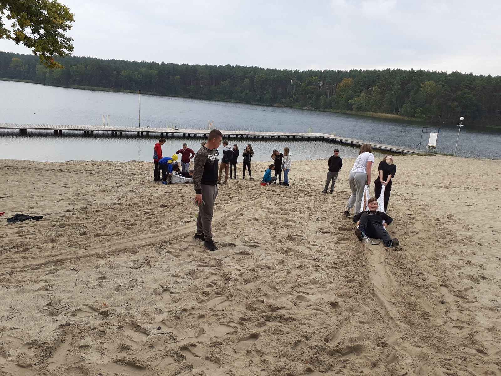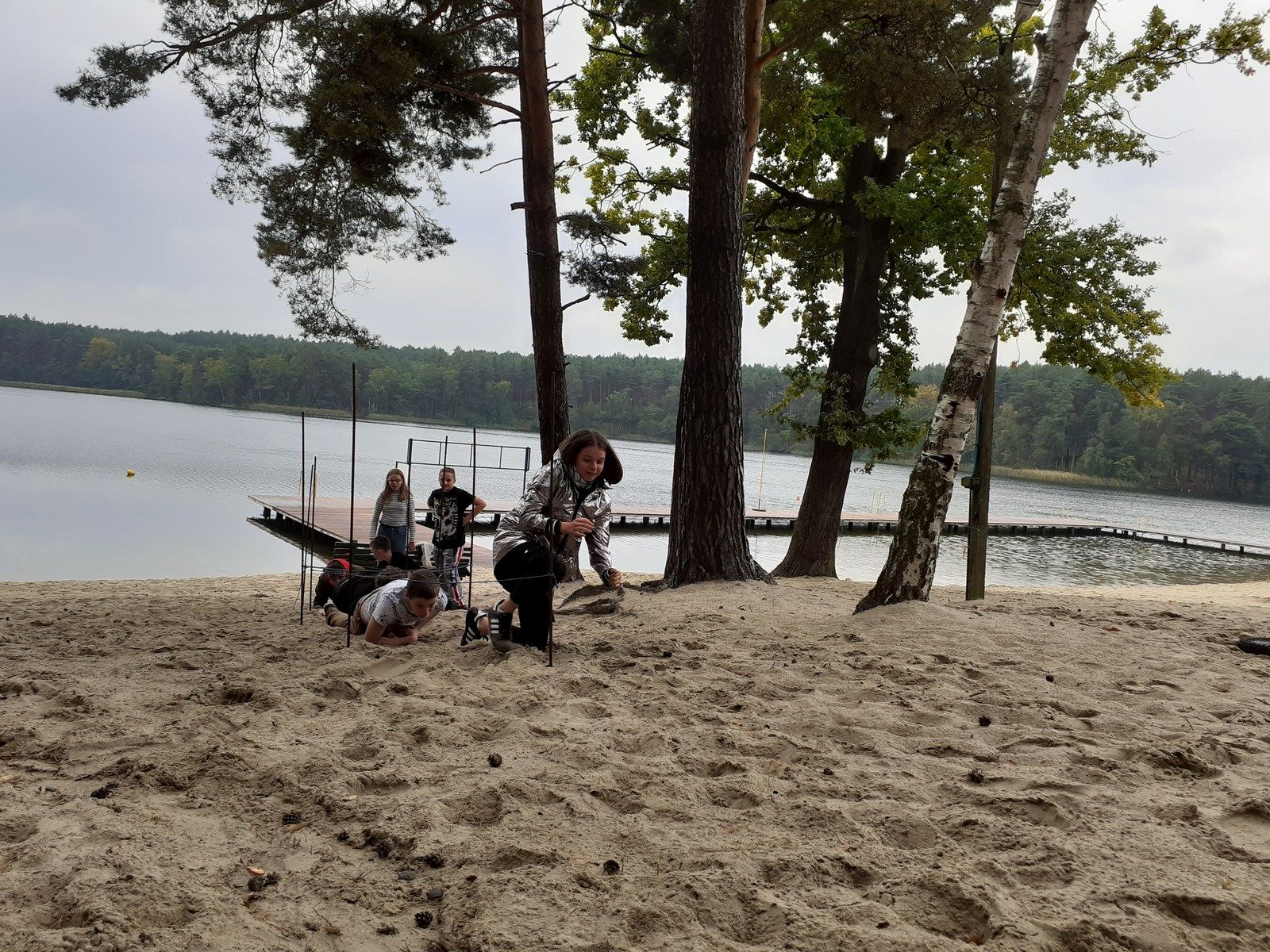 29 września – fantastyczny dzień nad jeziorem w Dąbiu. Rozpoczęliśmy od ” wojskowej ” rozgrzewki: przeskoków przez opony, czołgania po piasku. Później rywalizowaliśmy w biegu na skrzynkach, przelewaniu wody z jeziora i przenoszeniu rannych na noszach własnej konstrukcji. W lesie wznieśliśmy dwa wspaniałe szałasy, które spokojnie mogłyby posłużyć za „zielone klasy” w ” zielonej szkole”. Wzmocnieni smacznym obiadem rozpoczęliśmy indywidualną rywalizację we wspinaczce na wieżę z plastikowych skrzynek. Nie podejrzewaliśmy siebie o takie możliwości. Najpierw nieśmiało wchodziliśmy na 6, no może 7 skrzynek, żeby na koniec wznieść się na wysokość 16.
