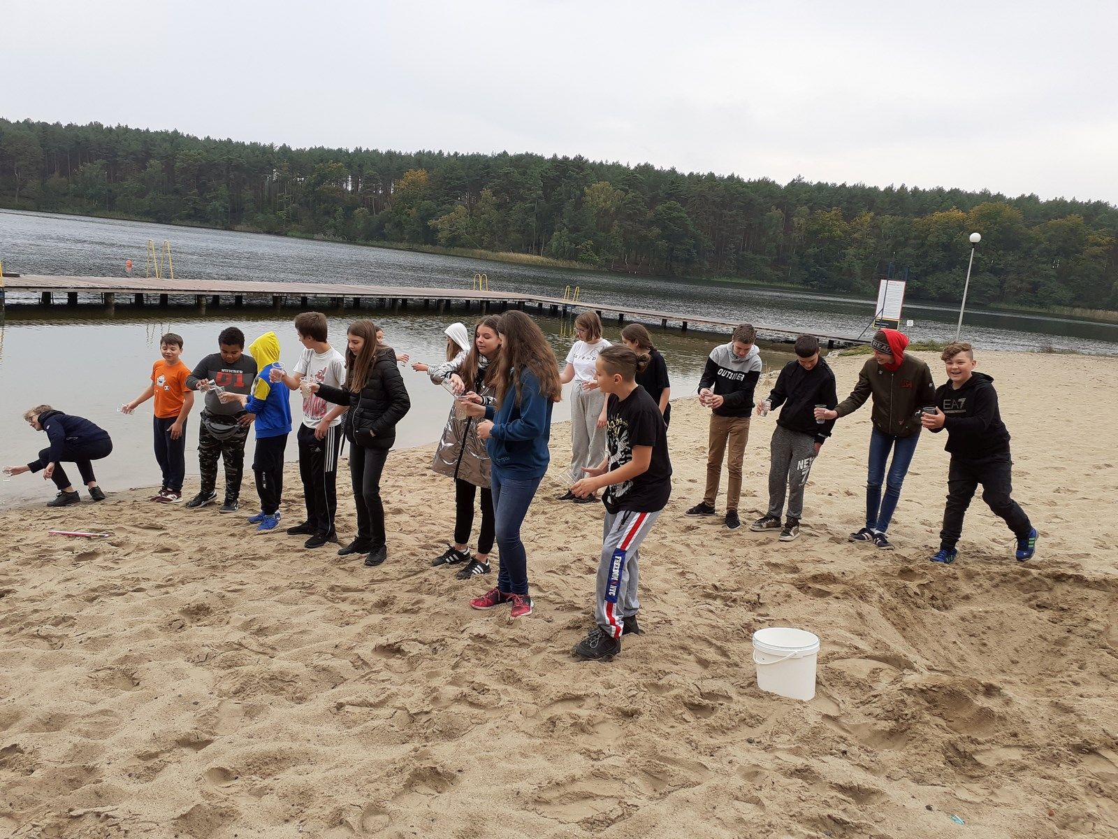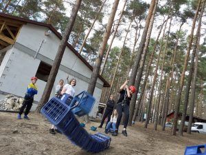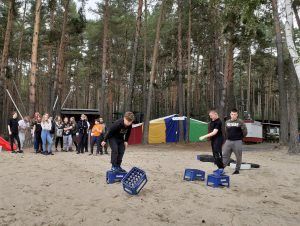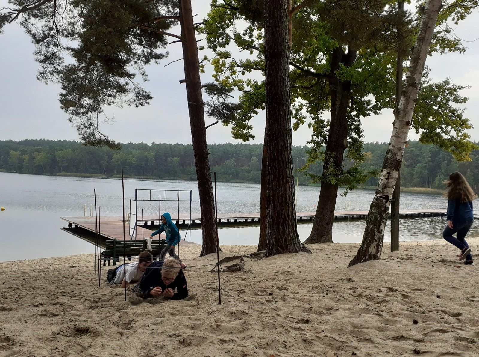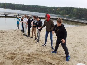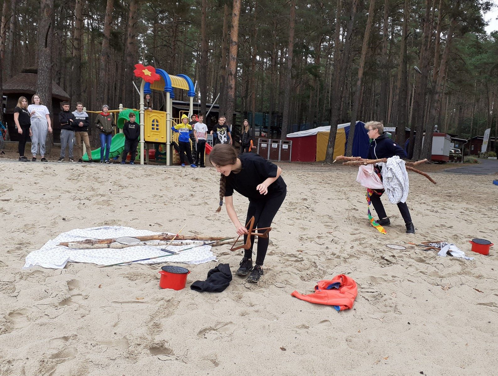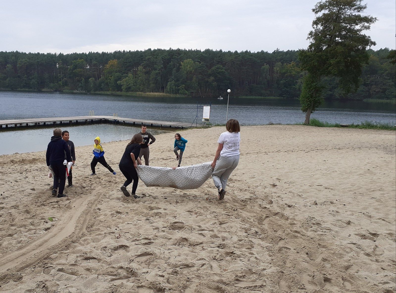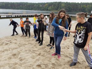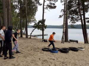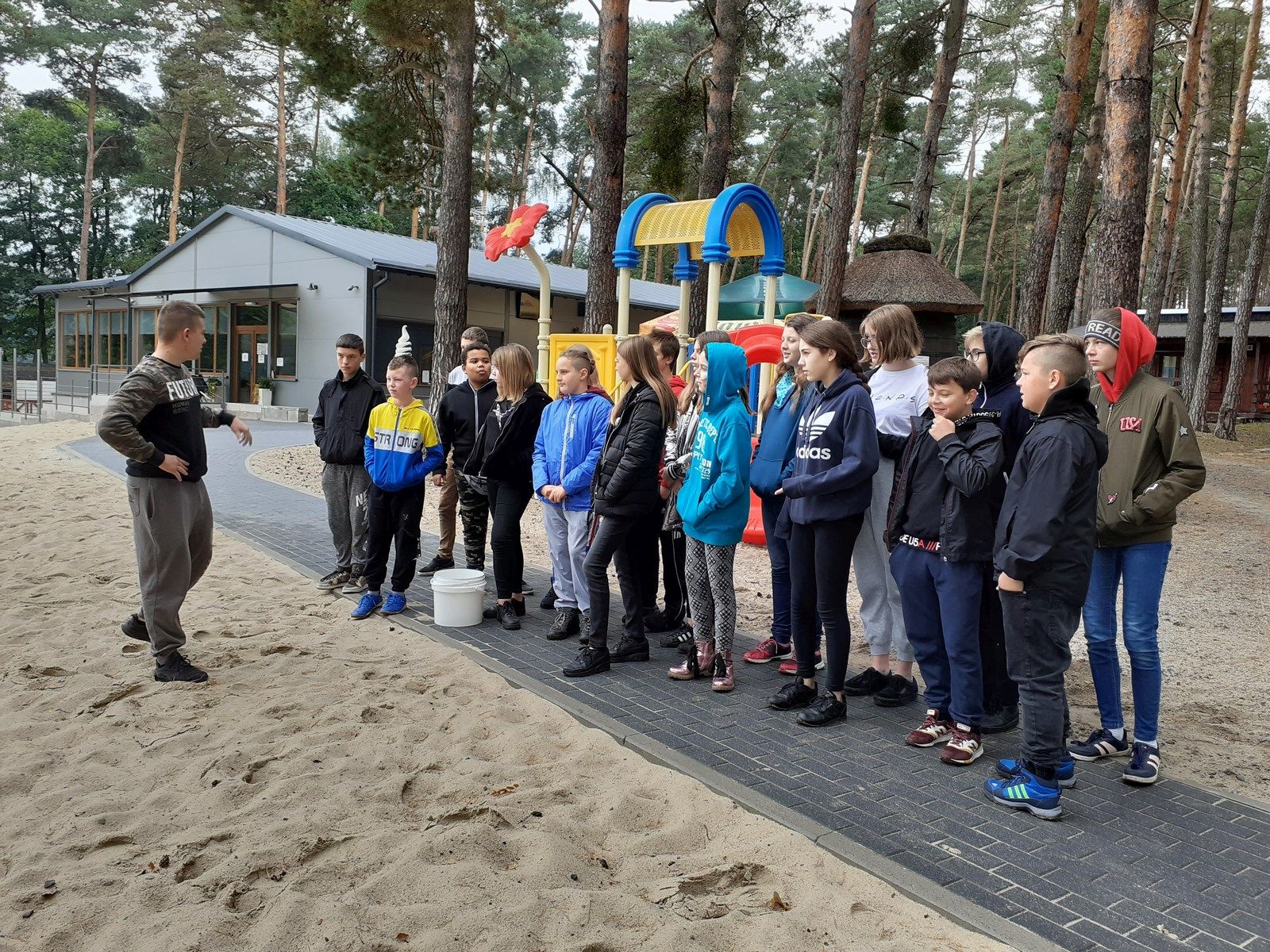 29 września – fantastyczny dzień nad jeziorem w Dąbiu. Rozpoczęliśmy od ” wojskowej ” rozgrzewki: przeskoków przez opony, czołgania po piasku. Później rywalizowaliśmy w biegu na skrzynkach, przelewaniu wody z jeziora i przenoszeniu rannych na noszach własnej konstrukcji. W lesie wznieśliśmy dwa wspaniałe szałasy, które spokojnie mogłyby posłużyć za „zielone klasy” w ” zielonej szkole”. Wzmocnieni smacznym obiadem rozpoczęliśmy indywidualną rywalizację we wspinaczce na wieżę z plastikowych skrzynek. Nie podejrzewaliśmy siebie o takie możliwości. Najpierw nieśmiało wchodziliśmy na 6, no może 7 skrzynek, żeby na koniec wznieść się na wysokość 16.