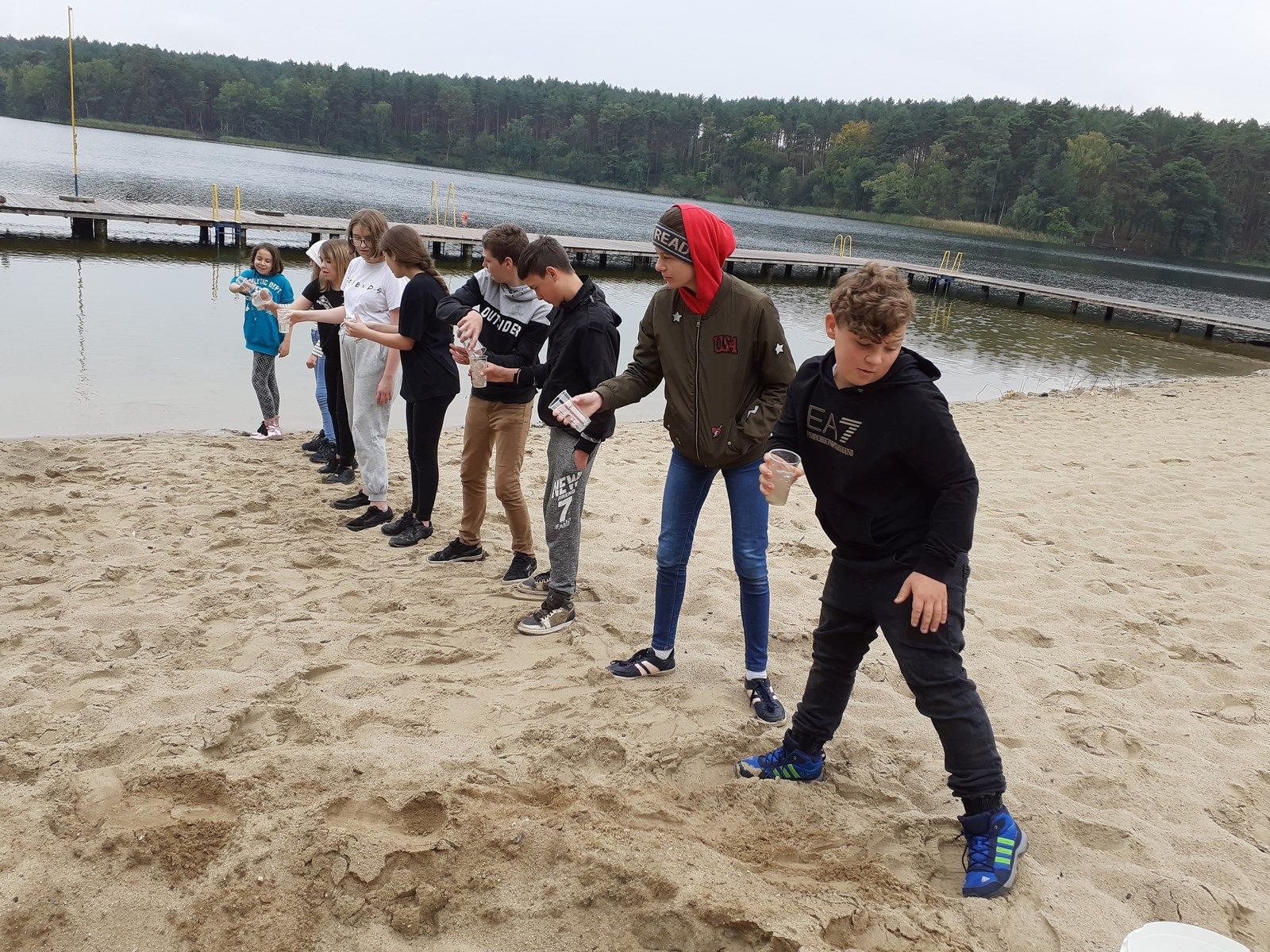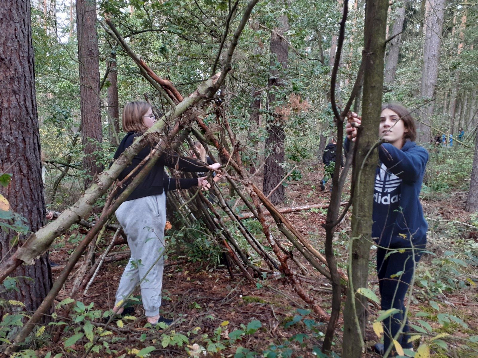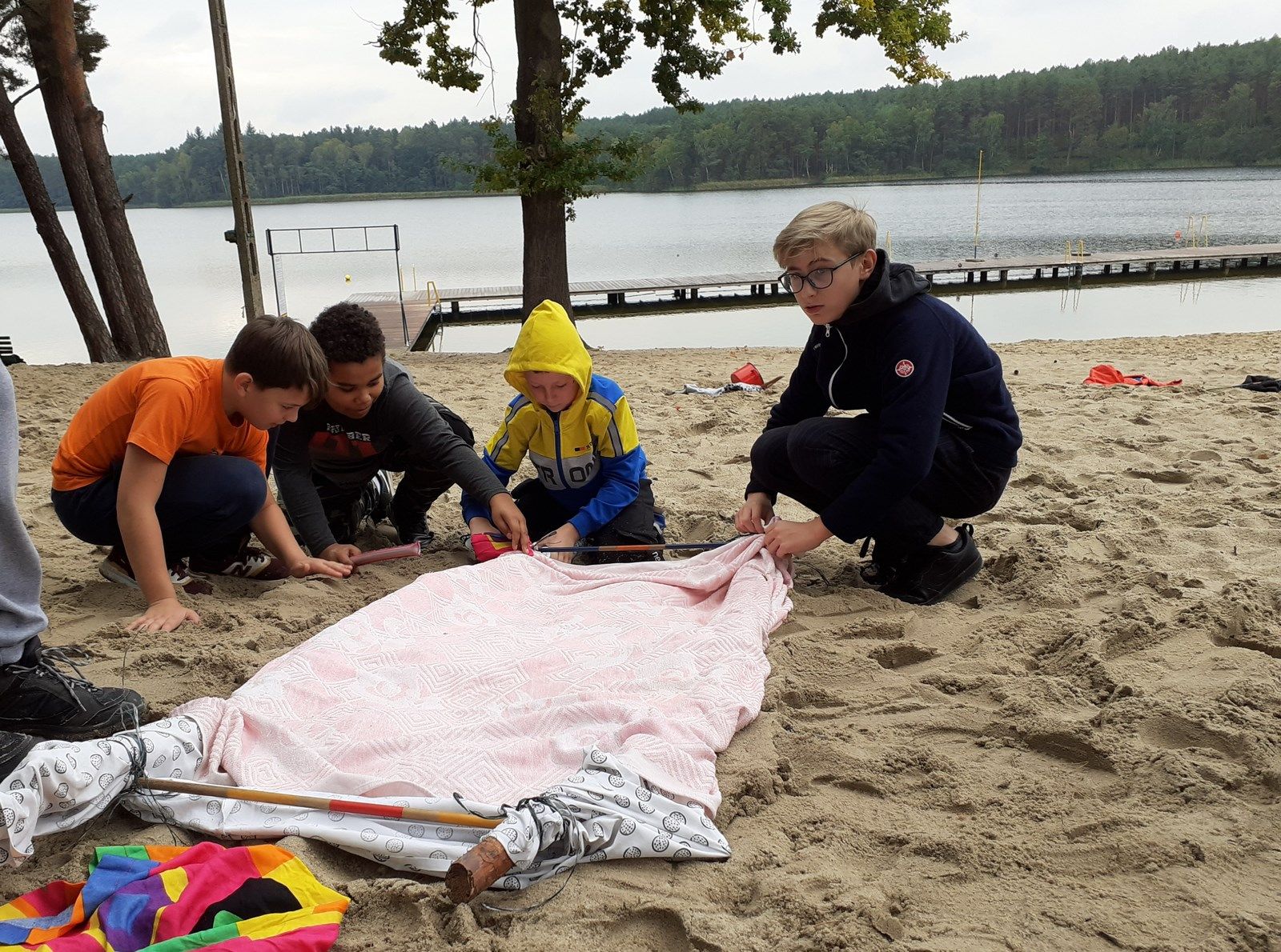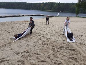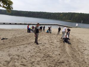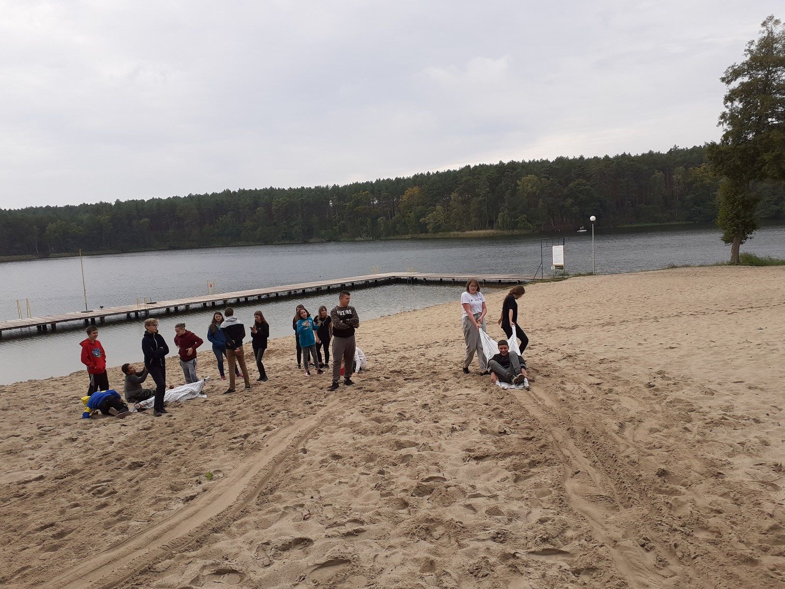 29 września – fantastyczny dzień nad jeziorem w Dąbiu. Rozpoczęliśmy od ” wojskowej ” rozgrzewki: przeskoków przez opony, czołgania po piasku. Później rywalizowaliśmy w biegu na skrzynkach, przelewaniu wody z jeziora i przenoszeniu rannych na noszach własnej konstrukcji. W lesie wznieśliśmy dwa wspaniałe szałasy, które spokojnie mogłyby posłużyć za „zielone klasy” w ” zielonej szkole”. Wzmocnieni smacznym obiadem rozpoczęliśmy indywidualną rywalizację we wspinaczce na wieżę z plastikowych skrzynek. Nie podejrzewaliśmy siebie o takie możliwości. Najpierw nieśmiało wchodziliśmy na 6, no może 7 skrzynek, żeby na koniec wznieść się na wysokość 16.