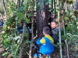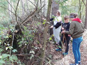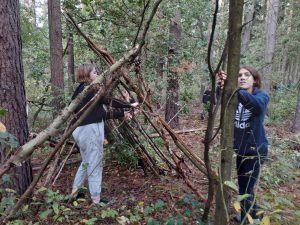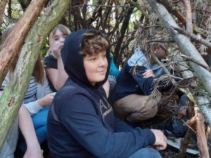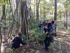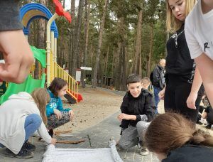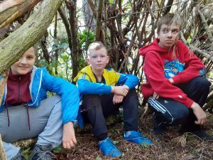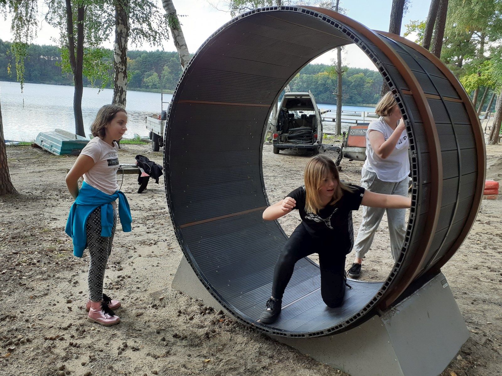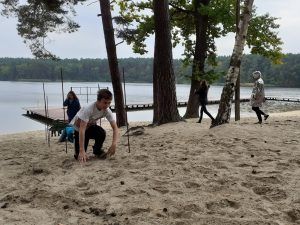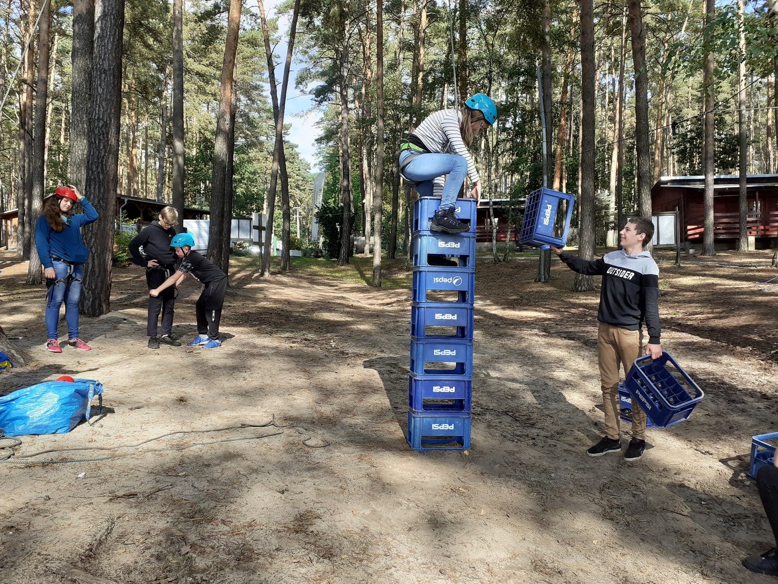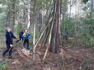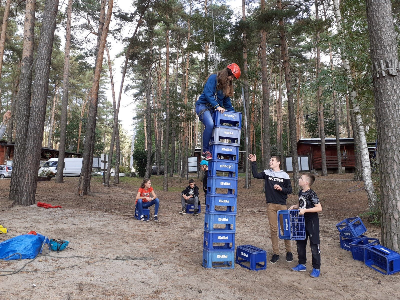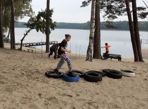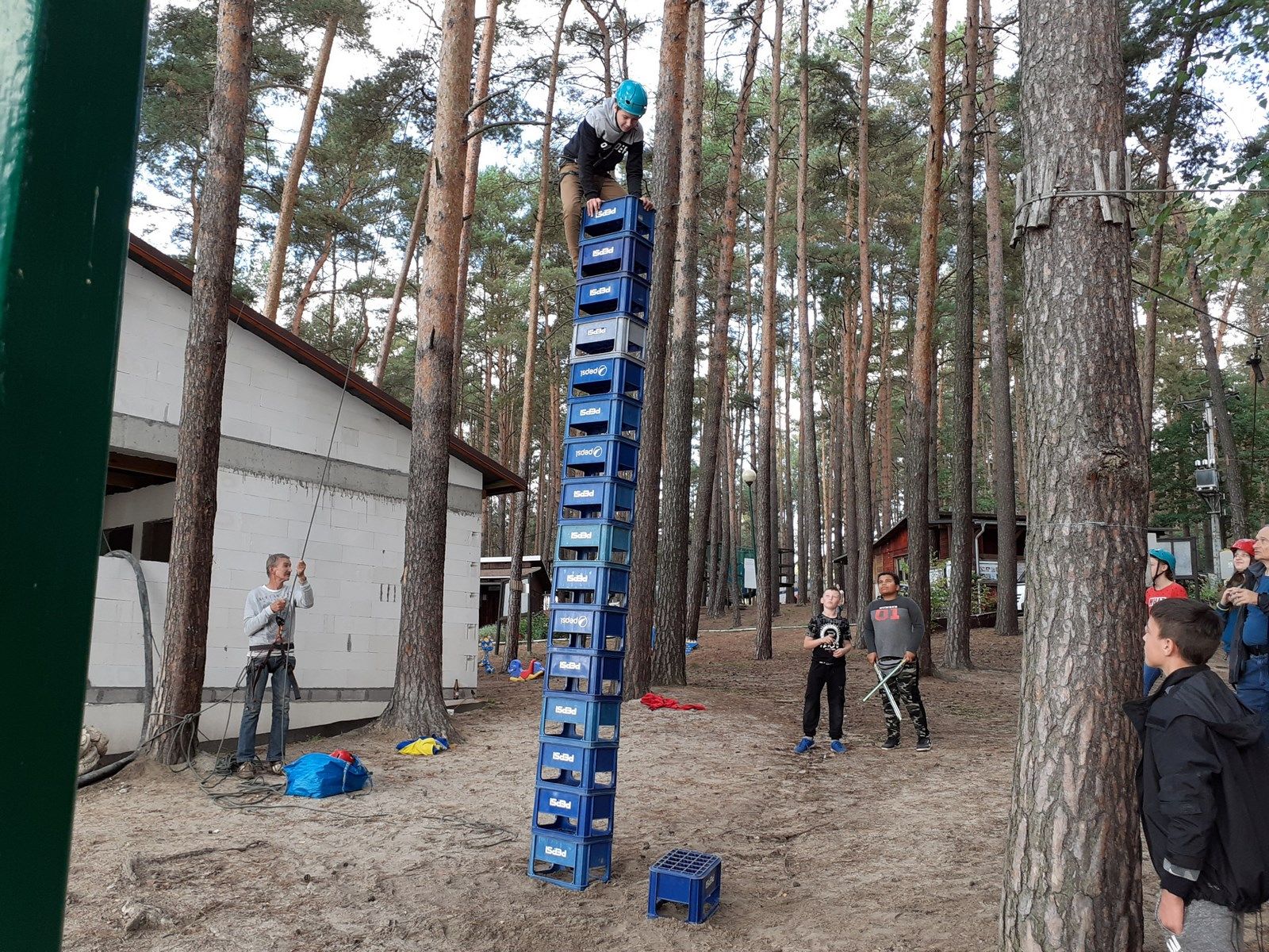29 września – fantastyczny dzień nad jeziorem w Dąbiu. Rozpoczęliśmy od ” wojskowej ” rozgrzewki: przeskoków przez opony, czołgania po piasku. Później rywalizowaliśmy w biegu na skrzynkach, przelewaniu wody z jeziora i przenoszeniu rannych na noszach własnej konstrukcji. W lesie wznieśliśmy dwa wspaniałe szałasy, które spokojnie mogłyby posłużyć za „zielone klasy” w ” zielonej szkole”. Wzmocnieni smacznym obiadem rozpoczęliśmy indywidualną rywalizację we wspinaczce na wieżę z plastikowych skrzynek. Nie podejrzewaliśmy siebie o takie możliwości. Najpierw nieśmiało wchodziliśmy na 6, no może 7 skrzynek, żeby na koniec wznieść się na wysokość 16.