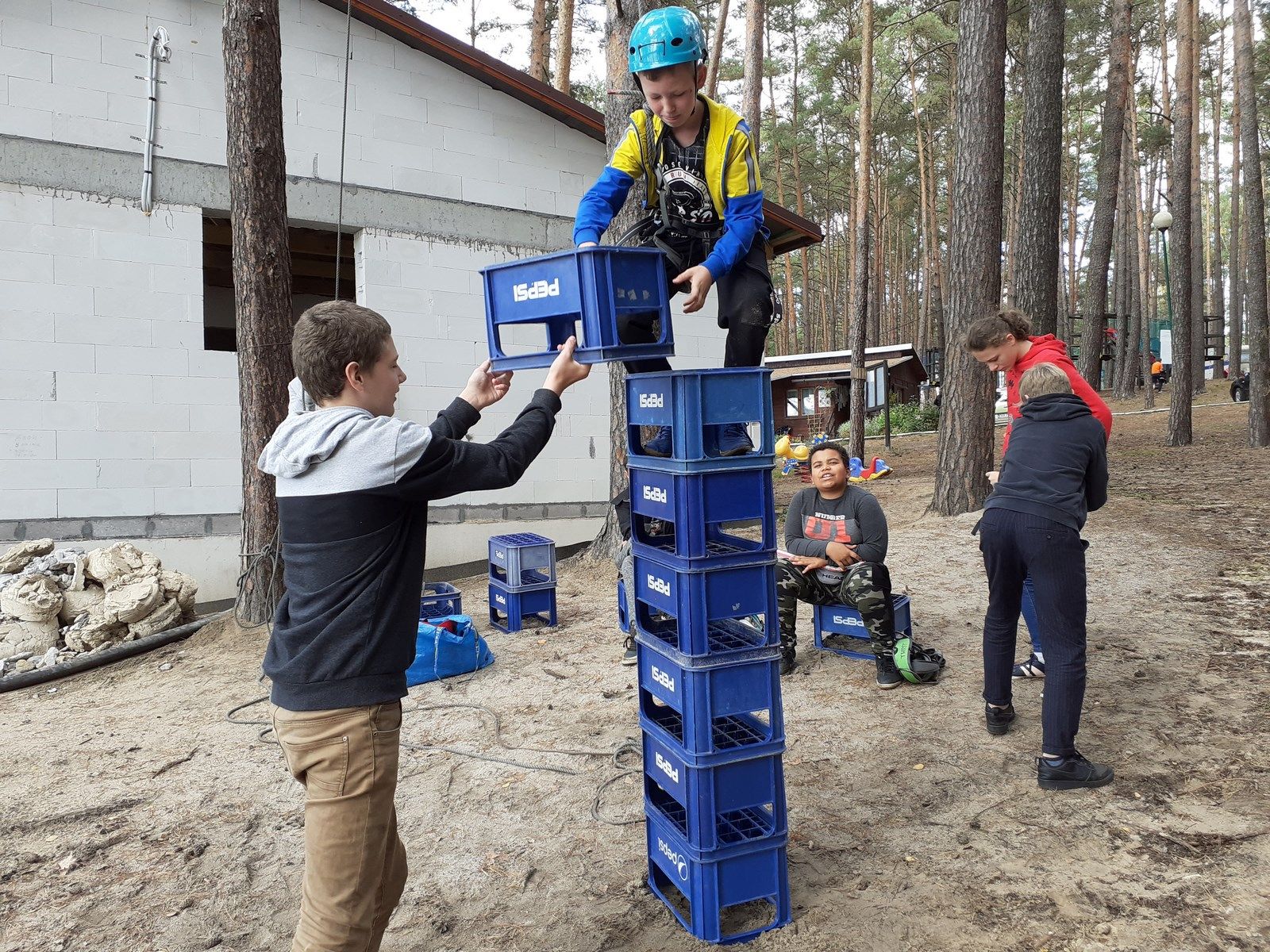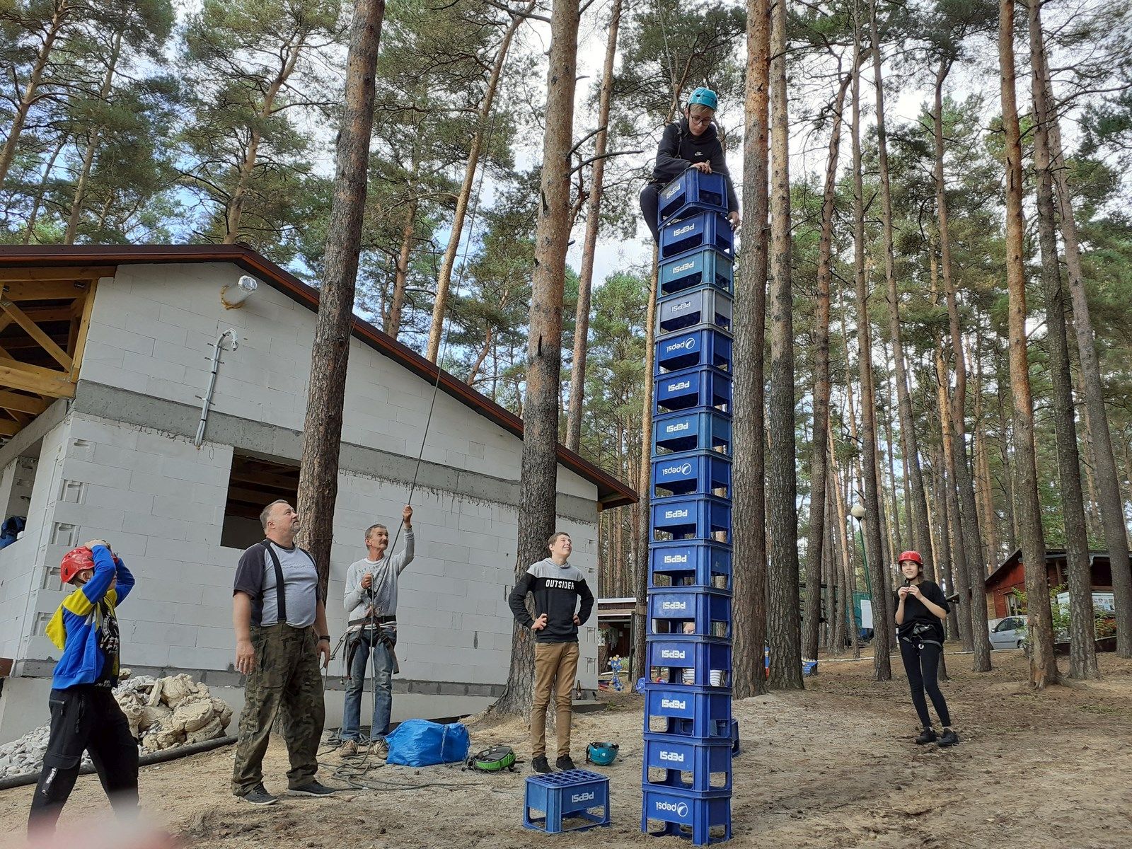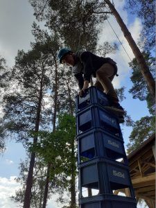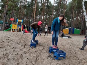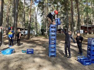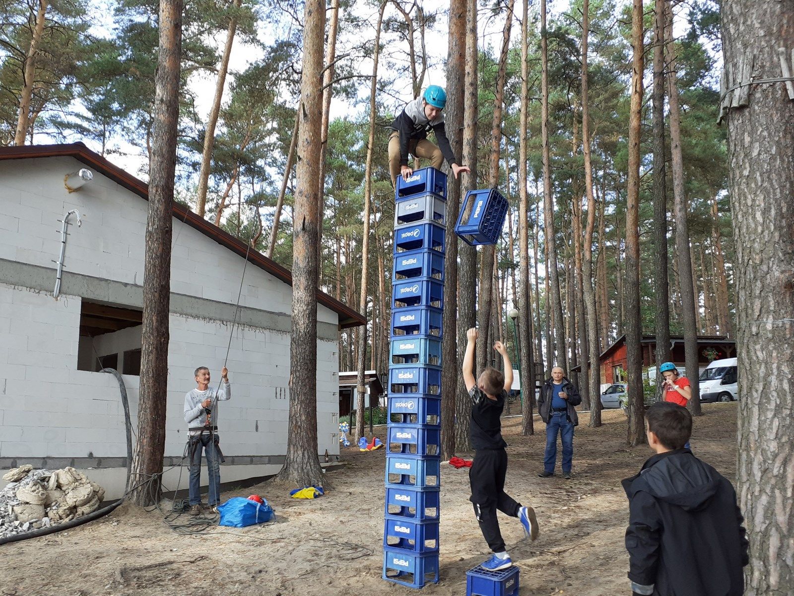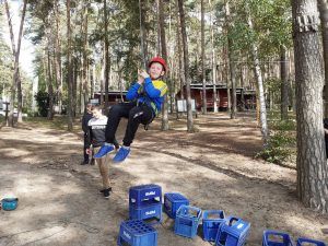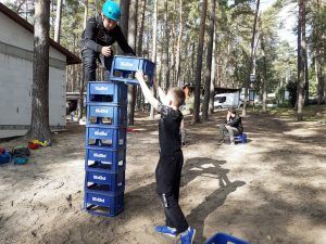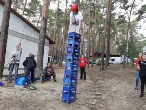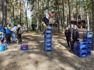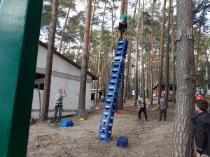 Mistrzem okazał się Dima ( 16 skrzynek). Drugą wysokość – 15 skrzynek, osiągnął Mikołaj. Tuż za nim, na trzecim miejscu znalazł się Sebastian – 14 skrzynek. Dziewczyny też kapitalnie sobie radziły. Swoją sprawność mogliśmy sprawdzić też w parku linowym i „chomiczym” kołowrotku. Kulinarne umiejętności wykorzystaliśmy podczas samodzielnego przygotowywania pizzy. Wyszła pyszna i jak zwykle za mała.