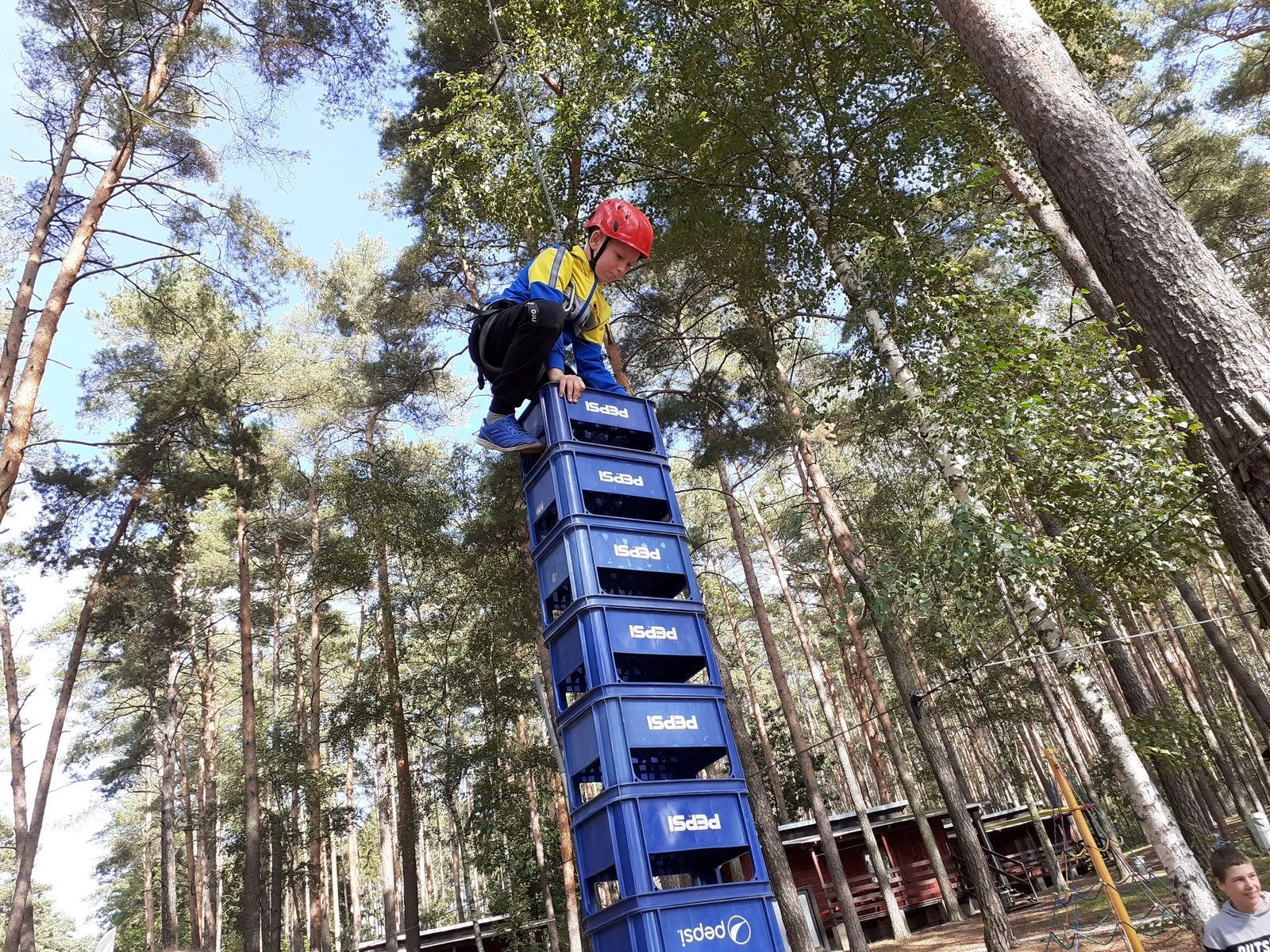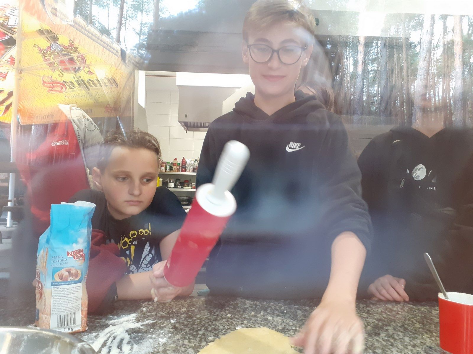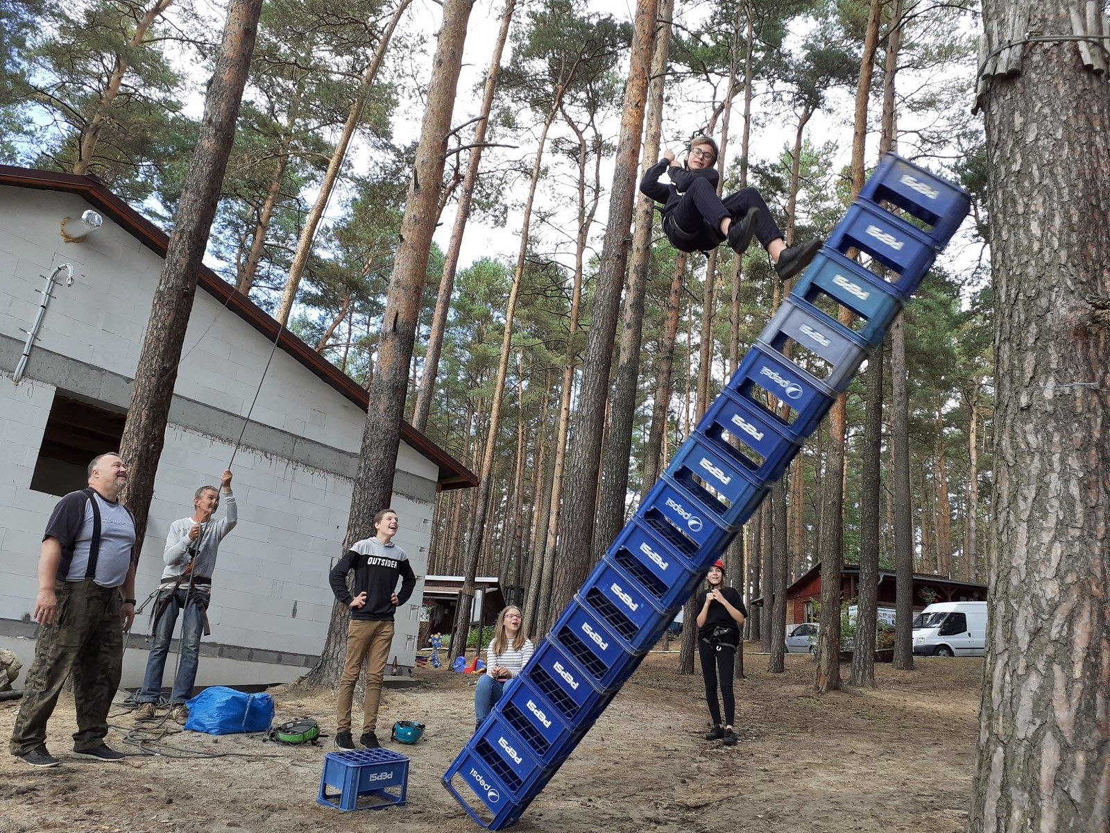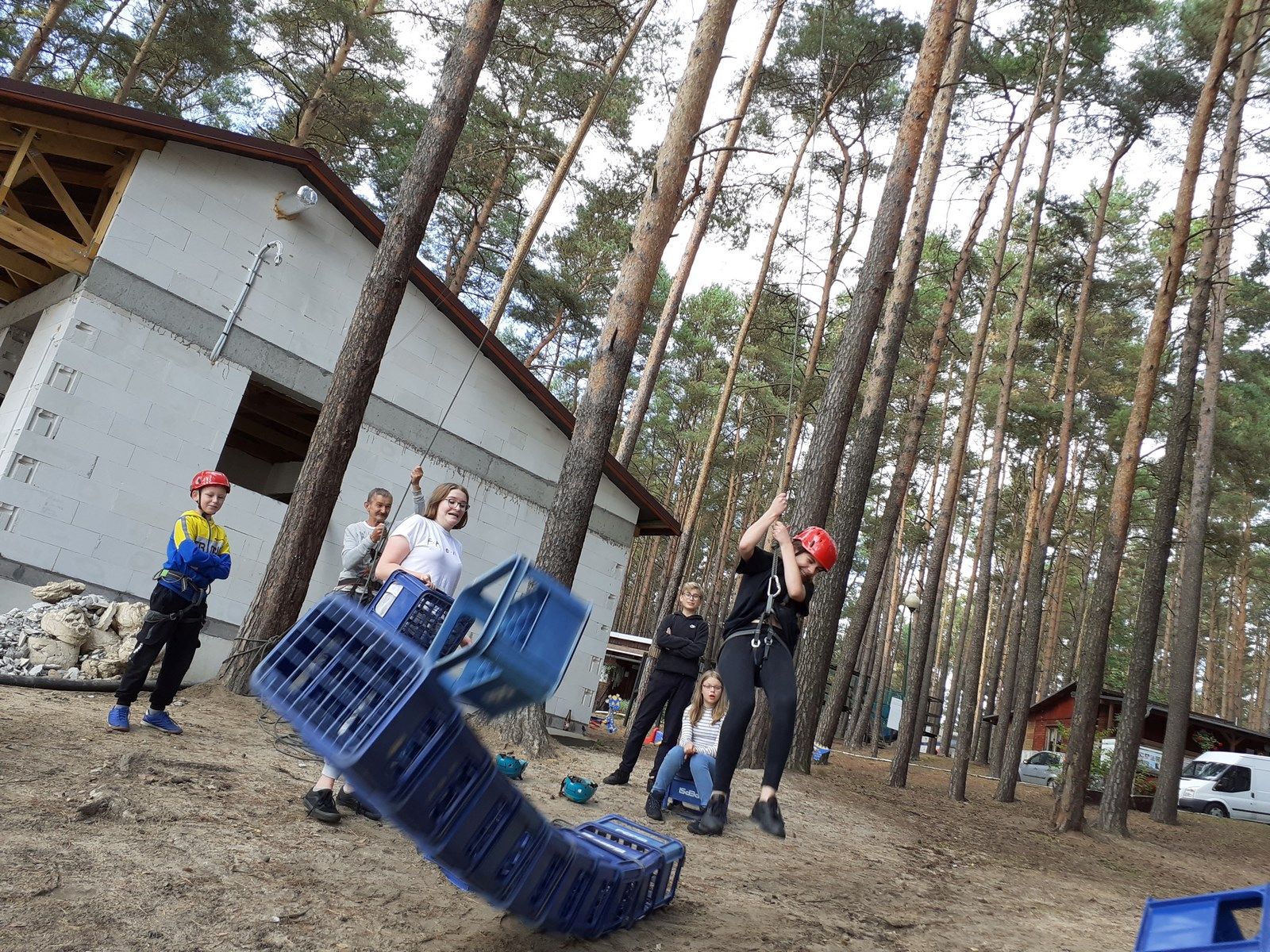 Mistrzem okazał się Dima ( 16 skrzynek). Drugą wysokość – 15 skrzynek, osiągnął Mikołaj. Tuż za nim, na trzecim miejscu znalazł się Sebastian – 14 skrzynek. Dziewczyny też kapitalnie sobie radziły. Swoją sprawność mogliśmy sprawdzić też w parku linowym i „chomiczym” kołowrotku. Kulinarne umiejętności wykorzystaliśmy podczas samodzielnego przygotowywania pizzy. Wyszła pyszna i jak zwykle za mała.