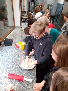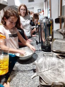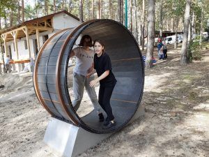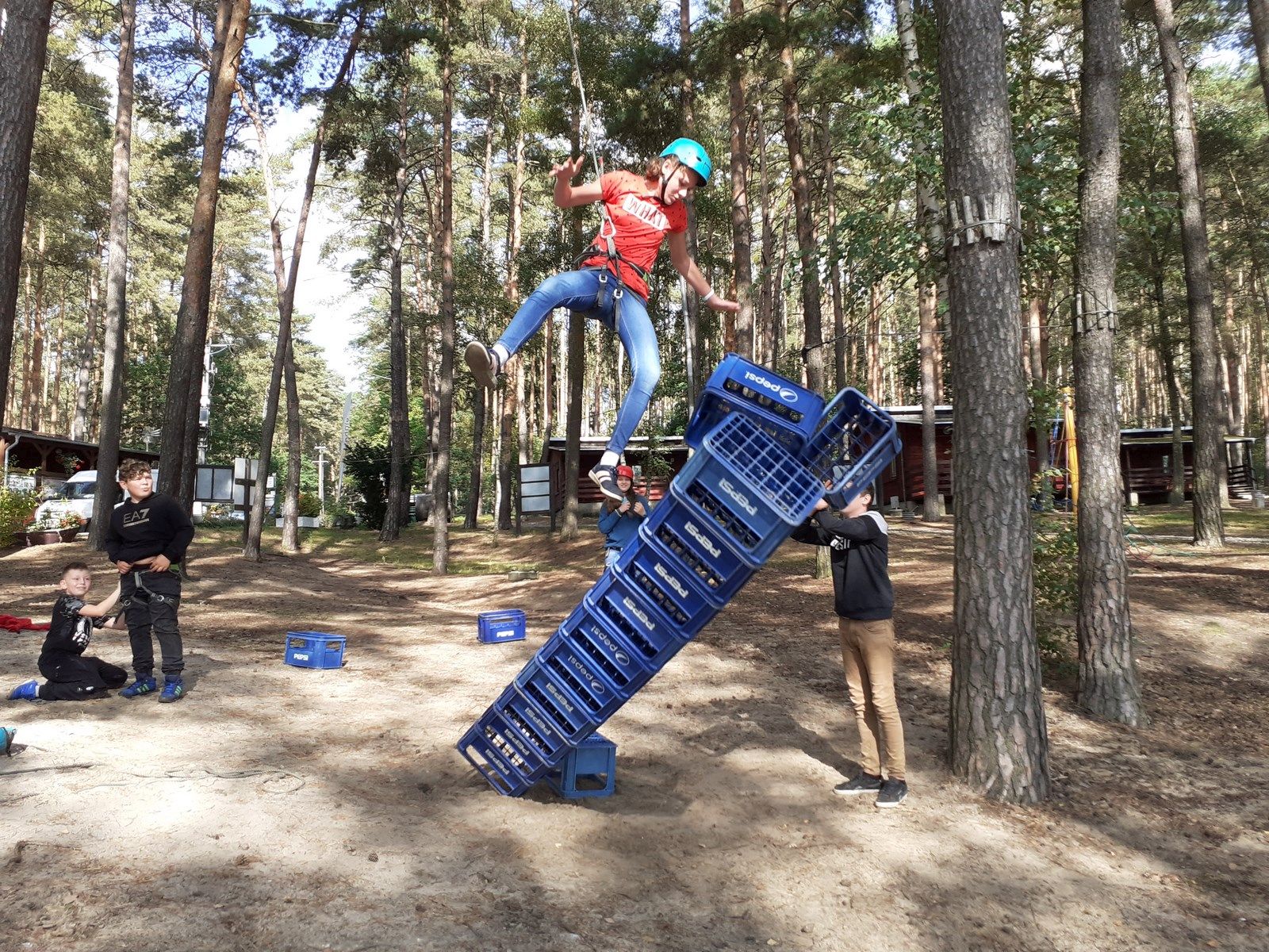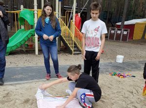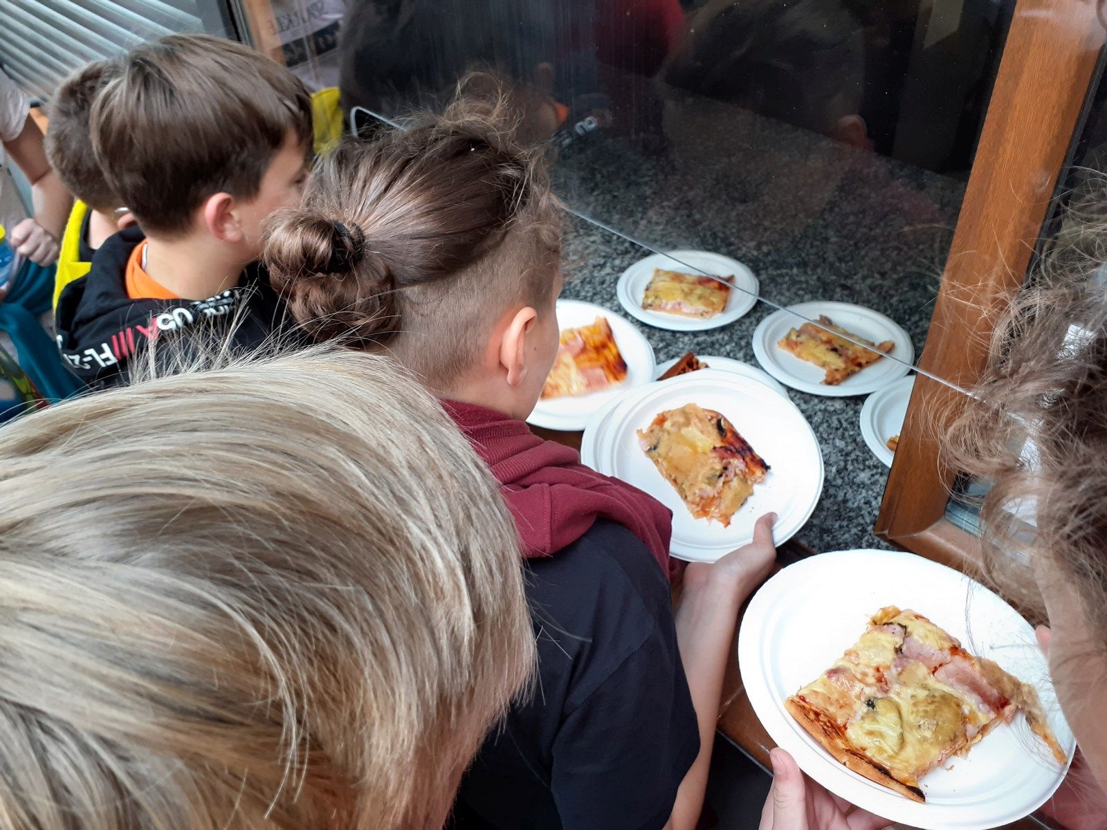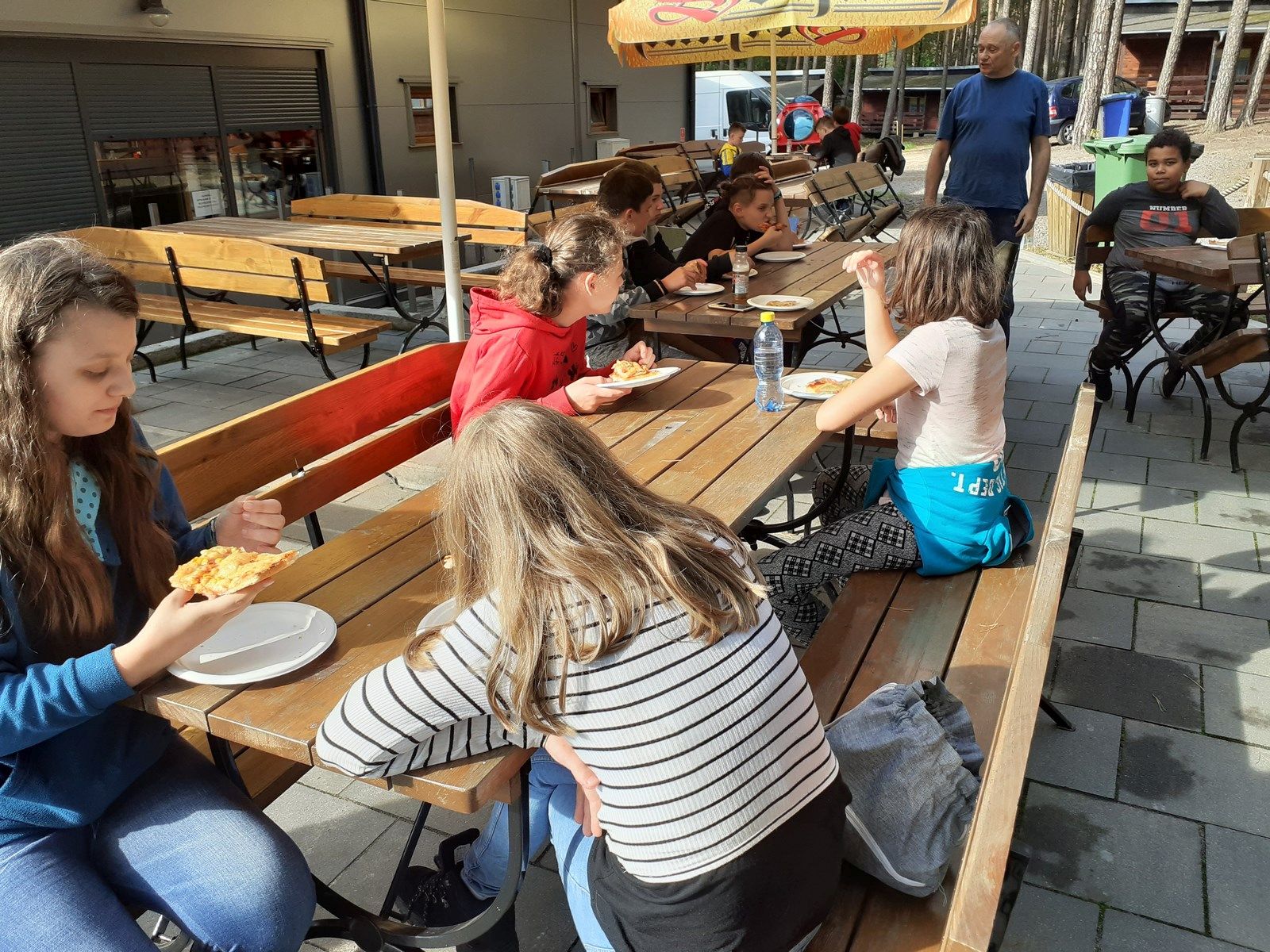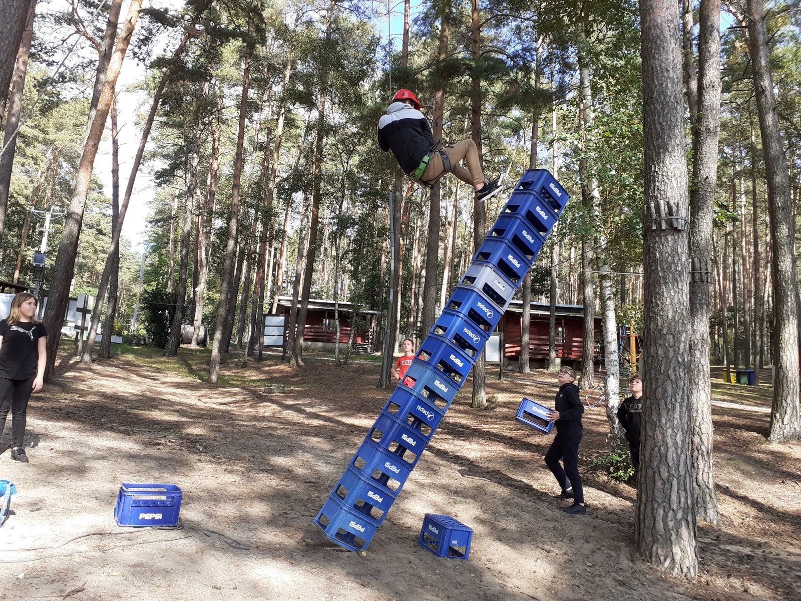 Mistrzem okazał się Dima ( 16 skrzynek). Drugą wysokość – 15 skrzynek, osiągnął Mikołaj. Tuż za nim, na trzecim miejscu znalazł się Sebastian – 14 skrzynek. Dziewczyny też kapitalnie sobie radziły. Swoją sprawność mogliśmy sprawdzić też w parku linowym i „chomiczym” kołowrotku. Kulinarne umiejętności wykorzystaliśmy podczas samodzielnego przygotowywania pizzy. Wyszła pyszna i jak zwykle za mała.