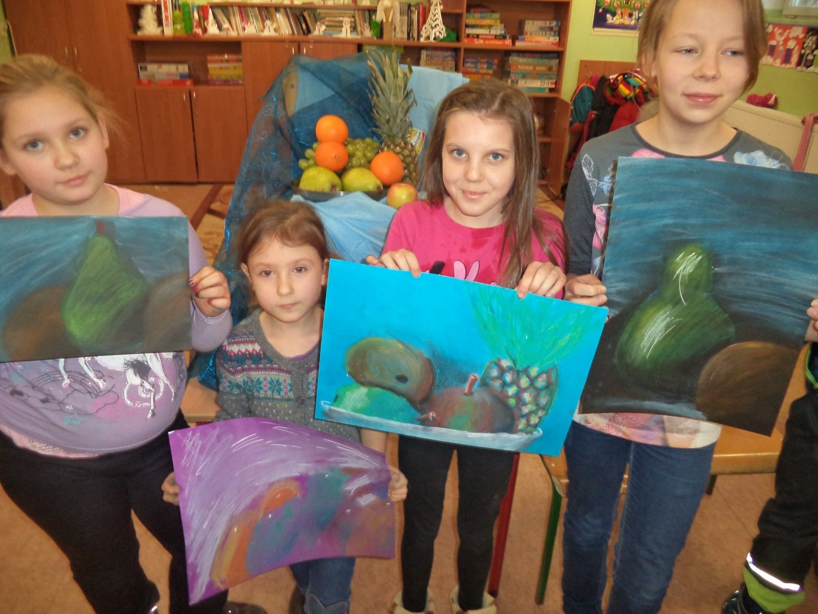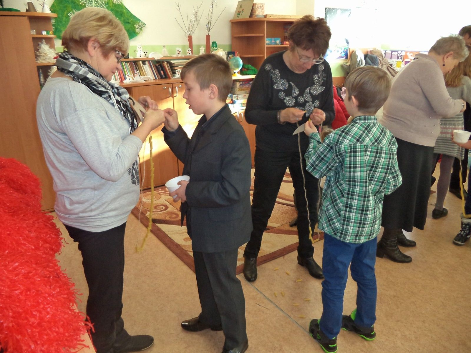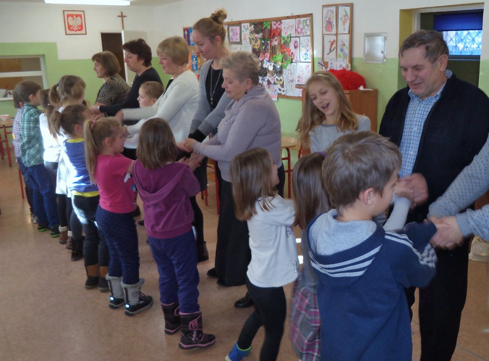 W pierwszym tygodniu ferii zimowych świetlica zaproponowała dzieciom wiele ciekawych form spędzenia wolnego czasu. W poniedziałek można było wykazać się zdolnościami kulinarnymi i plastycznymi. Martwa natura znanych mistrzów zainspirowała dzieci do namalowania własnych prac. Owoce wystąpiły w podwójnej roli: najpierw modeli a później smacznych i pełnych witamin szaszłyków. Wtorek był dniem aktywności fizycznej. Sprawność, dyscyplinę i samokontrolę doskonalono podczas treningu karate. Dzięki zimowej aurze odbyło się bicie rekordu długości zjazdu na sankach, jabłuszkach, nartach i… czym się da. Środa przebiegła na filmowym spotkaniu z ” Fistaszkami” i super zabawie w Sali zabaw AREK. Czwartek upłynął znów pod znakiem sportu. Najpierw pobyt na pływalni a później zwiedzanie stadionu żużlowego i zajęcia poprowadzone przez koordynatorki Klubu Falubaz. Do piątkowego spotkania przygotowania rozpoczęliśmy już w pierwszym dniu ferii. 22 stycznia zaprosiliśmy do świetlicy Babcie i Dziadków. Przygotowaliśmy smaczny poczęstunek, występy wokalne, taneczne i kabaretowe oraz zaprosiliśmy gości do wspólnej zabawy. Nawlekanie makaronowych korali, wznoszenie wież z plastikowych kubeczków, przenoszenie zakupów, rozpoznawanie dłoni, pakowanie prezentów, nadmuchiwanie balonów, wspólne tańce… sprawiły, że uśmiech nie znikał z twarzy młodszych i starszych uczestników. Świetnie się bawiliśmy!