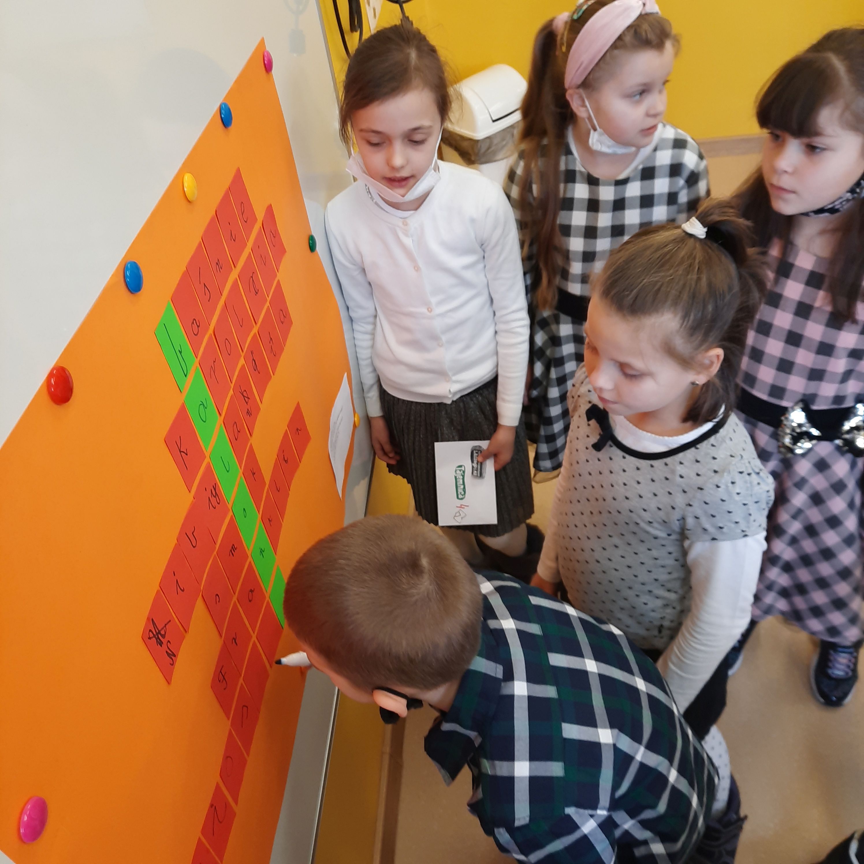 Na zdjęciu widać uczniów klasy pierwszej, którzy rozwiązują krzyżówkę dotyczącą ulubionych bohaterów dziecięcych książek.