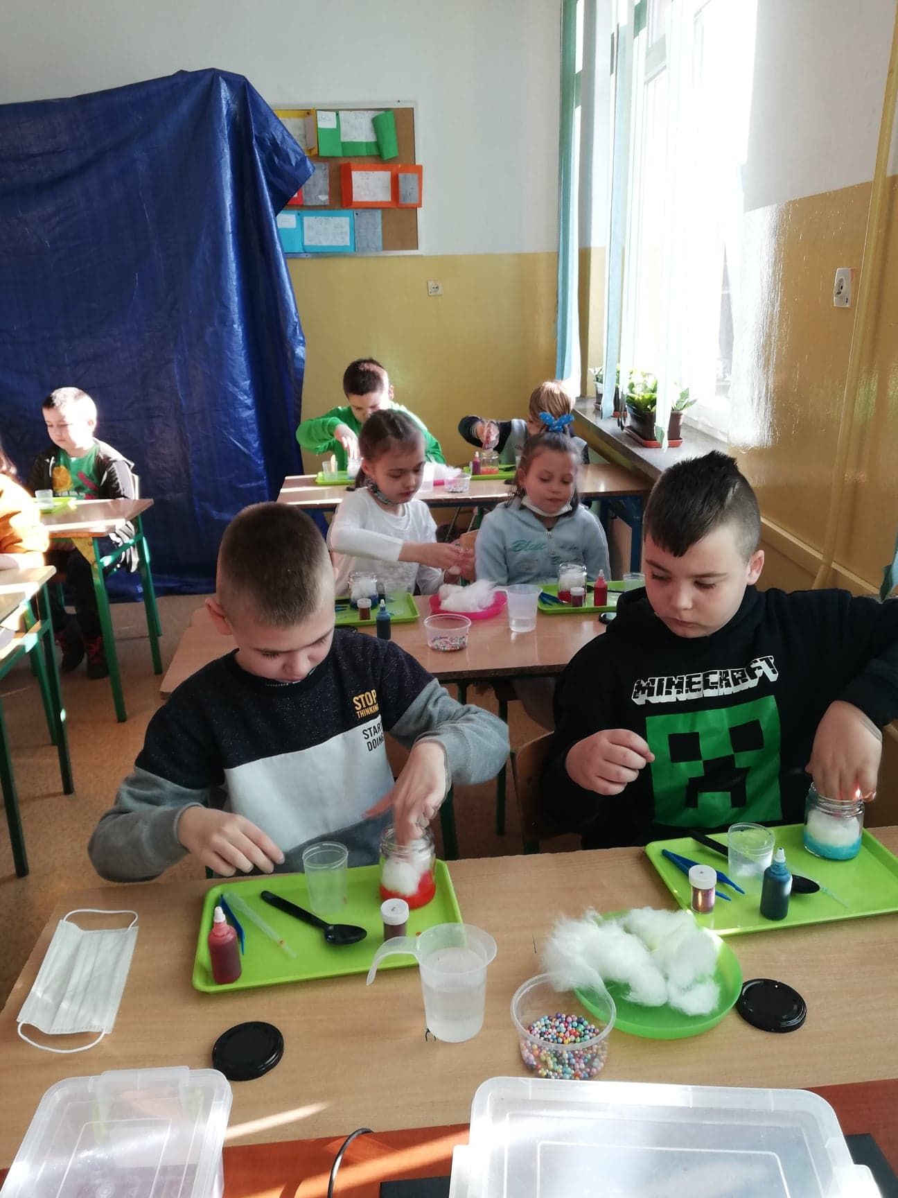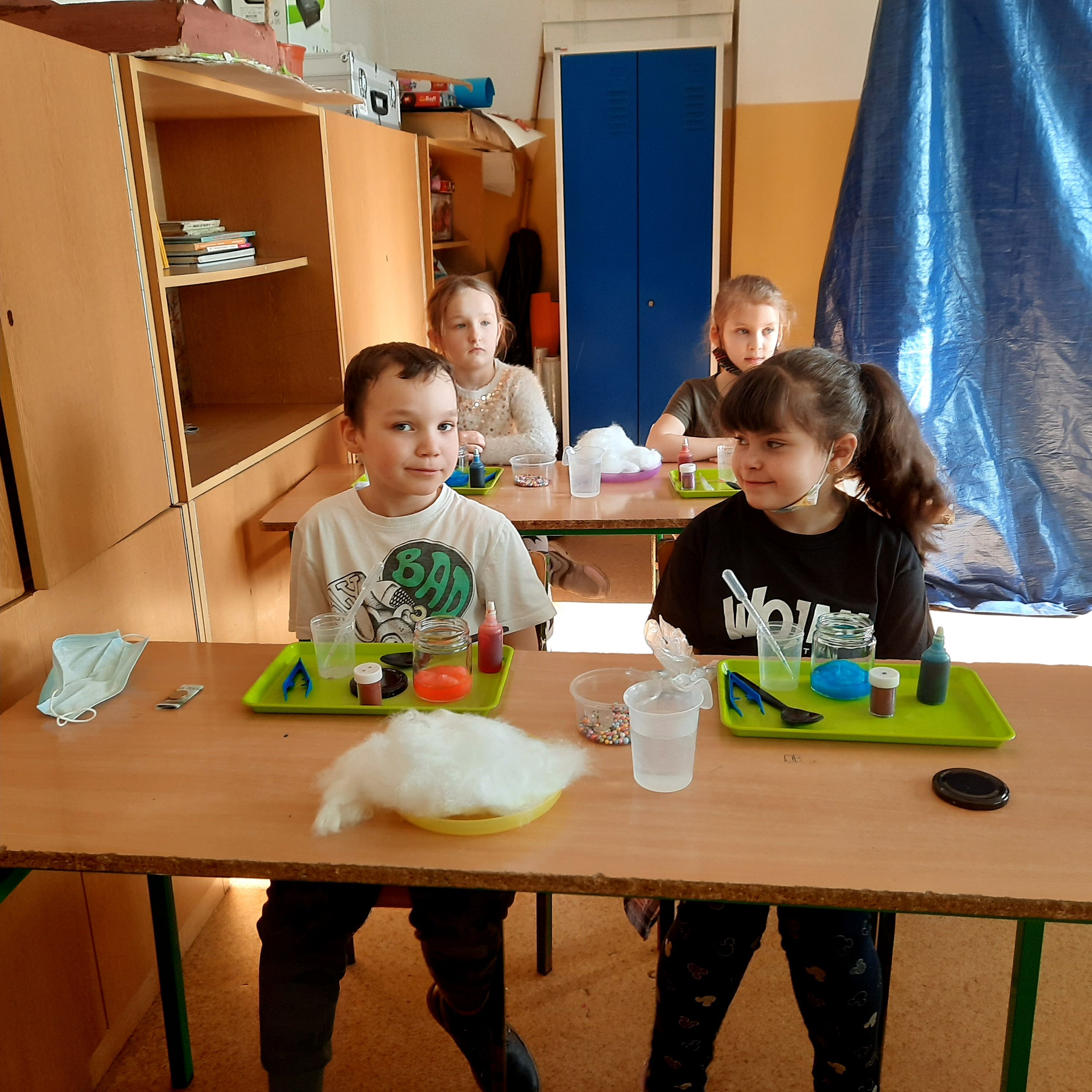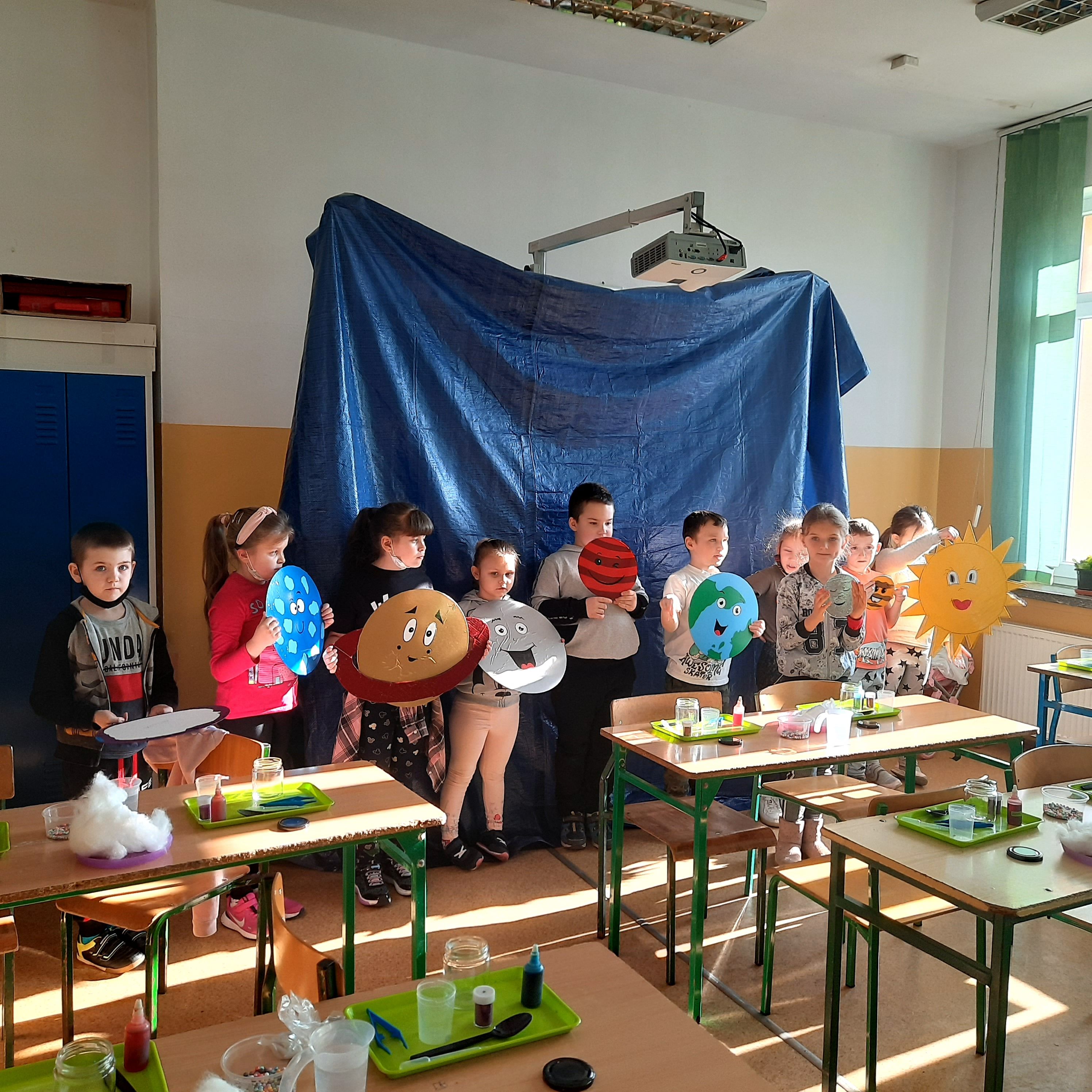 Na fotografii stoją uczniowie na tle niebieskiej płachty każdy z nich trzyma w rękach planetę w takiej kolejności w jakiej występują one w Układzie Słonecznym. Na zdjęciu widać uczniów siedzących przy ławkach, przed nimi leżą przygotowane tace z przyborami do wykonania kosmosu w słoiczku. Na zdjęciu widać uczniów klasy pierwszej, na ich ławkach widać tace z barwnikami, watą, pipetami, słoikami i innymi przyborami potrzebnymi na warsztatach.