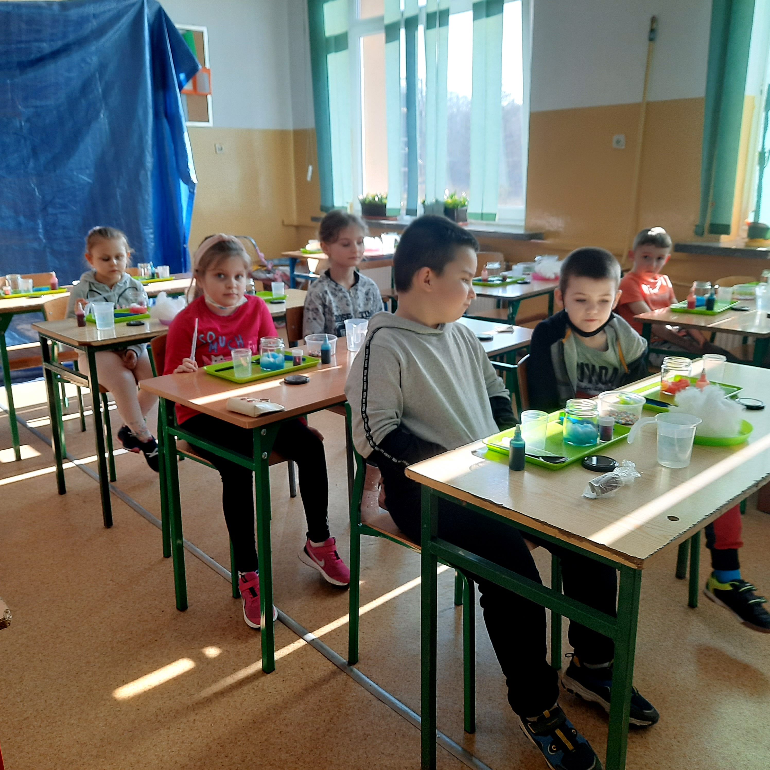 Na fotografii uczniowie klasy drugiej oraz trzeciej biorą udział w prowadzonych warsztatach, na ich stołach znajdują się niezbędne przybory do wykonania eksperymentów. Na zdjęciu widać uczniów klas 1-3, którzy przystępują do rozpoczęcia warsztatów. Na ich ławkach przygotowane są przybory do przeprowadzenia doświadczeń.