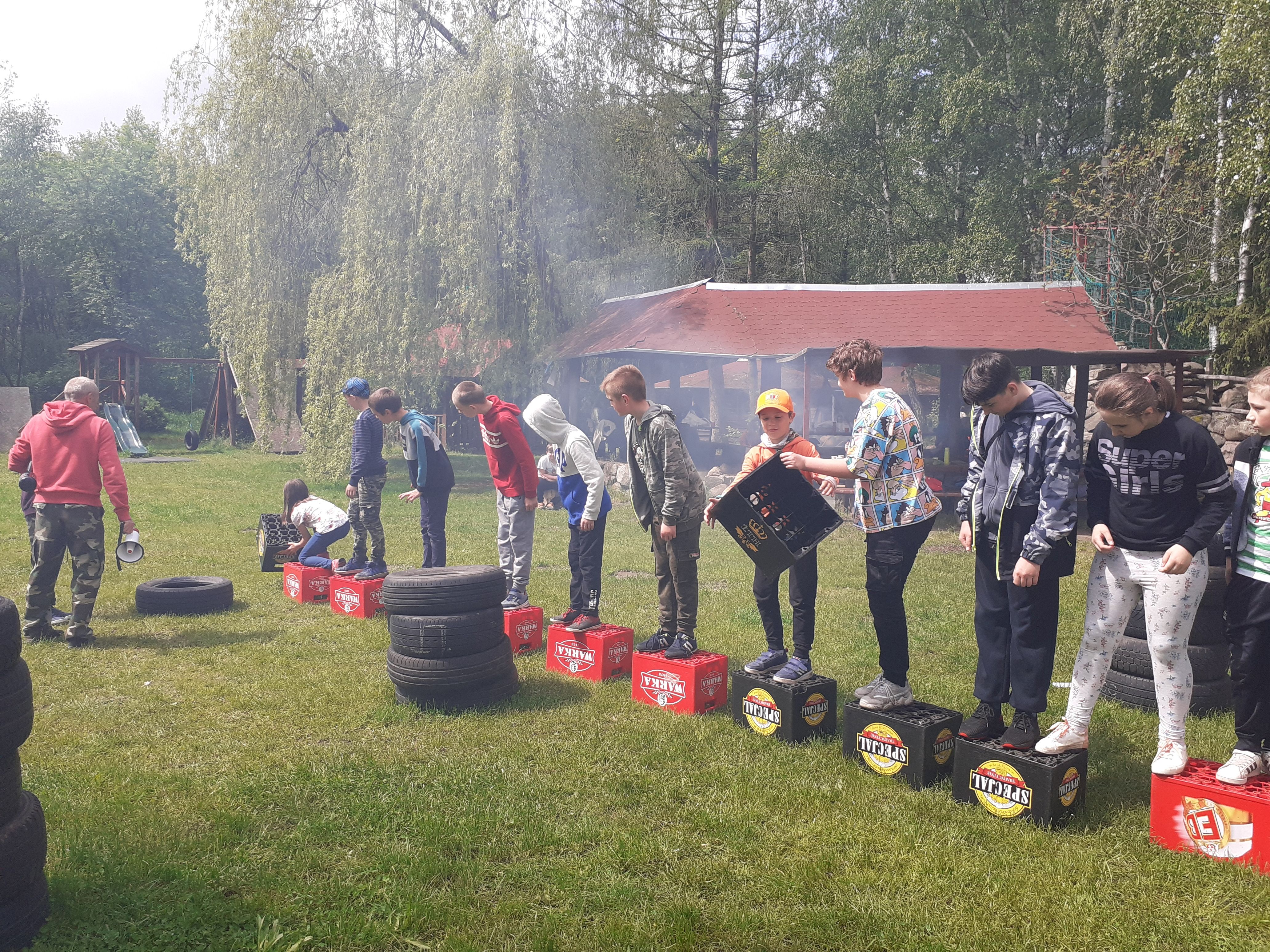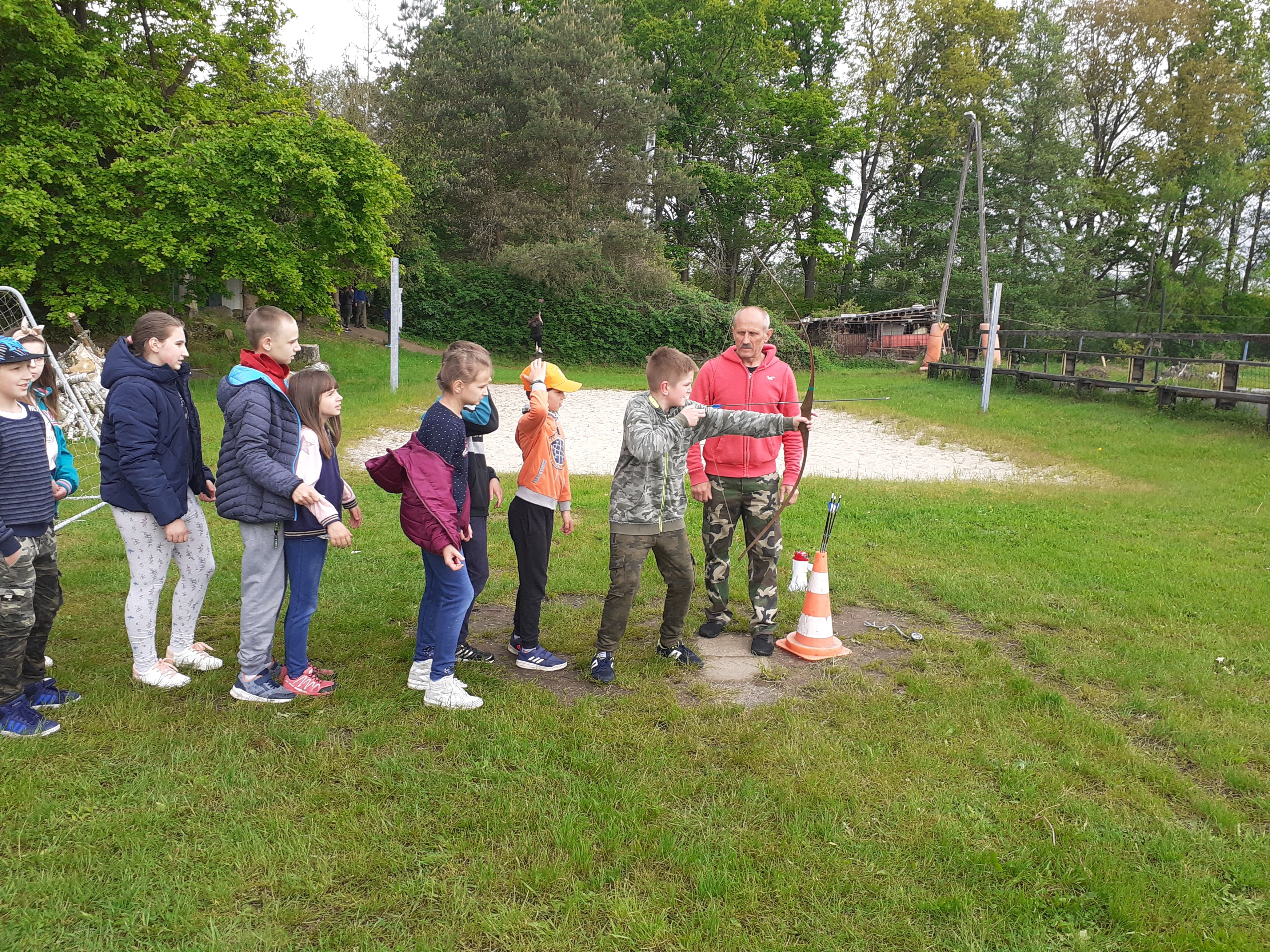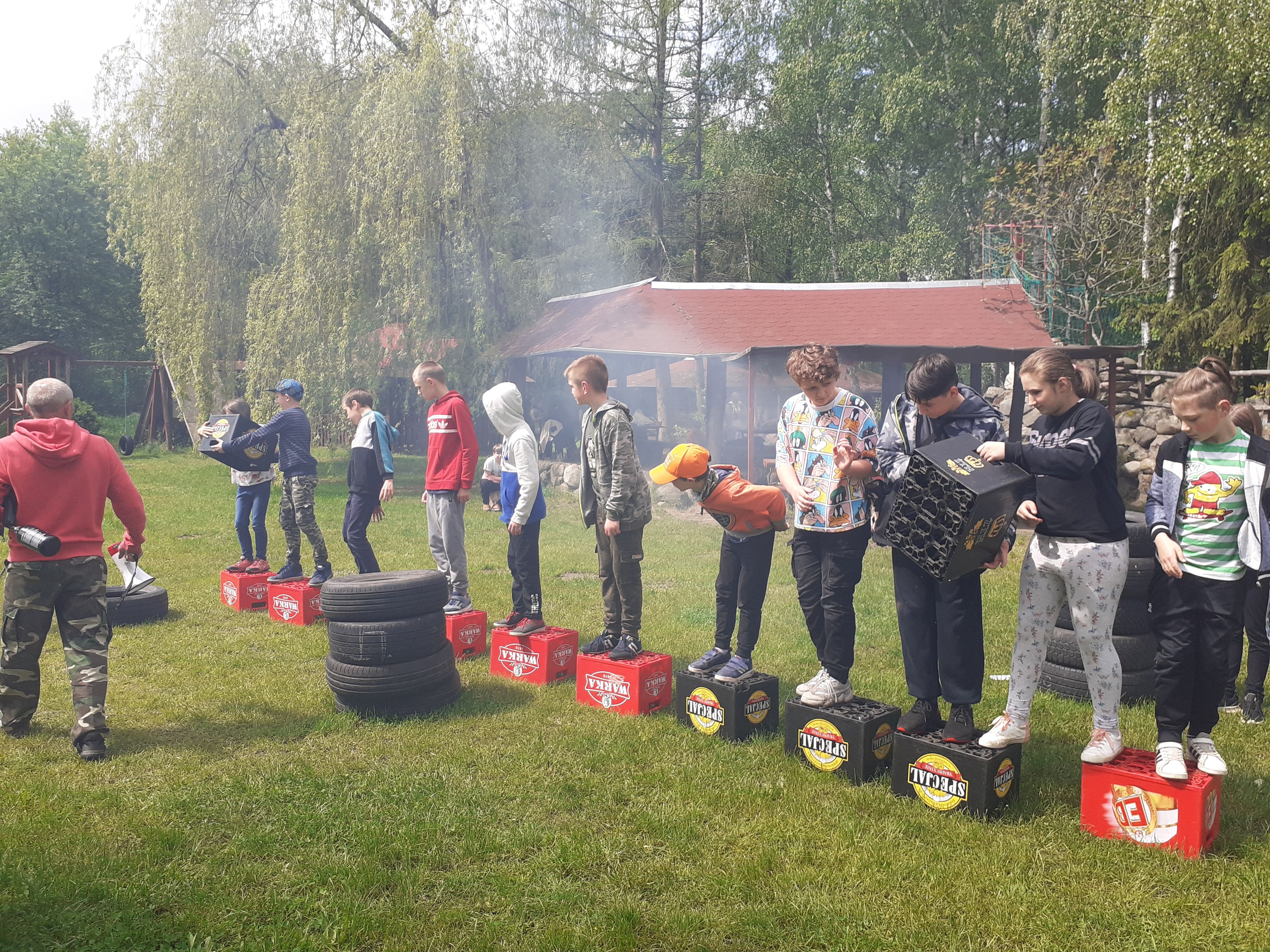 grupa dzieci rzuca rzutkami do balonów grupa uczniów oczekuje w kolejce do strzelania z łuku grupa uczniów obserwuje kolegę strzelającego z wiatrówki grupa dzieci stoi na skrzynkach uczniowie przechodzą po skrzynkach tak aby nie upaść na ziemię uczniowie stojący na skrzynkach podają sobie kolejne aby przejść jak najdalej zdjęcie przedstawia ucznia w stroju moro i wojskowym hełmie