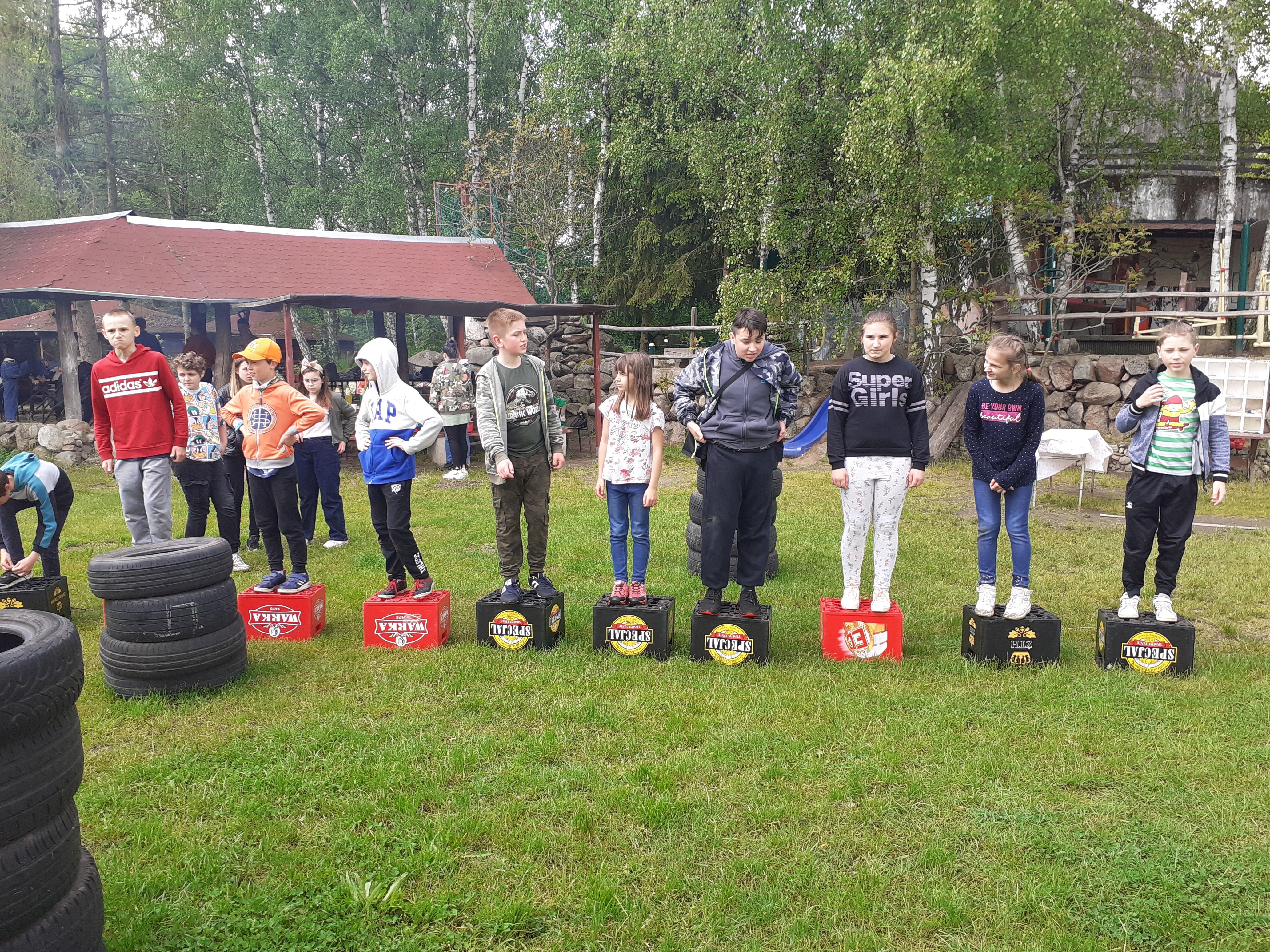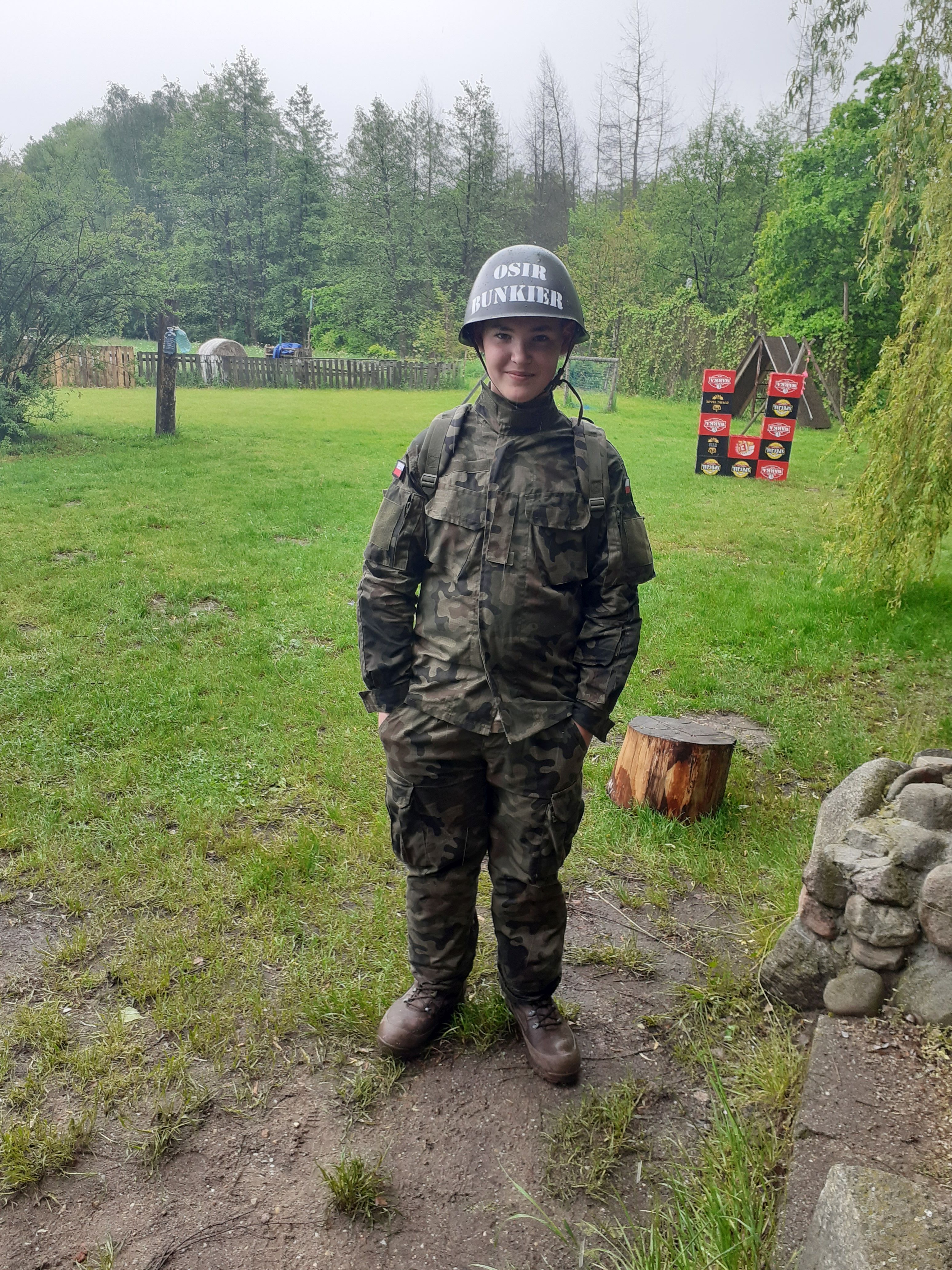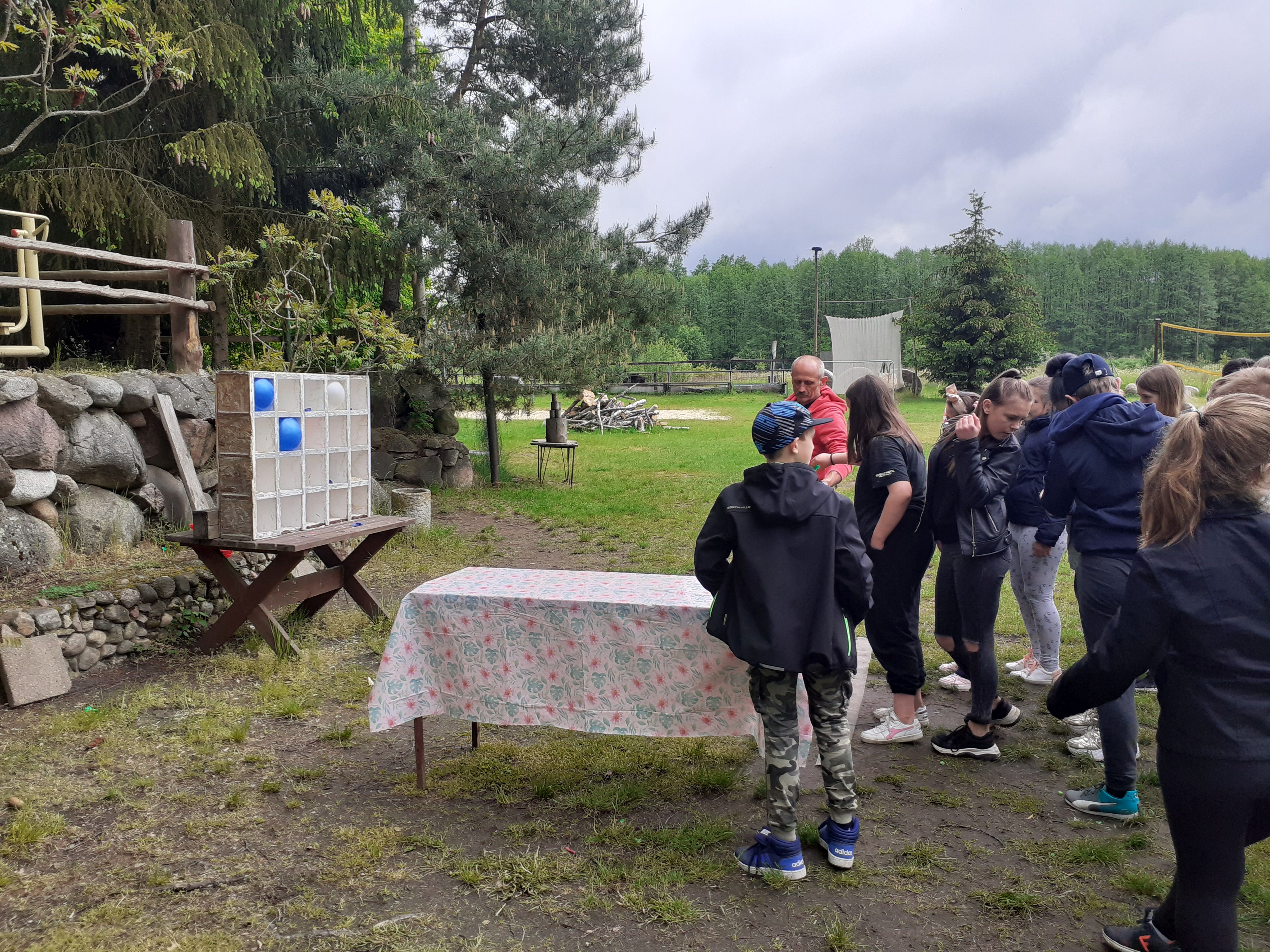 grupa dzieci rzuca rzutkami do balonów grupa uczniów oczekuje w kolejce do strzelania z łuku grupa uczniów obserwuje kolegę strzelającego z wiatrówki grupa dzieci stoi na skrzynkach uczniowie przechodzą po skrzynkach tak aby nie upaść na ziemię uczniowie stojący na skrzynkach podają sobie kolejne aby przejść jak najdalej zdjęcie przedstawia ucznia w stroju moro i wojskowym hełmie