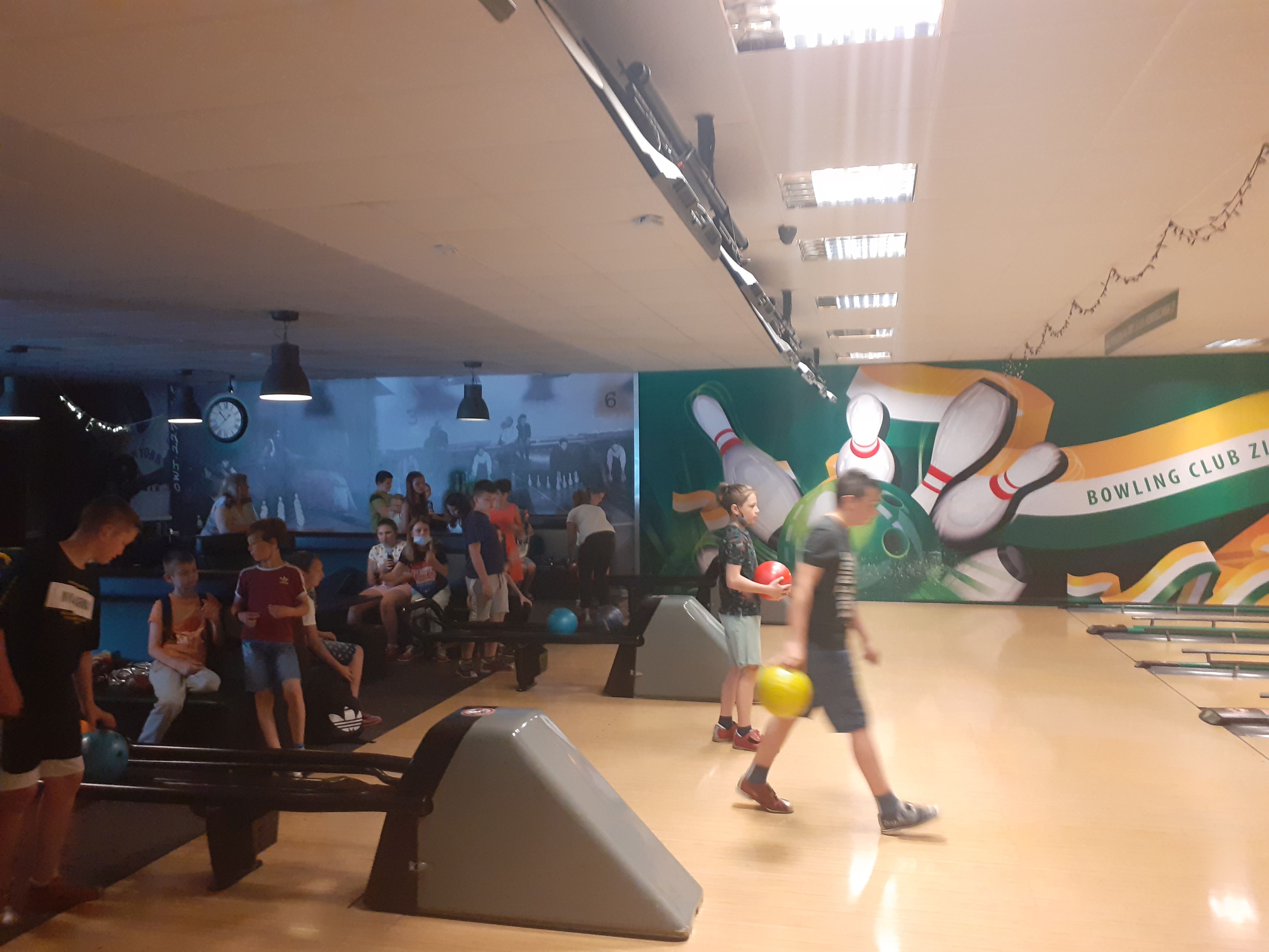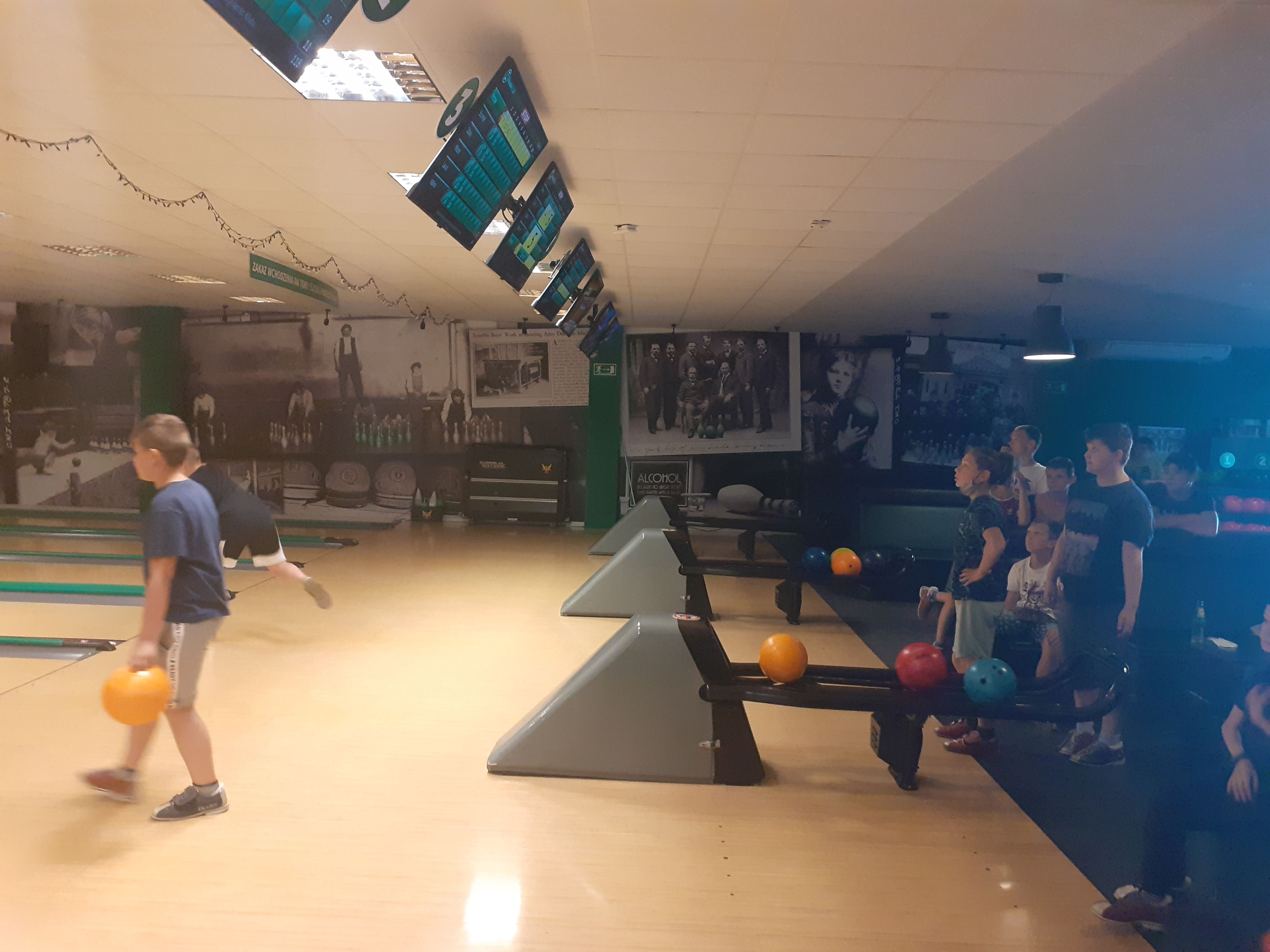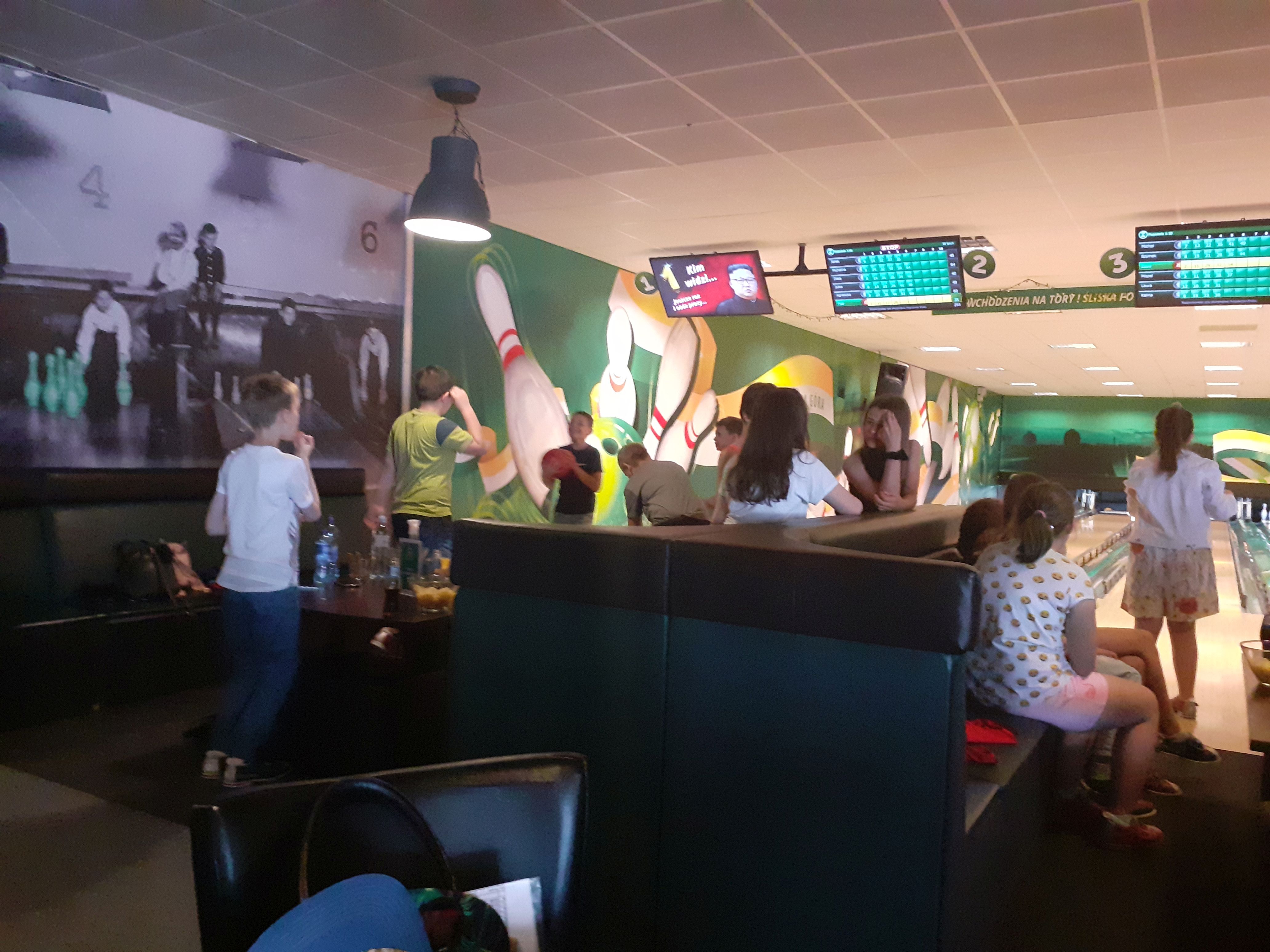 grupa uczniów na kręgielni przygotowuje się do pchnięcia kulą chłopiec udaje się z kulą na swój pas chłopiec przygotowuje się do strącenia kręgli chłopiec wchodzi z kulą na swoje stanowisko chłopiec z kulą w dłoni na swoim pasie do gry uczniowie na kanapach obserwują grę kolegów uczniowie dopingują ze strefy przy stolikach swoich kolegów