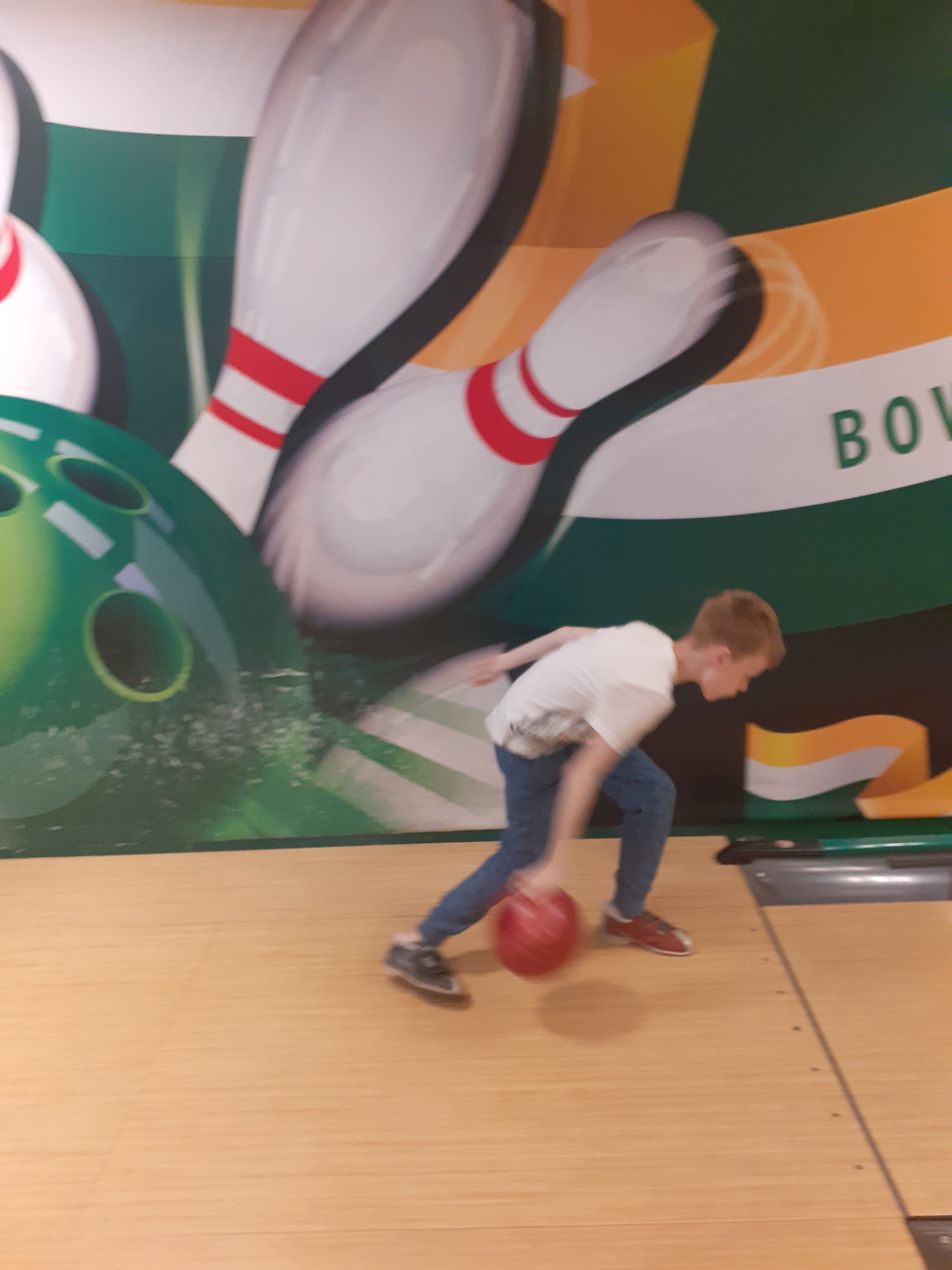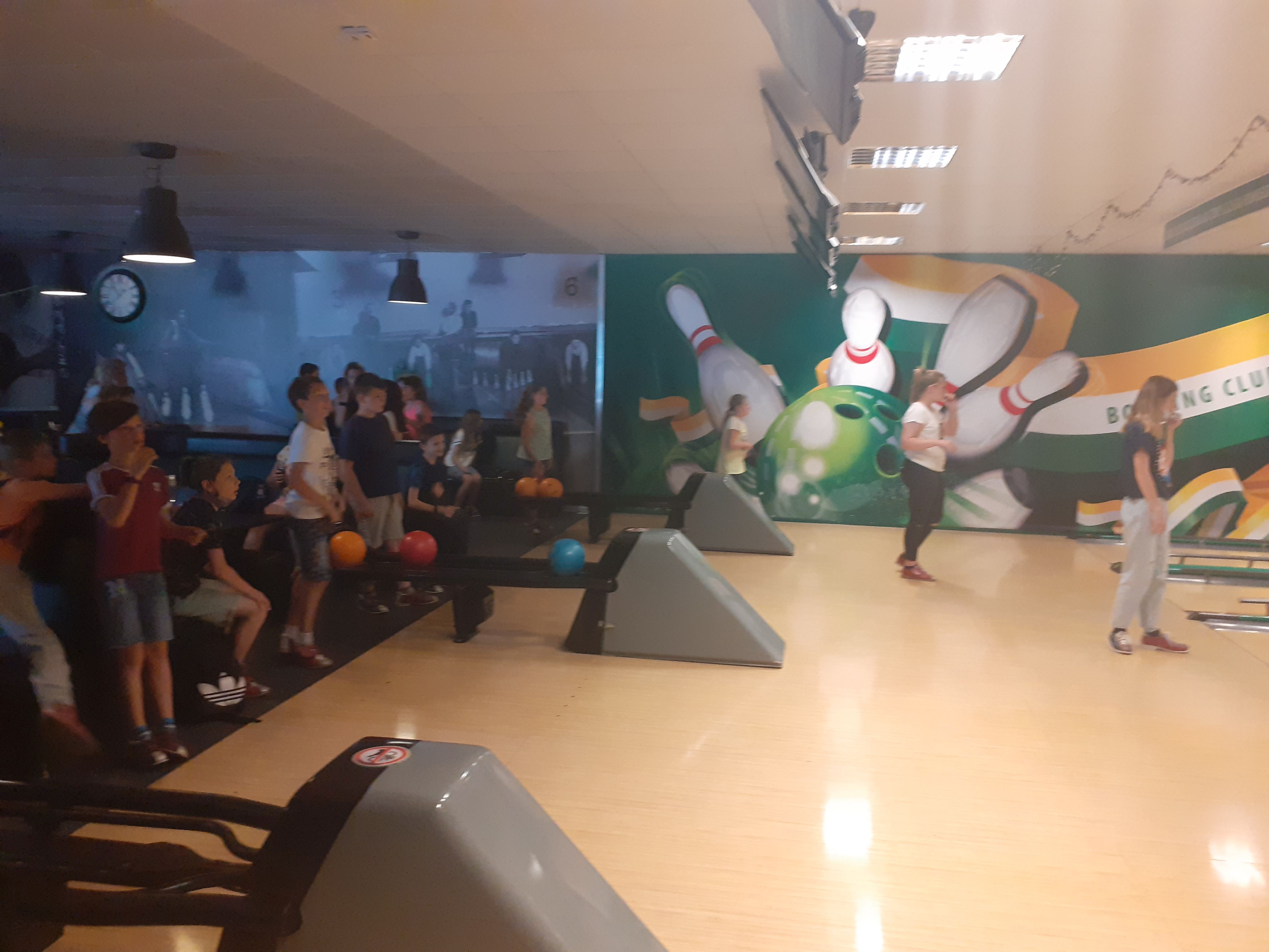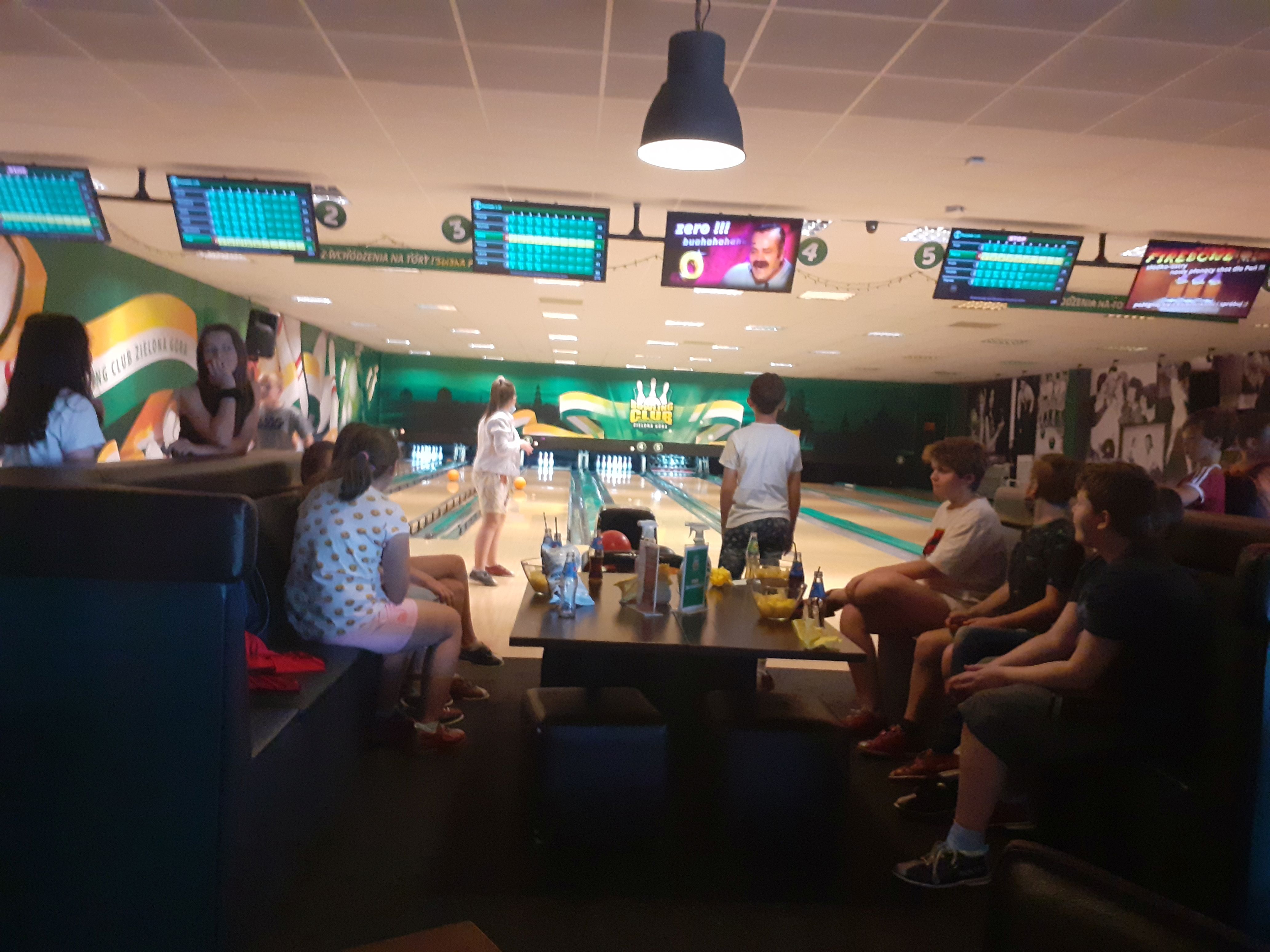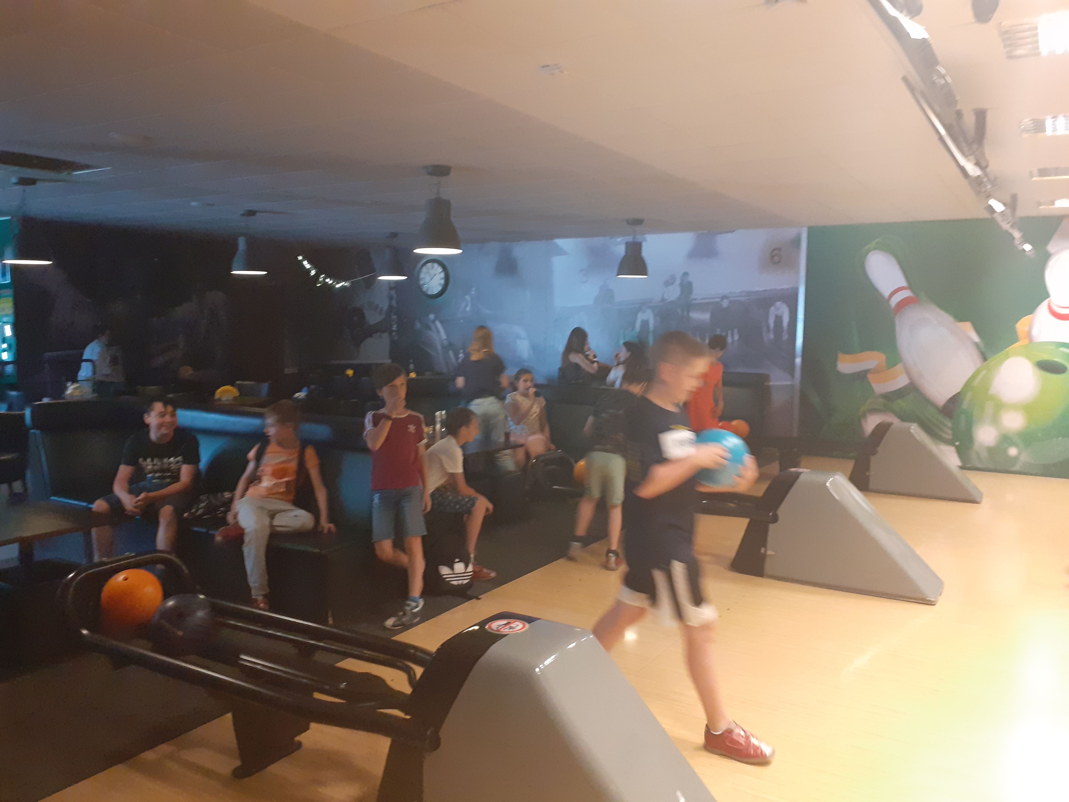 grupa uczniów na kręgielni przygotowuje się do pchnięcia kulą chłopiec udaje się z kulą na swój pas chłopiec przygotowuje się do strącenia kręgli chłopiec wchodzi z kulą na swoje stanowisko chłopiec z kulą w dłoni na swoim pasie do gry uczniowie na kanapach obserwują grę kolegów uczniowie dopingują ze strefy przy stolikach swoich kolegów