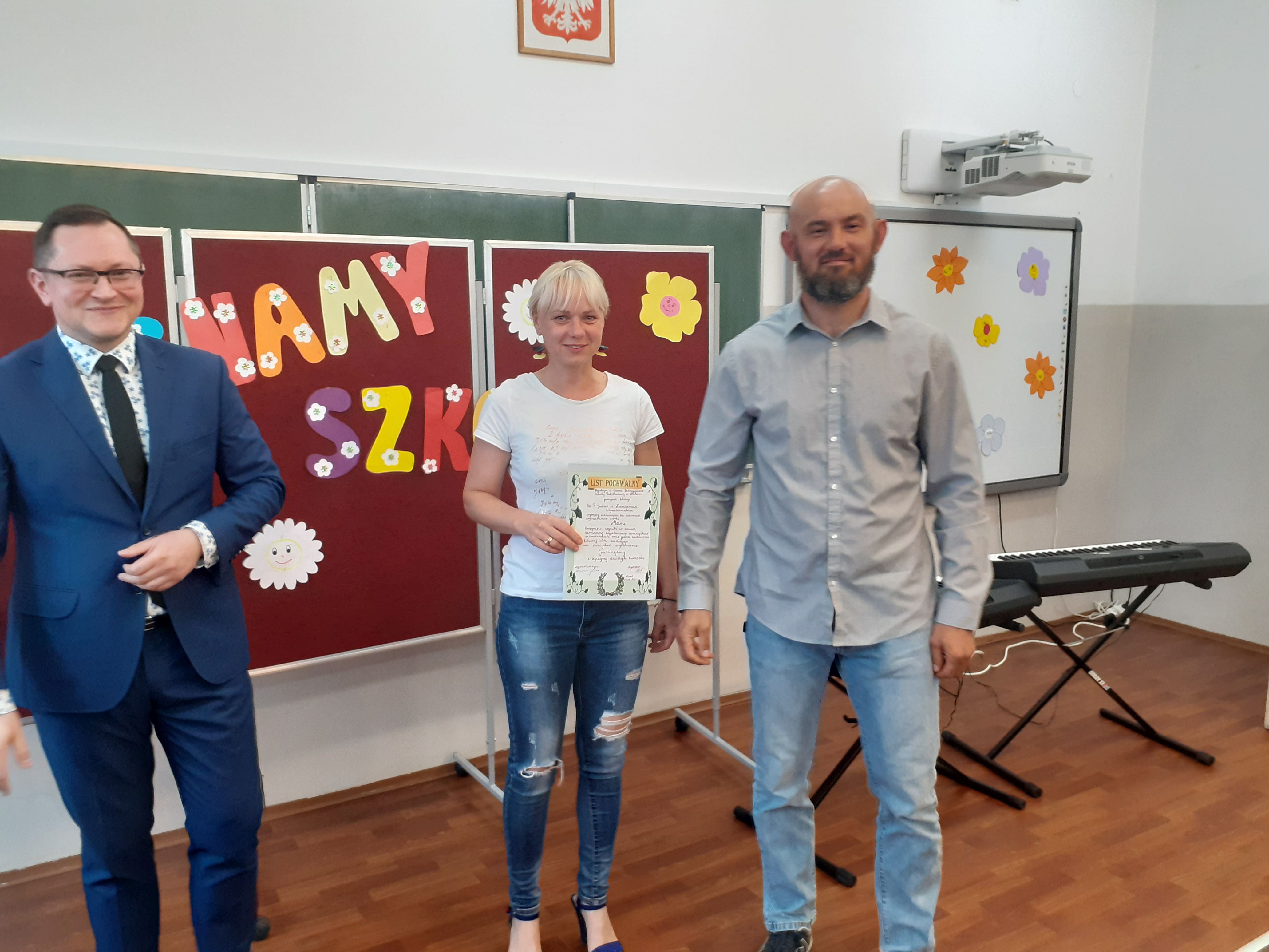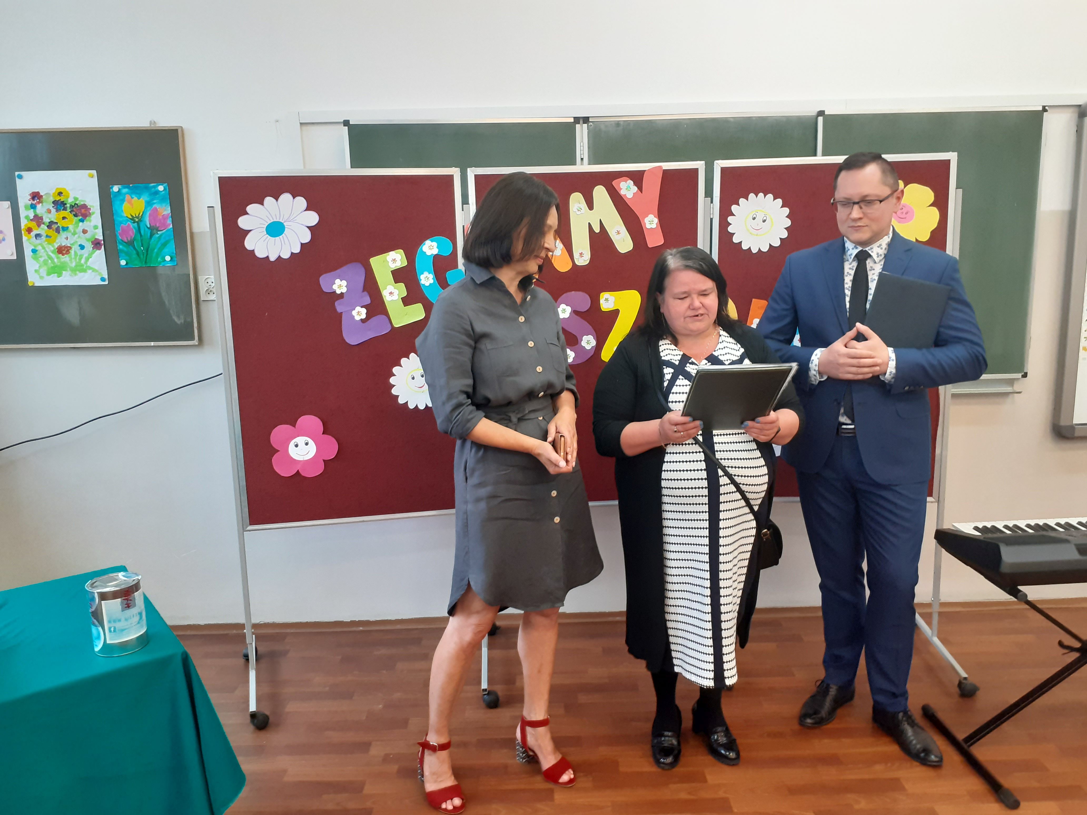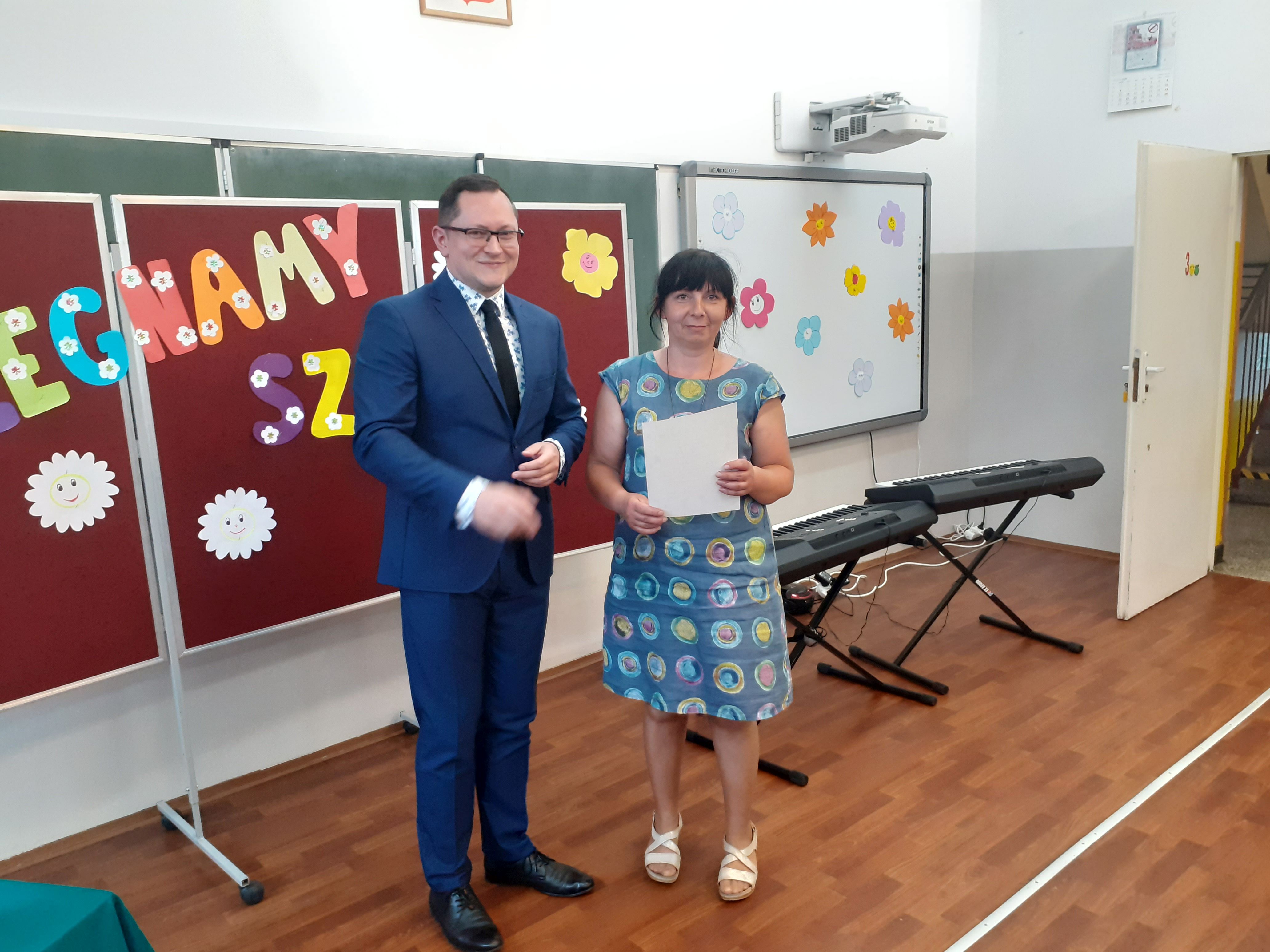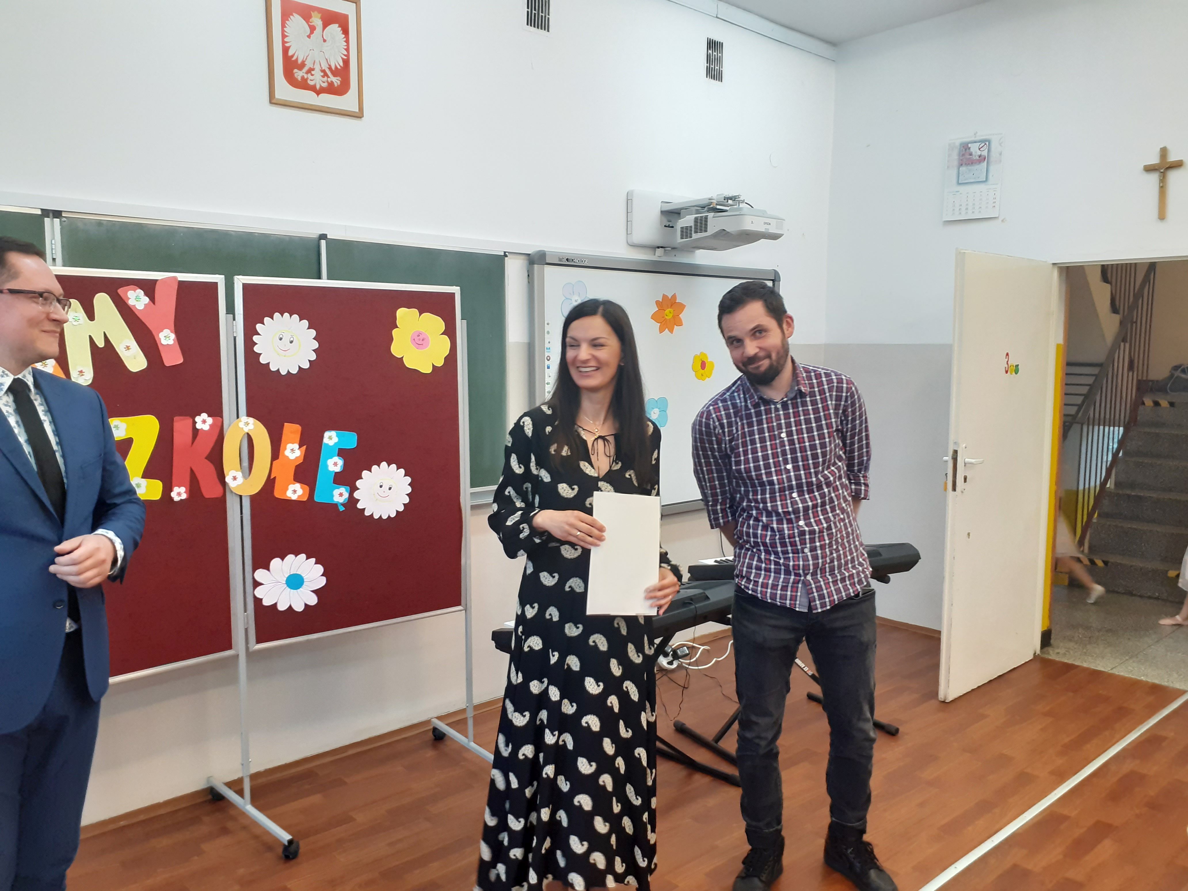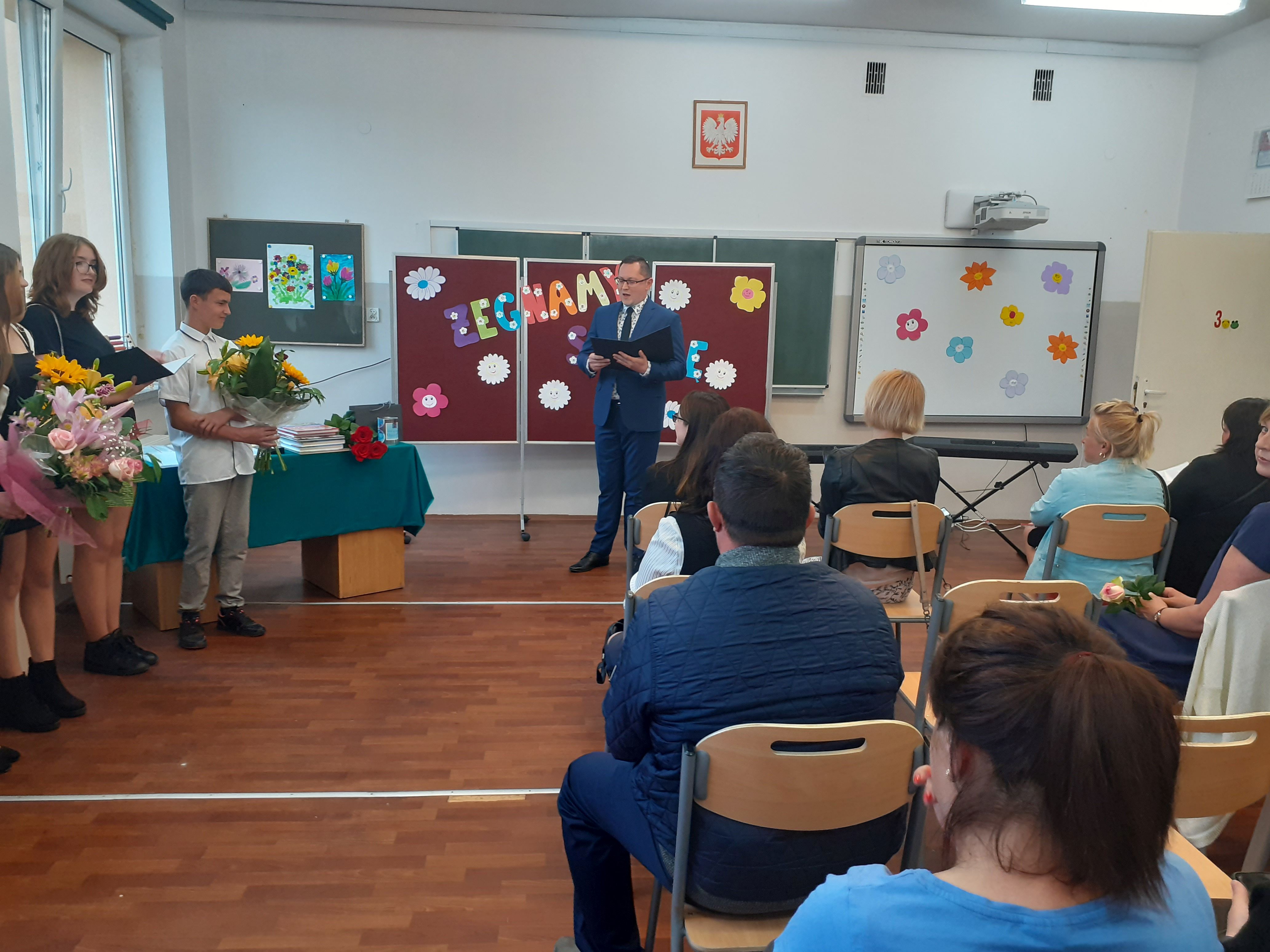 Głos zabrał także Dyrektor szkoły, który wręczył statuetkę szkolnego lidera Maciejowi oraz podziękowania dla rodziców, wychowawczyni, przedstawicielka Klasowej Rady Rodziców oraz reprezentantka klasy. Ósmoklasiści podziękowali nauczycielom, a klasa siódma wręczyła absolwentom tradycyjne pożegnalne upominki.