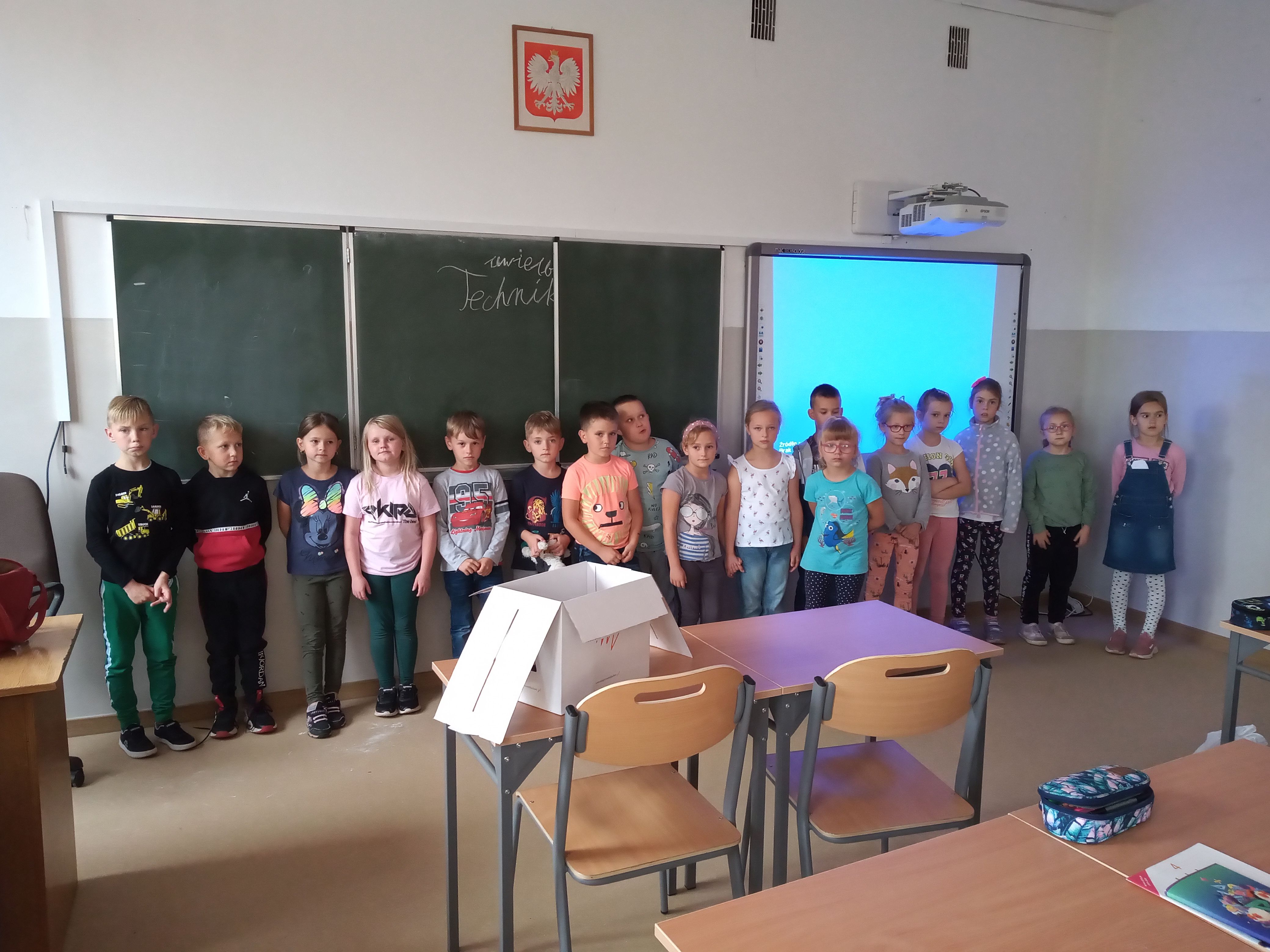 W sali lekcyjnej grupa uczniów klasy pierwszej. Uczniowie klasy pierwszej podchodzą do nauczyciela i z kartonowego pudełka losują zakładki do książek. Pierwszaki oglądają wylosowane przez siebie zakładki.