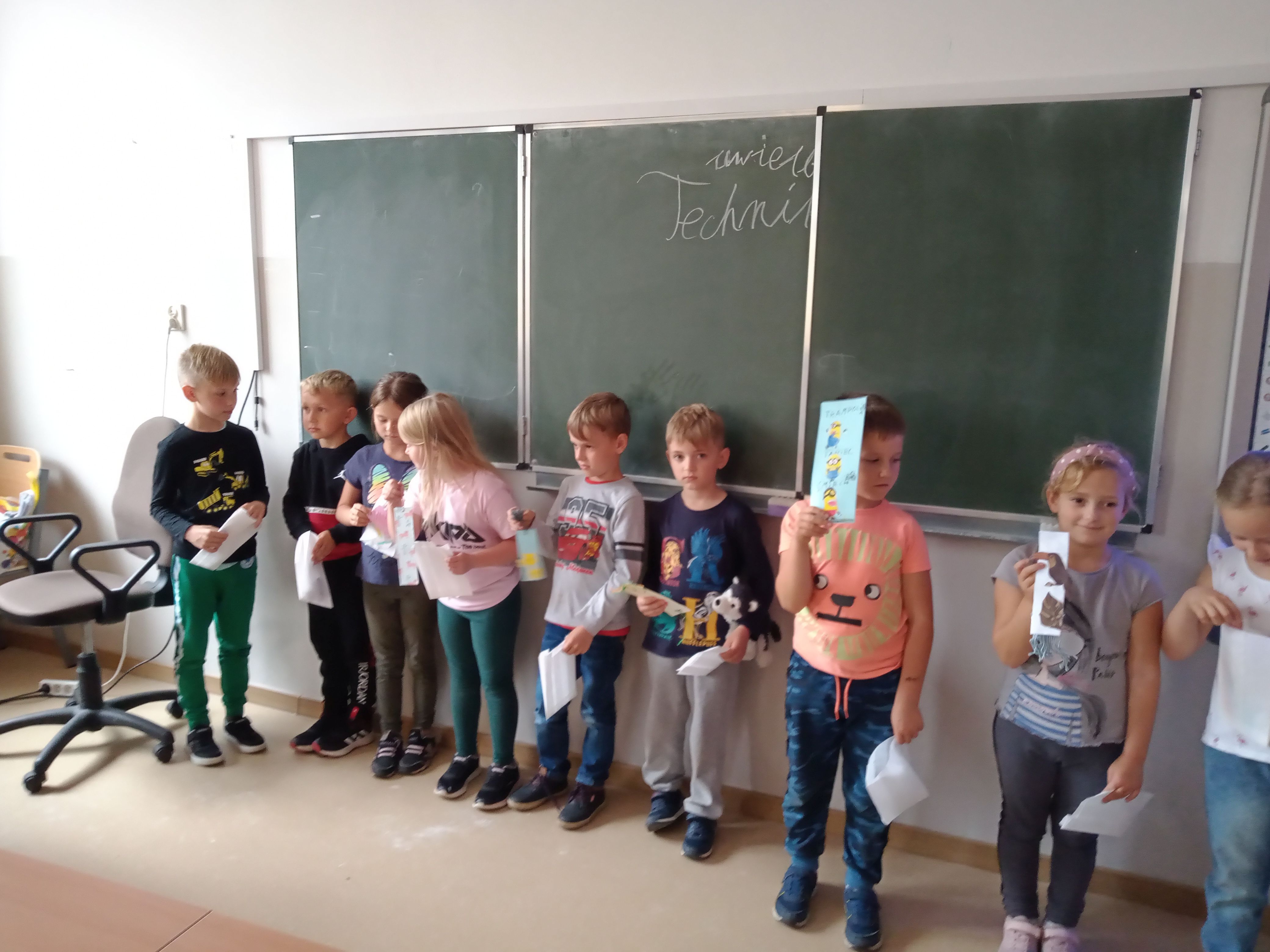 Uczniowie klasy piątej i klasy czwartej wykonali dla swoich młodszych kolegów i koleżanek z klasy pierwszej zakładki do książek. Tym przyjaznym gestem przywitali pierwszaków w gronie społeczności uczniowskiej. Dodali im otuchy i odwagi, zapewniając pomoc koleżeńską.